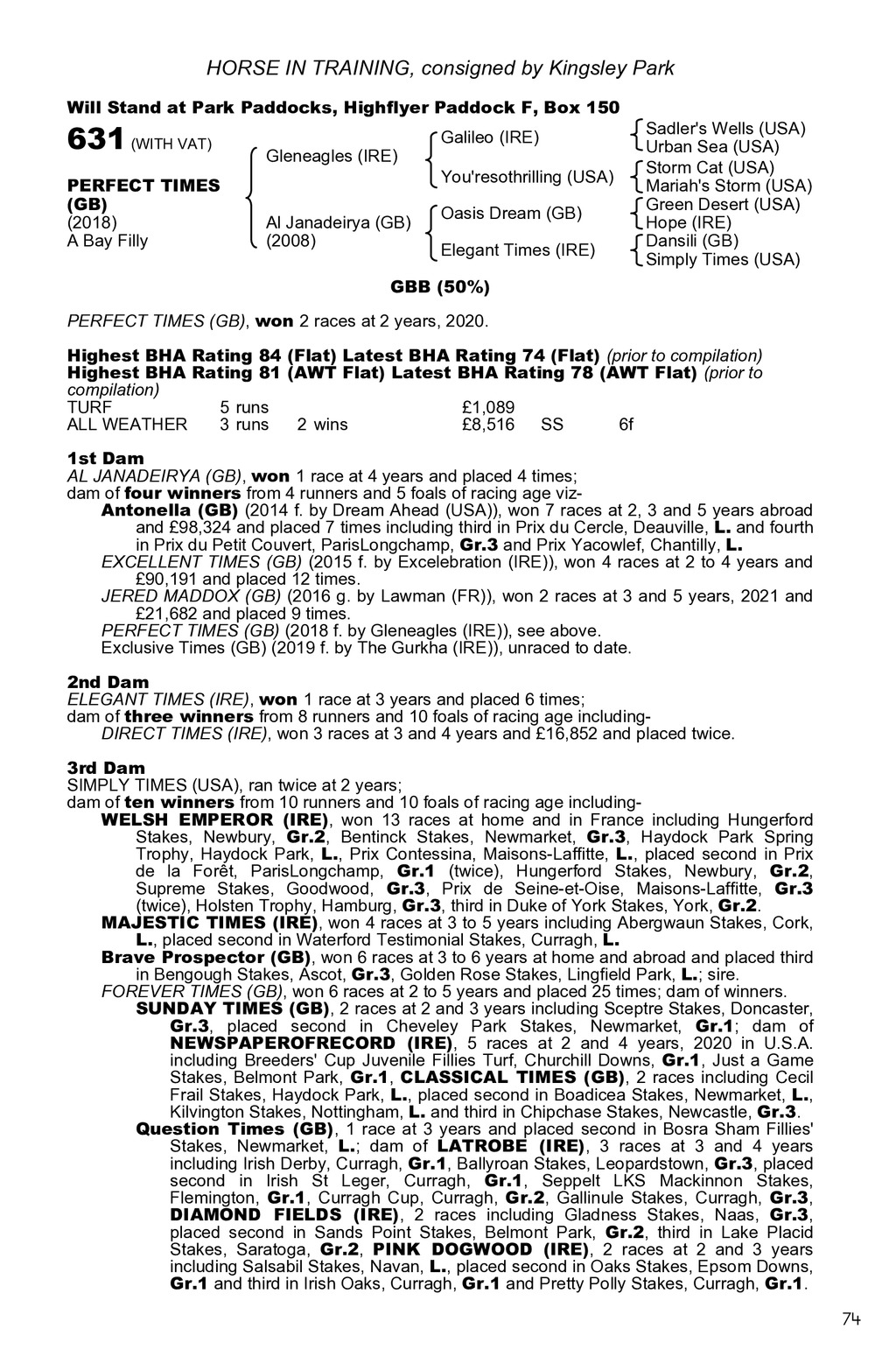 HORSE IN TRAINING, consigned by Kingsley Park Will Stand at Park Paddocks, Highflyer Paddock F, Box 150 631 (WITH VAT) PERFECT TIMES (GB) (2018) A Bay Filly Gleneagles (IRE) Galileo (IRE) You resothrilling (USA) Al Janadeirya (GB) (2008) Oasis Dream (GB) Elegant Times (IRE) Sadler s Wells (USA) Urban Sea (USA) Storm Cat (USA) Mariah s Storm (USA) Green Desert (USA) Hope (IRE) Dansili (GB) Simply Times (USA) GBB (50%) PERFECT TIMES (GB), won 2 races at 2 years, 2020. Highest BHA Rating 84 (Flat) Latest BHA Rating 74 (Flat) (prior to compilation) Highest BHA Rating 81 (AWT Flat) Latest BHA Rating 78 (AWT Flat) (prior to compilation) TURF 5 runs 1,089 ALL WEATHER 3 runs 2 wins 8,516 SS 6f 1st Dam AL JANADEIRYA (GB), won 1 race at 4 years and placed 4 times; dam of four winners from 4 runners and 5 foals of racing age vizAntonella (GB) (2014 f. by Dream Ahead (USA)), won 7 races at 2, 3 and 5 years abroad and 98,324 and placed 7 times including third in Prix du Cercle, Deauville, L. and fourth in Prix du Petit Couvert, ParisLongchamp, Gr.3 and Prix Yacowlef, Chantilly, L. EXCELLENT TIMES (GB) (2015 f. by Excelebration (IRE)), won 4 races at 2 to 4 years and 90,191 and placed 12 times. JERED MADDOX (GB) (2016 g. by Lawman (FR)), won 2 races at 3 and 5 years, 2021 and 21,682 and placed 9 times. PERFECT TIMES (GB) (2018 f. by Gleneagles (IRE)), see above. Exclusive Times (GB) (2019 f. by The Gurkha (IRE)), unraced to date. 2nd Dam ELEGANT TIMES (IRE), won 1 race at 3 years and placed 6 times; dam of three winners from 8 runners and 10 foals of racing age includingDIRECT TIMES (IRE), won 3 races at 3 and 4 years and 16,852 and placed twice. 3rd Dam SIMPLY TIMES (USA), ran twice at 2 years; dam of ten winners from 10 runners and 10 foals of racing age includingWELSH EMPEROR (IRE), won 13 races at home and in France including Hungerford Stakes, Newbury, Gr.2, Bentinck Stakes, Newmarket, Gr.3, Haydock Park Spring Trophy, Haydock Park, L., Prix Contessina, Maisons-Laffitte, L., placed second in Prix de la Fort, ParisLongchamp, Gr.1 (twice), Hungerford Stakes, Newbury, Gr.2, Supreme Stakes, Goodwood, Gr.3, Prix de Seine-et-Oise, Maisons-Laffitte, Gr.3 (twice), Holsten Trophy, Hamburg, Gr.3, third in Duke of York Stakes, York, Gr.2. MAJESTIC TIMES (IRE), won 4 races at 3 to 5 years including Abergwaun Stakes, Cork, L., placed second in Waterford Testimonial Stakes, Curragh, L. Brave Prospector (GB), won 6 races at 3 to 6 years at home and abroad and placed third in Bengough Stakes, Ascot, Gr.3, Golden Rose Stakes, Lingfield Park, L.; sire. FOREVER TIMES (GB), won 6 races at 2 to 5 years and placed 25 times; dam of winners. SUNDAY TIMES (GB), 2 races at 2 and 3 years including Sceptre Stakes, Doncaster, Gr.3, placed second in Cheveley Park Stakes, Newmarket, Gr.1; dam of NEWSPAPEROFRECORD (IRE), 5 races at 2 and 4 years, 2020 in U.S.A. including Breeders Cup Juvenile Fillies Turf, Churchill Downs, Gr.1, Just a Game Stakes, Belmont Park, Gr.1, CLASSICAL TIMES (GB), 2 races including Cecil Frail Stakes, Haydock Park, L., placed second in Boadicea Stakes, Newmarket, L., Kilvington Stakes, Nottingham, L. and third in Chipchase Stakes, Newcastle, Gr.3. Question Times (GB), 1 race at 3 years and placed second in Bosra Sham Fillies Stakes, Newmarket, L.; dam of LATROBE (IRE), 3 races at 3 and 4 years including Irish Derby, Curragh, Gr.1, Ballyroan Stakes, Leopardstown, Gr.3, placed second in Irish St Leger, Curragh, Gr.1, Seppelt LKS Mackinnon Stakes, Flemington, Gr.1, Curragh Cup, Curragh, Gr.2, Gallinule Stakes, Curragh, Gr.3, DIAMOND FIELDS (IRE), 2 races including Gladness Stakes, Naas, Gr.3, placed second in Sands Point Stakes, Belmont Park, Gr.2, third in Lake Placid Stakes, Saratoga, Gr.2, PINK DOGWOOD (IRE), 2 races at 2 and 3 years including Salsabil Stakes, Navan, L., placed second in Oaks Stakes, Epsom Downs, Gr.1 and third in Irish Oaks, Curragh, Gr.1 and Pretty Polly Stakes, Curragh, Gr.1. 74