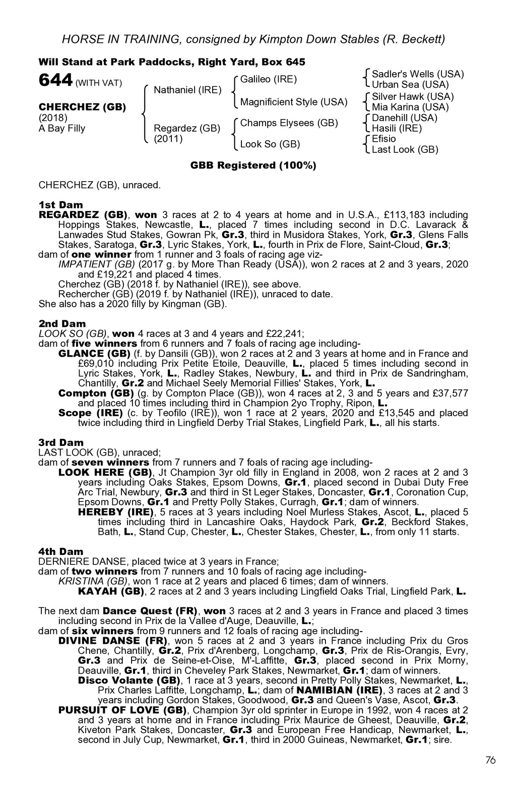 HORSE IN TRAINING, consigned by Kimpton Down Stables (R. Beckett) Will Stand at Park Paddocks, Right Yard, Box 645 644 (WITH VAT) CHERCHEZ (GB) (2018) A Bay Filly Nathaniel (IRE) Galileo (IRE) Magnificient Style (USA) Regardez (GB) (2011) Champs Elysees (GB) Look So (GB) Sadler s Wells (USA) Urban Sea (USA) Silver Hawk (USA) Mia Karina (USA) Danehill (USA) Hasili (IRE) Efisio Last Look (GB) GBB Registered (100%) CHERCHEZ (GB), unraced. 1st Dam REGARDEZ (GB), won 3 races at 2 to 4 years at home and in U.S.A., 113,183 including Hoppings Stakes, Newcastle, L., placed 7 times including second in D.C. Lavarack & Lanwades Stud Stakes, Gowran Pk, Gr.3, third in Musidora Stakes, York, Gr.3, Glens Falls Stakes, Saratoga, Gr.3, Lyric Stakes, York, L., fourth in Prix de Flore, Saint-Cloud, Gr.3; dam of one winner from 1 runner and 3 foals of racing age vizIMPATIENT (GB) (2017 g. by More Than Ready (USA)), won 2 races at 2 and 3 years, 2020 and 19,221 and placed 4 times. Cherchez (GB) (2018 f. by Nathaniel (IRE)), see above. Rechercher (GB) (2019 f. by Nathaniel (IRE)), unraced to date. She also has a 2020 filly by Kingman (GB). 2nd Dam LOOK SO (GB), won 4 races at 3 and 4 years and 22,241; dam of five winners from 6 runners and 7 foals of racing age includingGLANCE (GB) (f. by Dansili (GB)), won 2 races at 2 and 3 years at home and in France and 69,010 including Prix Petite Etoile, Deauville, L., placed 5 times including second in Lyric Stakes, York, L., Radley Stakes, Newbury, L. and third in Prix de Sandringham, Chantilly, Gr.2 and Michael Seely Memorial Fillies Stakes, York, L. Compton (GB) (g. by Compton Place (GB)), won 4 races at 2, 3 and 5 years and 37,577 and placed 10 times including third in Champion 2yo Trophy, Ripon, L. Scope (IRE) (c. by Teofilo (IRE)), won 1 race at 2 years, 2020 and 13,545 and placed twice including third in Lingfield Derby Trial Stakes, Lingfield Park, L., all his starts. 3rd Dam LAST LOOK (GB), unraced; dam of seven winners from 7 runners and 7 foals of racing age includingLOOK HERE (GB), Jt Champion 3yr old filly in England in 2008, won 2 races at 2 and 3 years including Oaks Stakes, Epsom Downs, Gr.1, placed second in Dubai Duty Free Arc Trial, Newbury, Gr.3 and third in St Leger Stakes, Doncaster, Gr.1, Coronation Cup, Epsom Downs, Gr.1 and Pretty Polly Stakes, Curragh, Gr.1; dam of winners. HEREBY (IRE), 5 races at 3 years including Noel Murless Stakes, Ascot, L., placed 5 times including third in Lancashire Oaks, Haydock Park, Gr.2, Beckford Stakes, Bath, L., Stand Cup, Chester, L., Chester Stakes, Chester, L., from only 11 starts. 4th Dam DERNIERE DANSE, placed twice at 3 years in France; dam of two winners from 7 runners and 10 foals of racing age includingKRISTINA (GB), won 1 race at 2 years and placed 6 times; dam of winners. KAYAH (GB), 2 races at 2 and 3 years including Lingfield Oaks Trial, Lingfield Park, L. The next dam Dance Quest (FR), won 3 races at 2 and 3 years in France and placed 3 times including second in Prix de la Vallee d Auge, Deauville, L.; dam of six winners from 9 runners and 12 foals of racing age includingDIVINE DANSE (FR), won 5 races at 2 and 3 years in France including Prix du Gros Chene, Chantilly, Gr.2, Prix d Arenberg, Longchamp, Gr.3, Prix de Ris-Orangis, Evry, Gr.3 and Prix de Seine-et-Oise, M -Laffitte, Gr.3, placed second in Prix Morny, Deauville, Gr.1, third in Cheveley Park Stakes, Newmarket, Gr.1; dam of winners. Disco Volante (GB), 1 race at 3 years, second in Pretty Polly Stakes, Newmarket, L., Prix Charles Laffitte, Longchamp, L.; dam of NAMIBIAN (IRE), 3 races at 2 and 3 years including Gordon Stakes, Goodwood, Gr.3 and Queen s Vase, Ascot, Gr.3. PURSUIT OF LOVE (GB), Champion 3yr old sprinter in Europe in 1992, won 4 races at 2 and 3 years at home and in France including Prix Maurice de Gheest, Deauville, Gr.2, Kiveton Park Stakes, Doncaster, Gr.3 and European Free Handicap, Newmarket, L., second in July Cup, Newmarket, Gr.1, third in 2000 Guineas, Newmarket, Gr.1; sire. 76