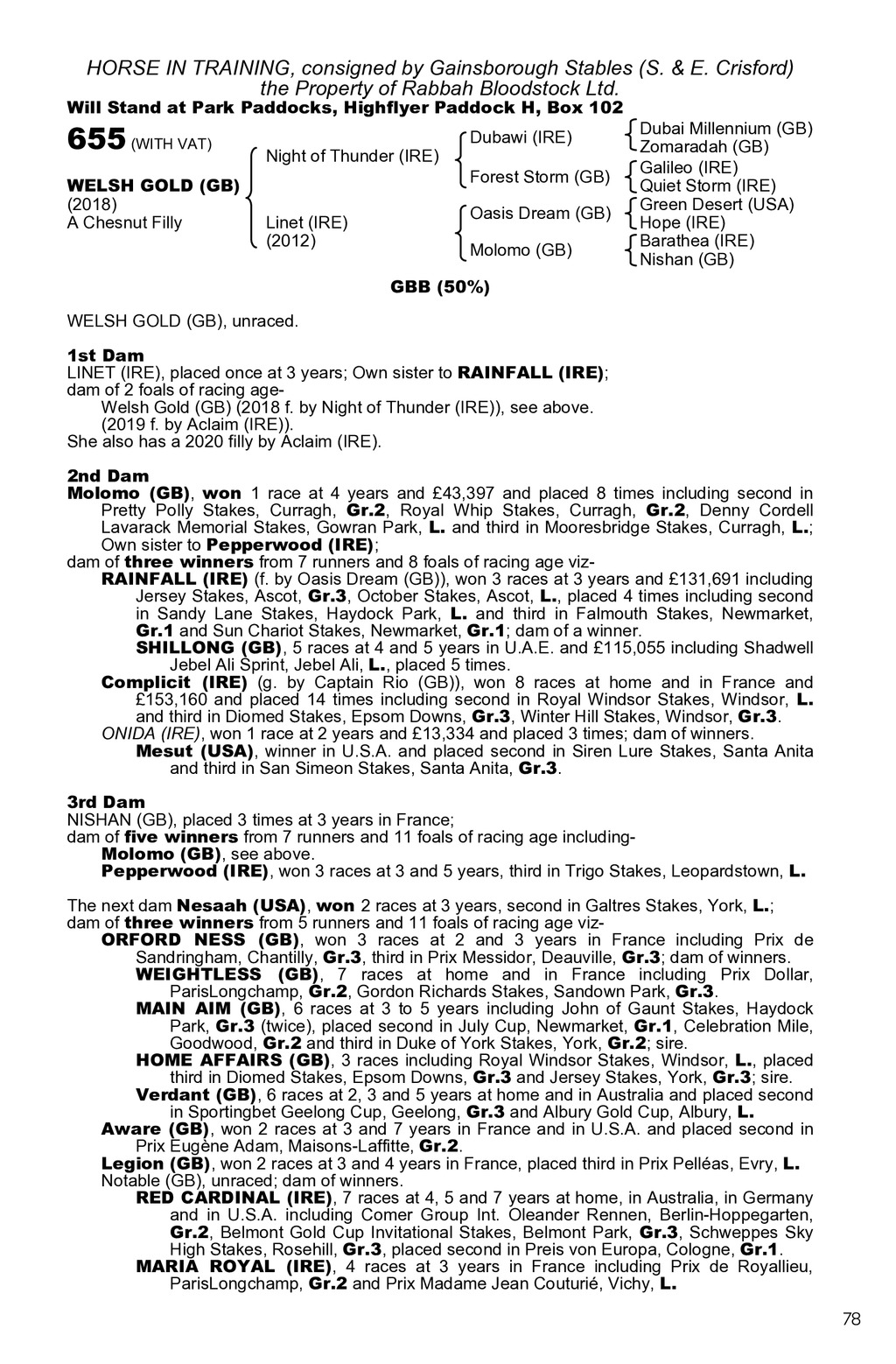 HORSE IN TRAINING, consigned by Gainsborough Stables (S. & E. Crisford) the Property of Rabbah Bloodstock Ltd. Will Stand at Park Paddocks, Highflyer Paddock H, Box 102 655 (WITH VAT) WELSH GOLD (GB) (2018) A Chesnut Filly Night of Thunder (IRE) Dubawi (IRE) Forest Storm (GB) Linet (IRE) (2012) Oasis Dream (GB) Molomo (GB) Dubai Millennium (GB) Zomaradah (GB) Galileo (IRE) Quiet Storm (IRE) Green Desert (USA) Hope (IRE) Barathea (IRE) Nishan (GB) GBB (50%) WELSH GOLD (GB), unraced. 1st Dam LINET (IRE), placed once at 3 years; Own sister to RAINFALL (IRE); dam of 2 foals of racing ageWelsh Gold (GB) (2018 f. by Night of Thunder (IRE)), see above. (2019 f. by Aclaim (IRE)). She also has a 2020 filly by Aclaim (IRE). 2nd Dam Molomo (GB), won 1 race at 4 years and 43,397 and placed 8 times including second in Pretty Polly Stakes, Curragh, Gr.2, Royal Whip Stakes, Curragh, Gr.2, Denny Cordell Lavarack Memorial Stakes, Gowran Park, L. and third in Mooresbridge Stakes, Curragh, L.; Own sister to Pepperwood (IRE); dam of three winners from 7 runners and 8 foals of racing age vizRAINFALL (IRE) (f. by Oasis Dream (GB)), won 3 races at 3 years and 131,691 including Jersey Stakes, Ascot, Gr.3, October Stakes, Ascot, L., placed 4 times including second in Sandy Lane Stakes, Haydock Park, L. and third in Falmouth Stakes, Newmarket, Gr.1 and Sun Chariot Stakes, Newmarket, Gr.1; dam of a winner. SHILLONG (GB), 5 races at 4 and 5 years in U.A.E. and 115,055 including Shadwell Jebel Ali Sprint, Jebel Ali, L., placed 5 times. Complicit (IRE) (g. by Captain Rio (GB)), won 8 races at home and in France and 153,160 and placed 14 times including second in Royal Windsor Stakes, Windsor, L. and third in Diomed Stakes, Epsom Downs, Gr.3, Winter Hill Stakes, Windsor, Gr.3. ONIDA (IRE), won 1 race at 2 years and 13,334 and placed 3 times; dam of winners. Mesut (USA), winner in U.S.A. and placed second in Siren Lure Stakes, Santa Anita and third in San Simeon Stakes, Santa Anita, Gr.3. 3rd Dam NISHAN (GB), placed 3 times at 3 years in France; dam of five winners from 7 runners and 11 foals of racing age includingMolomo (GB), see above. Pepperwood (IRE), won 3 races at 3 and 5 years, third in Trigo Stakes, Leopardstown, L. The next dam Nesaah (USA), won 2 races at 3 years, second in Galtres Stakes, York, L.; dam of three winners from 5 runners and 11 foals of racing age vizORFORD NESS (GB), won 3 races at 2 and 3 years in France including Prix de Sandringham, Chantilly, Gr.3, third in Prix Messidor, Deauville, Gr.3; dam of winners. WEIGHTLESS (GB), 7 races at home and in France including Prix Dollar, ParisLongchamp, Gr.2, Gordon Richards Stakes, Sandown Park, Gr.3. MAIN AIM (GB), 6 races at 3 to 5 years including John of Gaunt Stakes, Haydock Park, Gr.3 (twice), placed second in July Cup, Newmarket, Gr.1, Celebration Mile, Goodwood, Gr.2 and third in Duke of York Stakes, York, Gr.2; sire. HOME AFFAIRS (GB), 3 races including Royal Windsor Stakes, Windsor, L., placed third in Diomed Stakes, Epsom Downs, Gr.3 and Jersey Stakes, York, Gr.3; sire. Verdant (GB), 6 races at 2, 3 and 5 years at home and in Australia and placed second in Sportingbet Geelong Cup, Geelong, Gr.3 and Albury Gold Cup, Albury, L. Aware (GB), won 2 races at 3 and 7 years in France and in U.S.A. and placed second in Prix Eugne Adam, Maisons-Laffitte, Gr.2. Legion (GB), won 2 races at 3 and 4 years in France, placed third in Prix Pellas, Evry, L. Notable (GB), unraced; dam of winners. RED CARDINAL (IRE), 7 races at 4, 5 and 7 years at home, in Australia, in Germany and in U.S.A. including Comer Group Int. Oleander Rennen, Berlin-Hoppegarten, Gr.2, Belmont Gold Cup Invitational Stakes, Belmont Park, Gr.3, Schweppes Sky High Stakes, Rosehill, Gr.3, placed second in Preis von Europa, Cologne, Gr.1. MARIA ROYAL (IRE), 4 races at 3 years in France including Prix de Royallieu, ParisLongchamp, Gr.2 and Prix Madame Jean Couturi, Vichy, L. 78