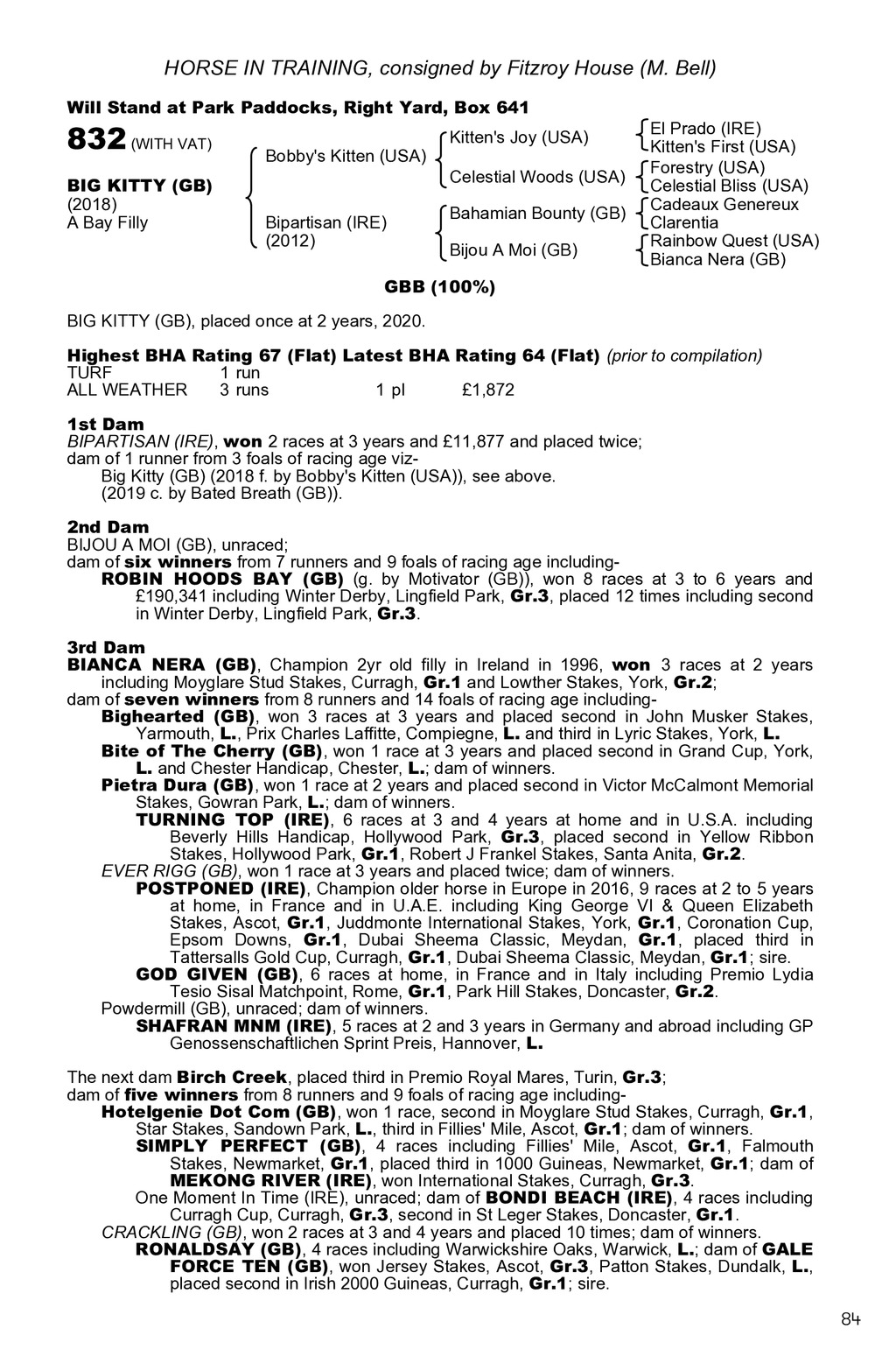 HORSE IN TRAINING, consigned by Fitzroy House (M. Bell) Will Stand at Park Paddocks, Right Yard, Box 641 832 (WITH VAT) BIG KITTY (GB) (2018) A Bay Filly Bobby s Kitten (USA) Kitten s Joy (USA) Celestial Woods (USA) Bipartisan (IRE) (2012) Bahamian Bounty (GB) Bijou A Moi (GB) El Prado (IRE) Kitten s First (USA) Forestry (USA) Celestial Bliss (USA) Cadeaux Genereux Clarentia Rainbow Quest (USA) Bianca Nera (GB) GBB (100%) BIG KITTY (GB), placed once at 2 years, 2020. Highest BHA Rating 67 (Flat) Latest BHA Rating 64 (Flat) (prior to compilation) TURF 1 run ALL WEATHER 3 runs 1 pl 1,872 1st Dam BIPARTISAN (IRE), won 2 races at 3 years and 11,877 and placed twice; dam of 1 runner from 3 foals of racing age vizBig Kitty (GB) (2018 f. by Bobby s Kitten (USA)), see above. (2019 c. by Bated Breath (GB)). 2nd Dam BIJOU A MOI (GB), unraced; dam of six winners from 7 runners and 9 foals of racing age includingROBIN HOODS BAY (GB) (g. by Motivator (GB)), won 8 races at 3 to 6 years and 190,341 including Winter Derby, Lingfield Park, Gr.3, placed 12 times including second in Winter Derby, Lingfield Park, Gr.3. 3rd Dam BIANCA NERA (GB), Champion 2yr old filly in Ireland in 1996, won 3 races at 2 years including Moyglare Stud Stakes, Curragh, Gr.1 and Lowther Stakes, York, Gr.2; dam of seven winners from 8 runners and 14 foals of racing age includingBighearted (GB), won 3 races at 3 years and placed second in John Musker Stakes, Yarmouth, L., Prix Charles Laffitte, Compiegne, L. and third in Lyric Stakes, York, L. Bite of The Cherry (GB), won 1 race at 3 years and placed second in Grand Cup, York, L. and Chester Handicap, Chester, L.; dam of winners. Pietra Dura (GB), won 1 race at 2 years and placed second in Victor McCalmont Memorial Stakes, Gowran Park, L.; dam of winners. TURNING TOP (IRE), 6 races at 3 and 4 years at home and in U.S.A. including Beverly Hills Handicap, Hollywood Park, Gr.3, placed second in Yellow Ribbon Stakes, Hollywood Park, Gr.1, Robert J Frankel Stakes, Santa Anita, Gr.2. EVER RIGG (GB), won 1 race at 3 years and placed twice; dam of winners. POSTPONED (IRE), Champion older horse in Europe in 2016, 9 races at 2 to 5 years at home, in France and in U.A.E. including King George VI & Queen Elizabeth Stakes, Ascot, Gr.1, Juddmonte International Stakes, York, Gr.1, Coronation Cup, Epsom Downs, Gr.1, Dubai Sheema Classic, Meydan, Gr.1, placed third in Tattersalls Gold Cup, Curragh, Gr.1, Dubai Sheema Classic, Meydan, Gr.1; sire. GOD GIVEN (GB), 6 races at home, in France and in Italy including Premio Lydia Tesio Sisal Matchpoint, Rome, Gr.1, Park Hill Stakes, Doncaster, Gr.2. Powdermill (GB), unraced; dam of winners. SHAFRAN MNM (IRE), 5 races at 2 and 3 years in Germany and abroad including GP Genossenschaftlichen Sprint Preis, Hannover, L. The next dam Birch Creek, placed third in Premio Royal Mares, Turin, Gr.3; dam of five winners from 8 runners and 9 foals of racing age includingHotelgenie Dot Com (GB), won 1 race, second in Moyglare Stud Stakes, Curragh, Gr.1, Star Stakes, Sandown Park, L., third in Fillies Mile, Ascot, Gr.1; dam of winners. SIMPLY PERFECT (GB), 4 races including Fillies Mile, Ascot, Gr.1, Falmouth Stakes, Newmarket, Gr.1, placed third in 1000 Guineas, Newmarket, Gr.1; dam of MEKONG RIVER (IRE), won International Stakes, Curragh, Gr.3. One Moment In Time (IRE), unraced; dam of BONDI BEACH (IRE), 4 races including Curragh Cup, Curragh, Gr.3, second in St Leger Stakes, Doncaster, Gr.1. CRACKLING (GB), won 2 races at 3 and 4 years and placed 10 times; dam of winners. RONALDSAY (GB), 4 races including Warwickshire Oaks, Warwick, L.; dam of GALE FORCE TEN (GB), won Jersey Stakes, Ascot, Gr.3, Patton Stakes, Dundalk, L., placed second in Irish 2000 Guineas, Curragh, Gr.1; sire. 84