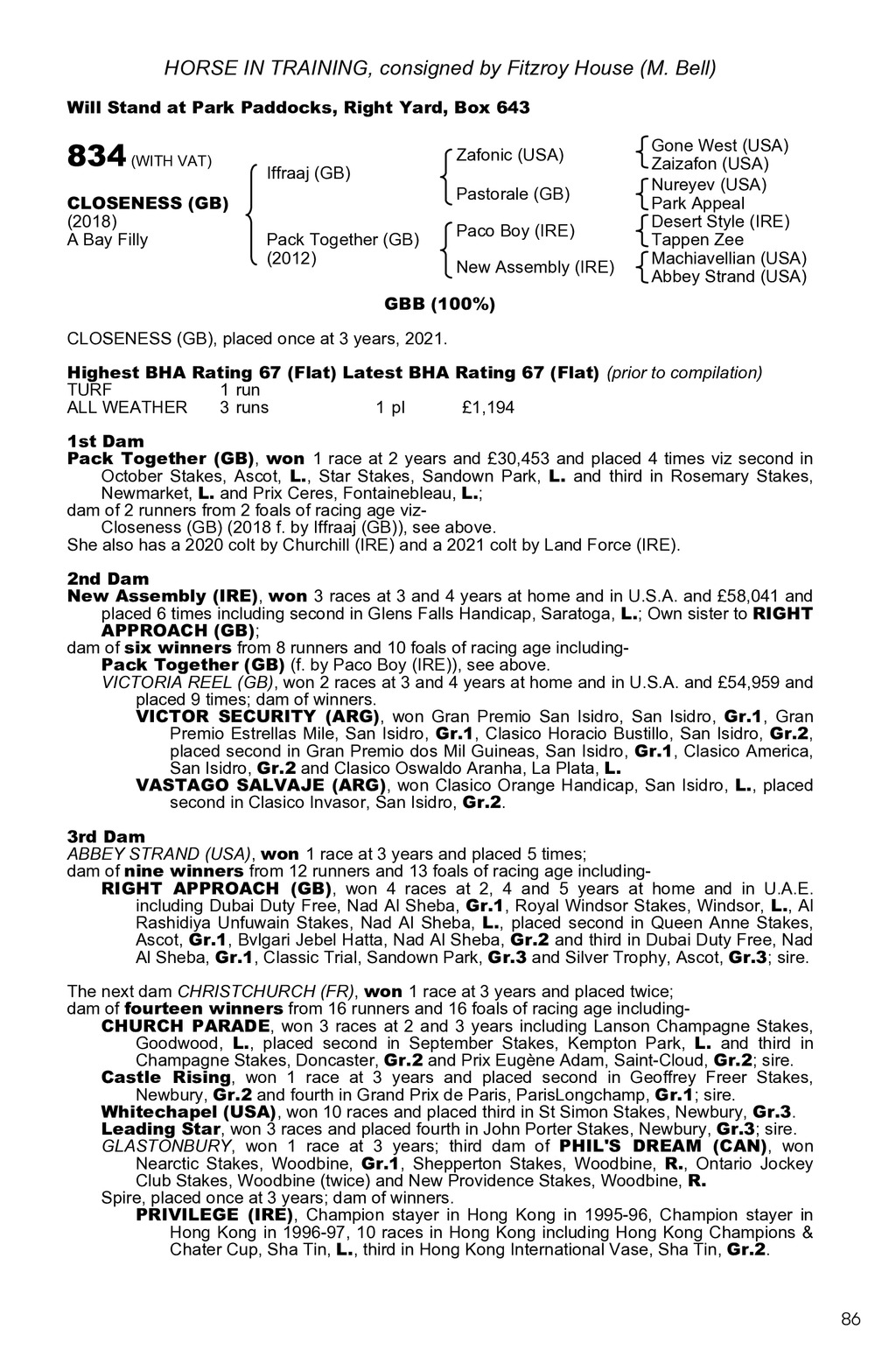 HORSE IN TRAINING, consigned by Fitzroy House (M. Bell) Will Stand at Park Paddocks, Right Yard, Box 643 834 (WITH VAT) CLOSENESS (GB) (2018) A Bay Filly Zafonic (USA) Iffraaj (GB) Pastorale (GB) Pack Together (GB) (2012) Paco Boy (IRE) New Assembly (IRE) Gone West (USA) Zaizafon (USA) Nureyev (USA) Park Appeal Desert Style (IRE) Tappen Zee Machiavellian (USA) Abbey Strand (USA) GBB (100%) CLOSENESS (GB), placed once at 3 years, 2021. Highest BHA Rating 67 (Flat) Latest BHA Rating 67 (Flat) (prior to compilation) TURF 1 run ALL WEATHER 3 runs 1 pl 1,194 1st Dam Pack Together (GB), won 1 race at 2 years and 30,453 and placed 4 times viz second in October Stakes, Ascot, L., Star Stakes, Sandown Park, L. and third in Rosemary Stakes, Newmarket, L. and Prix Ceres, Fontainebleau, L.; dam of 2 runners from 2 foals of racing age vizCloseness (GB) (2018 f. by Iffraaj (GB)), see above. She also has a 2020 colt by Churchill (IRE) and a 2021 colt by Land Force (IRE). 2nd Dam New Assembly (IRE), won 3 races at 3 and 4 years at home and in U.S.A. and 58,041 and placed 6 times including second in Glens Falls Handicap, Saratoga, L.; Own sister to RIGHT APPROACH (GB); dam of six winners from 8 runners and 10 foals of racing age includingPack Together (GB) (f. by Paco Boy (IRE)), see above. VICTORIA REEL (GB), won 2 races at 3 and 4 years at home and in U.S.A. and 54,959 and placed 9 times; dam of winners. VICTOR SECURITY (ARG), won Gran Premio San Isidro, San Isidro, Gr.1, Gran Premio Estrellas Mile, San Isidro, Gr.1, Clasico Horacio Bustillo, San Isidro, Gr.2, placed second in Gran Premio dos Mil Guineas, San Isidro, Gr.1, Clasico America, San Isidro, Gr.2 and Clasico Oswaldo Aranha, La Plata, L. VASTAGO SALVAJE (ARG), won Clasico Orange Handicap, San Isidro, L., placed second in Clasico Invasor, San Isidro, Gr.2. 3rd Dam ABBEY STRAND (USA), won 1 race at 3 years and placed 5 times; dam of nine winners from 12 runners and 13 foals of racing age includingRIGHT APPROACH (GB), won 4 races at 2, 4 and 5 years at home and in U.A.E. including Dubai Duty Free, Nad Al Sheba, Gr.1, Royal Windsor Stakes, Windsor, L., Al Rashidiya Unfuwain Stakes, Nad Al Sheba, L., placed second in Queen Anne Stakes, Ascot, Gr.1, Bvlgari Jebel Hatta, Nad Al Sheba, Gr.2 and third in Dubai Duty Free, Nad Al Sheba, Gr.1, Classic Trial, Sandown Park, Gr.3 and Silver Trophy, Ascot, Gr.3; sire. The next dam CHRISTCHURCH (FR), won 1 race at 3 years and placed twice; dam of fourteen winners from 16 runners and 16 foals of racing age includingCHURCH PARADE, won 3 races at 2 and 3 years including Lanson Champagne Stakes, Goodwood, L., placed second in September Stakes, Kempton Park, L. and third in Champagne Stakes, Doncaster, Gr.2 and Prix Eugne Adam, Saint-Cloud, Gr.2; sire. Castle Rising, won 1 race at 3 years and placed second in Geoffrey Freer Stakes, Newbury, Gr.2 and fourth in Grand Prix de Paris, ParisLongchamp, Gr.1; sire. Whitechapel (USA), won 10 races and placed third in St Simon Stakes, Newbury, Gr.3. Leading Star, won 3 races and placed fourth in John Porter Stakes, Newbury, Gr.3; sire. GLASTONBURY, won 1 race at 3 years; third dam of PHIL S DREAM (CAN), won Nearctic Stakes, Woodbine, Gr.1, Shepperton Stakes, Woodbine, R., Ontario Jockey Club Stakes, Woodbine (twice) and New Providence Stakes, Woodbine, R. Spire, placed once at 3 years; dam of winners. PRIVILEGE (IRE), Champion stayer in Hong Kong in 1995-96, Champion stayer in Hong Kong in 1996-97, 10 races in Hong Kong including Hong Kong Champions & Chater Cup, Sha Tin, L., third in Hong Kong International Vase, Sha Tin, Gr.2. 86