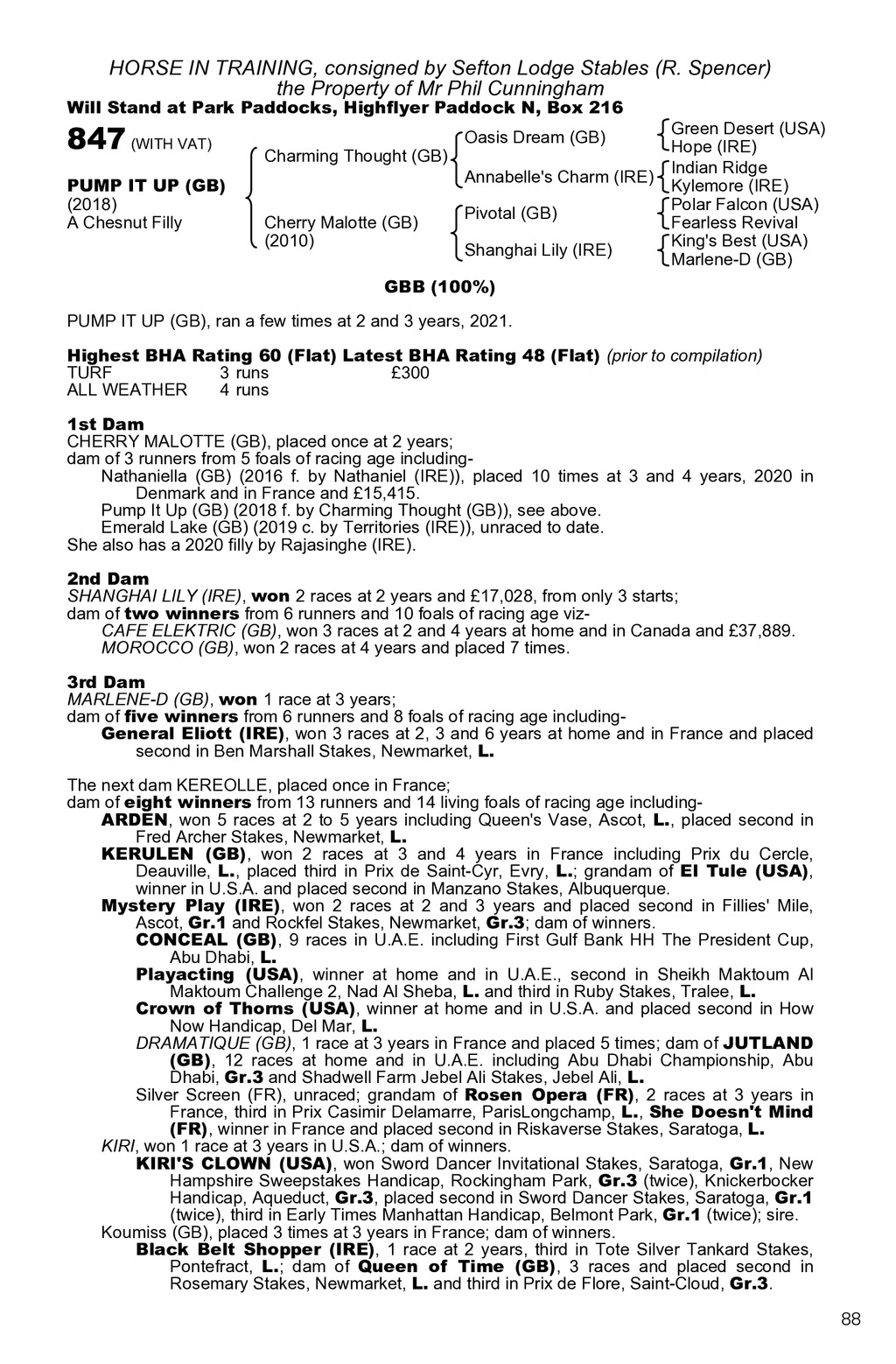 HORSE IN TRAINING, consigned by Sefton Lodge Stables (R. Spencer) the Property of Mr Phil Cunningham Will Stand at Park Paddocks, Highflyer Paddock N, Box 216 847 (WITH VAT) PUMP IT UP (GB) (2018) A Chesnut Filly Charming Thought (GB) Oasis Dream (GB) Annabelle s Charm (IRE) Cherry Malotte (GB) (2010) Pivotal (GB) Shanghai Lily (IRE) Green Desert (USA) Hope (IRE) Indian Ridge Kylemore (IRE) Polar Falcon (USA) Fearless Revival King s Best (USA) Marlene-D (GB) GBB (100%) PUMP IT UP (GB), ran a few times at 2 and 3 years, 2021. Highest BHA Rating 60 (Flat) Latest BHA Rating 48 (Flat) (prior to compilation) TURF 3 runs 300 ALL WEATHER 4 runs 1st Dam CHERRY MALOTTE (GB), placed once at 2 years; dam of 3 runners from 5 foals of racing age includingNathaniella (GB) (2016 f. by Nathaniel (IRE)), placed 10 times at 3 and 4 years, 2020 in Denmark and in France and 15,415. Pump It Up (GB) (2018 f. by Charming Thought (GB)), see above. Emerald Lake (GB) (2019 c. by Territories (IRE)), unraced to date. She also has a 2020 filly by Rajasinghe (IRE). 2nd Dam SHANGHAI LILY (IRE), won 2 races at 2 years and 17,028, from only 3 starts; dam of two winners from 6 runners and 10 foals of racing age vizCAFE ELEKTRIC (GB), won 3 races at 2 and 4 years at home and in Canada and 37,889. MOROCCO (GB), won 2 races at 4 years and placed 7 times. 3rd Dam MARLENE-D (GB), won 1 race at 3 years; dam of five winners from 6 runners and 8 foals of racing age includingGeneral Eliott (IRE), won 3 races at 2, 3 and 6 years at home and in France and placed second in Ben Marshall Stakes, Newmarket, L. The next dam KEREOLLE, placed once in France; dam of eight winners from 13 runners and 14 living foals of racing age includingARDEN, won 5 races at 2 to 5 years including Queen s Vase, Ascot, L., placed second in Fred Archer Stakes, Newmarket, L. KERULEN (GB), won 2 races at 3 and 4 years in France including Prix du Cercle, Deauville, L., placed third in Prix de Saint-Cyr, Evry, L.; grandam of El Tule (USA), winner in U.S.A. and placed second in Manzano Stakes, Albuquerque. Mystery Play (IRE), won 2 races at 2 and 3 years and placed second in Fillies Mile, Ascot, Gr.1 and Rockfel Stakes, Newmarket, Gr.3; dam of winners. CONCEAL (GB), 9 races in U.A.E. including First Gulf Bank HH The President Cup, Abu Dhabi, L. Playacting (USA), winner at home and in U.A.E., second in Sheikh Maktoum Al Maktoum Challenge 2, Nad Al Sheba, L. and third in Ruby Stakes, Tralee, L. Crown of Thorns (USA), winner at home and in U.S.A. and placed second in How Now Handicap, Del Mar, L. DRAMATIQUE (GB), 1 race at 3 years in France and placed 5 times; dam of JUTLAND (GB), 12 races at home and in U.A.E. including Abu Dhabi Championship, Abu Dhabi, Gr.3 and Shadwell Farm Jebel Ali Stakes, Jebel Ali, L. Silver Screen (FR), unraced; grandam of Rosen Opera (FR), 2 races at 3 years in France, third in Prix Casimir Delamarre, ParisLongchamp, L., She Doesn t Mind (FR), winner in France and placed second in Riskaverse Stakes, Saratoga, L. KIRI, won 1 race at 3 years in U.S.A.; dam of winners. KIRI S CLOWN (USA), won Sword Dancer Invitational Stakes, Saratoga, Gr.1, New Hampshire Sweepstakes Handicap, Rockingham Park, Gr.3 (twice), Knickerbocker Handicap, Aqueduct, Gr.3, placed second in Sword Dancer Stakes, Saratoga, Gr.1 (twice), third in Early Times Manhattan Handicap, Belmont Park, Gr.1 (twice); sire. Koumiss (GB), placed 3 times at 3 years in France; dam of winners. Black Belt Shopper (IRE), 1 race at 2 years, third in Tote Silver Tankard Stakes, Pontefract, L.; dam of Queen of Time (GB), 3 races and placed second in Rosemary Stakes, Newmarket, L. and third in Prix de Flore, Saint-Cloud, Gr.3. 88