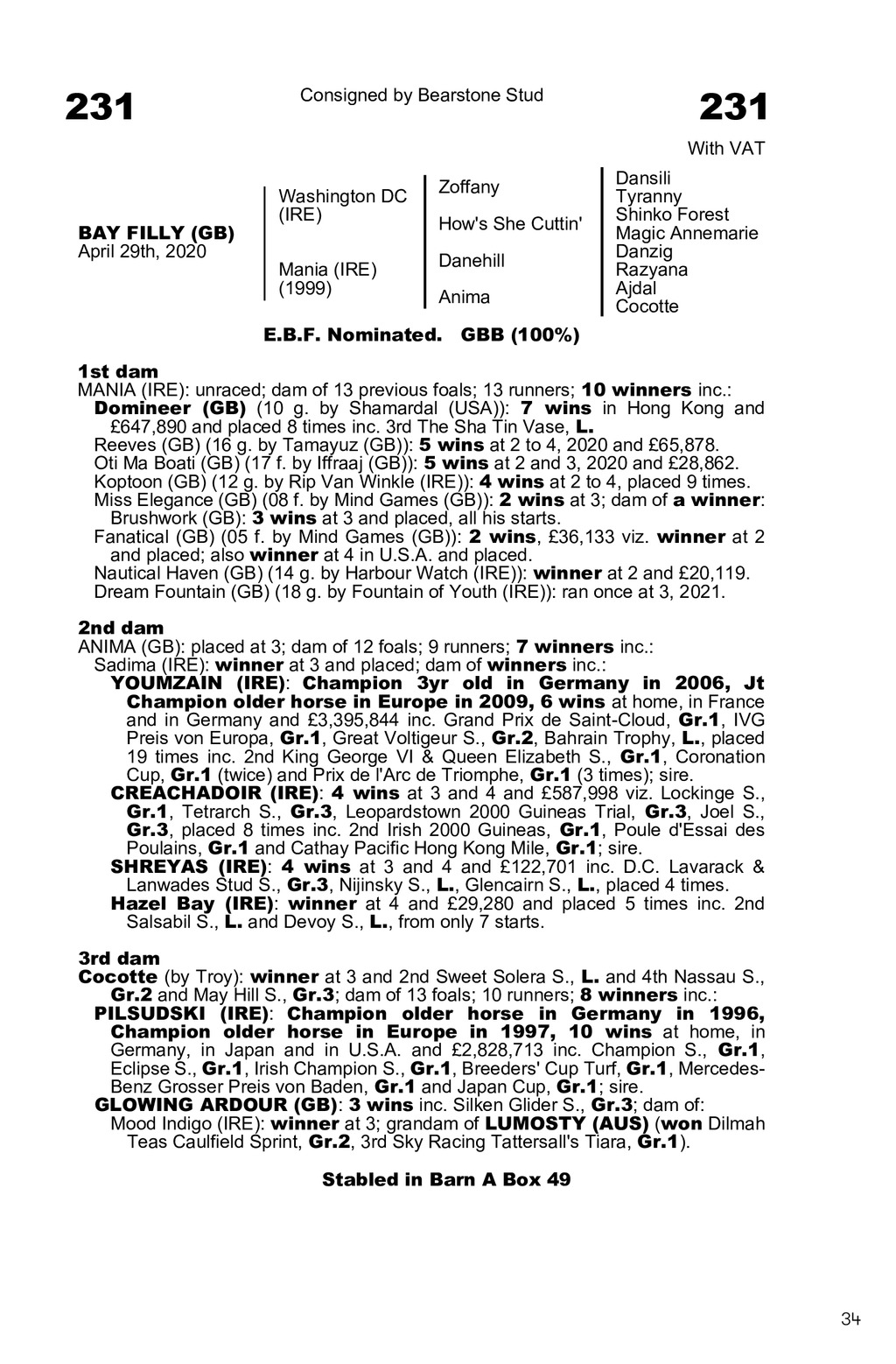 0046Z54.GUI 00Mania (IRE)|2020|F|A|2752719 231 Consigned by Bearstone Stud 231 With VAT BAY FILLY (GB) April 29th, 2020 Washington DC (IRE) Zoffany Mania (IRE) (1999) Danehill How s She Cuttin Anima Dansili Tyranny Shinko Forest Magic Annemarie Danzig Razyana Ajdal Cocotte E.B.F. Nominated. GBB (100%) 1st dam MANIA (IRE): unraced; dam of 13 previous foals; 13 runners; 10 winners inc.: Domineer (GB) (10 g. by Shamardal (USA)): 7 wins in Hong Kong and 647,890 and placed 8 times inc. 3rd The Sha Tin Vase, L. Reeves (GB) (16 g. by Tamayuz (GB)): 5 wins at 2 to 4, 2020 and 65,878. Oti Ma Boati (GB) (17 f. by Iffraaj (GB)): 5 wins at 2 and 3, 2020 and 28,862. Koptoon (GB) (12 g. by Rip Van Winkle (IRE)): 4 wins at 2 to 4, placed 9 times. Miss Elegance (GB) (08 f. by Mind Games (GB)): 2 wins at 3; dam of a winner: Brushwork (GB): 3 wins at 3 and placed, all his starts. Fanatical (GB) (05 f. by Mind Games (GB)): 2 wins, 36,133 viz. winner at 2 and placed; also winner at 4 in U.S.A. and placed. Nautical Haven (GB) (14 g. by Harbour Watch (IRE)): winner at 2 and 20,119. Dream Fountain (GB) (18 g. by Fountain of Youth (IRE)): ran once at 3, 2021. 2nd dam ANIMA (GB): placed at 3; dam of 12 foals; 9 runners; 7 winners inc.: Sadima (IRE): winner at 3 and placed; dam of winners inc.: YOUMZAIN (IRE): Champion 3yr old in Germany in 2006, Jt Champion older horse in Europe in 2009, 6 wins at home, in France and in Germany and 3,395,844 inc. Grand Prix de Saint-Cloud, Gr.1, IVG Preis von Europa, Gr.1, Great Voltigeur S., Gr.2, Bahrain Trophy, L., placed 19 times inc. 2nd King George VI & Queen Elizabeth S., Gr.1, Coronation Cup, Gr.1 (twice) and Prix de l Arc de Triomphe, Gr.1 (3 times); sire. CREACHADOIR (IRE): 4 wins at 3 and 4 and 587,998 viz. Lockinge S., Gr.1, Tetrarch S., Gr.3, Leopardstown 2000 Guineas Trial, Gr.3, Joel S., Gr.3, placed 8 times inc. 2nd Irish 2000 Guineas, Gr.1, Poule d Essai des Poulains, Gr.1 and Cathay Pacific Hong Kong Mile, Gr.1; sire. SHREYAS (IRE): 4 wins at 3 and 4 and 122,701 inc. D.C. Lavarack & Lanwades Stud S., Gr.3, Nijinsky S., L., Glencairn S., L., placed 4 times. Hazel Bay (IRE): winner at 4 and 29,280 and placed 5 times inc. 2nd Salsabil S., L. and Devoy S., L., from only 7 starts. 3rd dam Cocotte (by Troy): winner at 3 and 2nd Sweet Solera S., L. and 4th Nassau S., Gr.2 and May Hill S., Gr.3; dam of 13 foals; 10 runners; 8 winners inc.: PILSUDSKI (IRE): Champion older horse in Germany in 1996, Champion older horse in Europe in 1997, 10 wins at home, in Germany, in Japan and in U.S.A. and 2,828,713 inc. Champion S., Gr.1, Eclipse S., Gr.1, Irish Champion S., Gr.1, Breeders Cup Turf, Gr.1, MercedesBenz Grosser Preis von Baden, Gr.1 and Japan Cup, Gr.1; sire. GLOWING ARDOUR (GB): 3 wins inc. Silken Glider S., Gr.3; dam of: Mood Indigo (IRE): winner at 3; grandam of LUMOSTY (AUS) (won Dilmah Teas Caulfield Sprint, Gr.2, 3rd Sky Racing Tattersall s Tiara, Gr.1). Stabled in Barn Box Stabled in Barn A Box 49 34