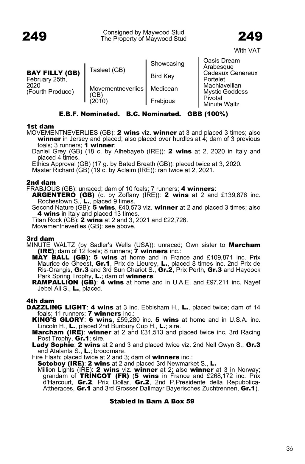 0310W87.GUI 00Movementneverlies (GB)|2020|F|A|2743521 249 249 Consigned by Maywood Stud The Property of Maywood Stud With VAT BAY FILLY (GB) February 25th, 2020 (Fourth Produce) Tasleet (GB) Movementneverlies (GB) (2010) Showcasing Bird Key Medicean Frabjous Oasis Dream Arabesque Cadeaux Genereux Portelet Machiavellian Mystic Goddess Pivotal Minute Waltz E.B.F. Nominated. B.C. Nominated. GBB (100%) 1st dam MOVEMENTNEVERLIES (GB): 2 wins viz. winner at 3 and placed 3 times; also winner in Jersey and placed; also placed over hurdles at 4; dam of 3 previous foals; 3 runners; 1 winner: Daniel Grey (GB) (18 c. by Alhebayeb (IRE)): 2 wins at 2, 2020 in Italy and placed 4 times. Ethics Approval (GB) (17 g. by Bated Breath (GB)): placed twice at 3, 2020. Master Richard (GB) (19 c. by Aclaim (IRE)): ran twice at 2, 2021. 2nd dam FRABJOUS (GB): unraced; dam of 10 foals; 7 runners; 4 winners: ARGENTERO (GB) (c. by Zoffany (IRE)): 2 wins at 2 and 139,876 inc. Rochestown S., L., placed 9 times. Second Nature (GB): 5 wins, 40,573 viz. winner at 2 and placed 3 times; also 4 wins in Italy and placed 13 times. Titan Rock (GB): 2 wins at 2 and 3, 2021 and 22,726. Movementneverlies (GB): see above. 3rd dam MINUTE WALTZ (by Sadler s Wells (USA)): unraced; Own sister to Marcham (IRE); dam of 12 foals; 8 runners; 7 winners inc.: MAY BALL (GB): 5 wins at home and in France and 109,871 inc. Prix Maurice de Gheest, Gr.1, Prix de Lieurey, L., placed 8 times inc. 2nd Prix de Ris-Orangis, Gr.3 and 3rd Sun Chariot S., Gr.2, Prix Perth, Gr.3 and Haydock Park Spring Trophy, L.; dam of winners. RAMPALLION (GB): 4 wins at home and in U.A.E. and 97,211 inc. Nayef Jebel Ali S., L., placed. 4th dam DAZZLING LIGHT: 4 wins at 3 inc. Ebbisham H., L., placed twice; dam of 14 foals; 11 runners; 7 winners inc.: KING S GLORY: 6 wins, 59,280 inc. 5 wins at home and in U.S.A. inc. Lincoln H., L., placed 2nd Bunbury Cup H., L.; sire. Marcham (IRE): winner at 2 and 31,513 and placed twice inc. 3rd Racing Post Trophy, Gr.1; sire. Lady Sophie: 2 wins at 2 and 3 and placed twice viz. 2nd Nell Gwyn S., Gr.3 and Atalanta S., L.; broodmare. Fire Flash: placed twice at 2 and 3; dam of winners inc.: Sotoboy (IRE): 2 wins at 2 and placed 3rd Newmarket S., L. Million Lights (IRE): 2 wins viz. winner at 2; also winner at 3 in Norway; grandam of TRINCOT (FR) (5 wins in France and 268,172 inc. Prix d Harcourt, Gr.2, Prix Dollar, Gr.2, 2nd P.Presidente della RepubblicaAttheraces, Gr.1 and 3rd Grosser Dallmayr Bayerisches Zuchtrennen, Gr.1). Stabled in Barn Box Stabled in Barn A Box 59 36