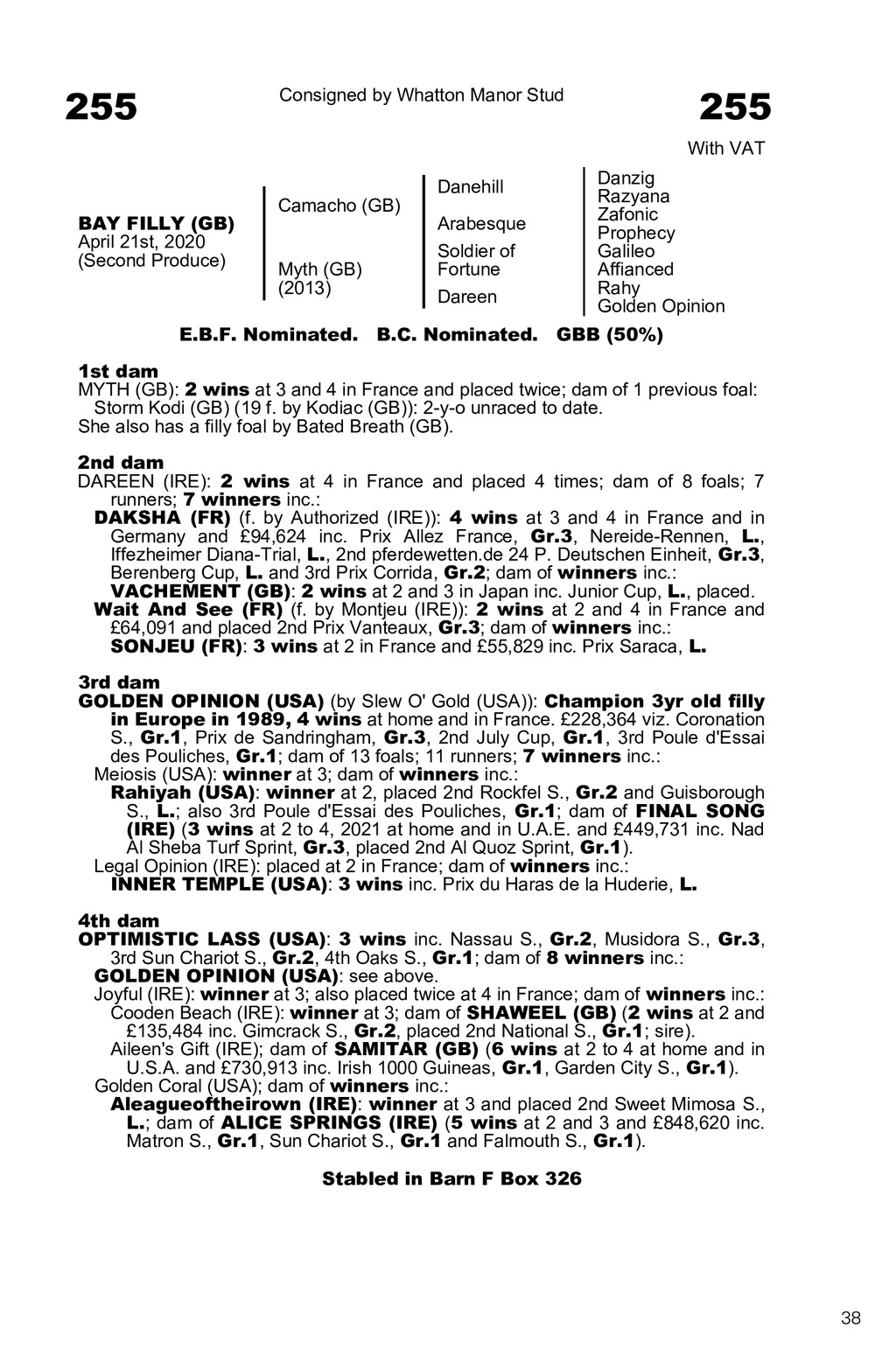 0086Z14.GUI 00Myth (GB)|2020|F|A|2749867 255 255 Consigned by Whatton Manor Stud With VAT BAY FILLY (GB) April 21st, 2020 (Second Produce) Camacho (GB) Myth (GB) (2013) Danehill Arabesque Soldier of Fortune Dareen Danzig Razyana Zafonic Prophecy Galileo Affianced Rahy Golden Opinion E.B.F. Nominated. B.C. Nominated. GBB (50%) 1st dam MYTH (GB): 2 wins at 3 and 4 in France and placed twice; dam of 1 previous foal: Storm Kodi (GB) (19 f. by Kodiac (GB)): 2-y-o unraced to date. She also has a filly foal by Bated Breath (GB). 2nd dam DAREEN (IRE): 2 wins at 4 in France and placed 4 times; dam of 8 foals; 7 runners; 7 winners inc.: DAKSHA (FR) (f. by Authorized (IRE)): 4 wins at 3 and 4 in France and in Germany and 94,624 inc. Prix Allez France, Gr.3, Nereide-Rennen, L., Iffezheimer Diana-Trial, L., 2nd pferdewetten.de 24 P. Deutschen Einheit, Gr.3, Berenberg Cup, L. and 3rd Prix Corrida, Gr.2; dam of winners inc.: VACHEMENT (GB): 2 wins at 2 and 3 in Japan inc. Junior Cup, L., placed. Wait And See (FR) (f. by Montjeu (IRE)): 2 wins at 2 and 4 in France and 64,091 and placed 2nd Prix Vanteaux, Gr.3; dam of winners inc.: SONJEU (FR): 3 wins at 2 in France and 55,829 inc. Prix Saraca, L. 3rd dam GOLDEN OPINION (USA) (by Slew O Gold (USA)): Champion 3yr old filly in Europe in 1989, 4 wins at home and in France. 228,364 viz. Coronation S., Gr.1, Prix de Sandringham, Gr.3, 2nd July Cup, Gr.1, 3rd Poule d Essai des Pouliches, Gr.1; dam of 13 foals; 11 runners; 7 winners inc.: Meiosis (USA): winner at 3; dam of winners inc.: Rahiyah (USA): winner at 2, placed 2nd Rockfel S., Gr.2 and Guisborough S., L.; also 3rd Poule d Essai des Pouliches, Gr.1; dam of FINAL SONG (IRE) (3 wins at 2 to 4, 2021 at home and in U.A.E. and 449,731 inc. Nad Al Sheba Turf Sprint, Gr.3, placed 2nd Al Quoz Sprint, Gr.1). Legal Opinion (IRE): placed at 2 in France; dam of winners inc.: INNER TEMPLE (USA): 3 wins inc. Prix du Haras de la Huderie, L. 4th dam OPTIMISTIC LASS (USA): 3 wins inc. Nassau S., Gr.2, Musidora S., Gr.3, 3rd Sun Chariot S., Gr.2, 4th Oaks S., Gr.1; dam of 8 winners inc.: GOLDEN OPINION (USA): see above. Joyful (IRE): winner at 3; also placed twice at 4 in France; dam of winners inc.: Cooden Beach (IRE): winner at 3; dam of SHAWEEL (GB) (2 wins at 2 and 135,484 inc. Gimcrack S., Gr.2, placed 2nd National S., Gr.1; sire). Aileen s Gift (IRE); dam of SAMITAR (GB) (6 wins at 2 to 4 at home and in U.S.A. and 730,913 inc. Irish 1000 Guineas, Gr.1, Garden City S., Gr.1). Golden Coral (USA); dam of winners inc.: Aleagueoftheirown (IRE): winner at 3 and placed 2nd Sweet Mimosa S., L.; dam of ALICE SPRINGS (IRE) (5 wins at 2 and 3 and 848,620 inc. Matron S., Gr.1, Sun Chariot S., Gr.1 and Falmouth S., Gr.1). Stabled in Barn Box Stabled in Barn F Box 326 38