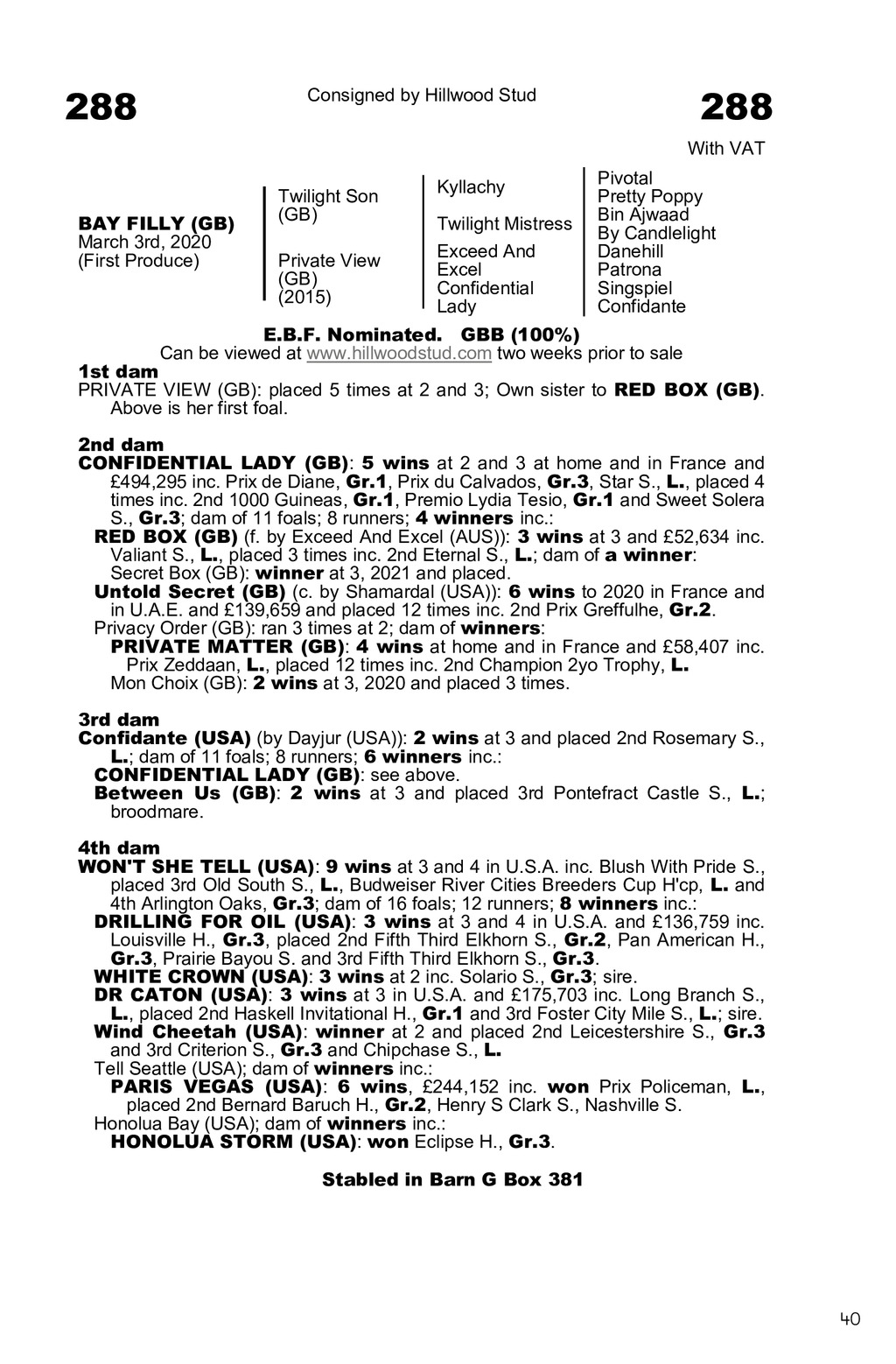 0112Y87.GUI 00Private View (GB)|2020|F|A|2744208 288 288 Consigned by Hillwood Stud With VAT BAY FILLY (GB) March 3rd, 2020 (First Produce) Twilight Son (GB) Private View (GB) (2015) Kyllachy Twilight Mistress Exceed And Excel Confidential Lady Pivotal Pretty Poppy Bin Ajwaad By Candlelight Danehill Patrona Singspiel Confidante E.B.F. Nominated. GBB (100%) Can be viewed at www.hillwoodstud.com two weeks prior to sale 1st dam PRIVATE VIEW (GB): placed 5 times at 2 and 3; Own sister to RED BOX (GB). Above is her first foal. 2nd dam CONFIDENTIAL LADY (GB): 5 wins at 2 and 3 at home and in France and 494,295 inc. Prix de Diane, Gr.1, Prix du Calvados, Gr.3, Star S., L., placed 4 times inc. 2nd 1000 Guineas, Gr.1, Premio Lydia Tesio, Gr.1 and Sweet Solera S., Gr.3; dam of 11 foals; 8 runners; 4 winners inc.: RED BOX (GB) (f. by Exceed And Excel (AUS)): 3 wins at 3 and 52,634 inc. Valiant S., L., placed 3 times inc. 2nd Eternal S., L.; dam of a winner: Secret Box (GB): winner at 3, 2021 and placed. Untold Secret (GB) (c. by Shamardal (USA)): 6 wins to 2020 in France and in U.A.E. and 139,659 and placed 12 times inc. 2nd Prix Greffulhe, Gr.2. Privacy Order (GB): ran 3 times at 2; dam of winners: PRIVATE MATTER (GB): 4 wins at home and in France and 58,407 inc. Prix Zeddaan, L., placed 12 times inc. 2nd Champion 2yo Trophy, L. Mon Choix (GB): 2 wins at 3, 2020 and placed 3 times. 3rd dam Confidante (USA) (by Dayjur (USA)): 2 wins at 3 and placed 2nd Rosemary S., L.; dam of 11 foals; 8 runners; 6 winners inc.: CONFIDENTIAL LADY (GB): see above. Between Us (GB): 2 wins at 3 and placed 3rd Pontefract Castle S., L.; broodmare. 4th dam WON T SHE TELL (USA): 9 wins at 3 and 4 in U.S.A. inc. Blush With Pride S., placed 3rd Old South S., L., Budweiser River Cities Breeders Cup H cp, L. and 4th Arlington Oaks, Gr.3; dam of 16 foals; 12 runners; 8 winners inc.: DRILLING FOR OIL (USA): 3 wins at 3 and 4 in U.S.A. and 136,759 inc. Louisville H., Gr.3, placed 2nd Fifth Third Elkhorn S., Gr.2, Pan American H., Gr.3, Prairie Bayou S. and 3rd Fifth Third Elkhorn S., Gr.3. WHITE CROWN (USA): 3 wins at 2 inc. Solario S., Gr.3; sire. DR CATON (USA): 3 wins at 3 in U.S.A. and 175,703 inc. Long Branch S., L., placed 2nd Haskell Invitational H., Gr.1 and 3rd Foster City Mile S., L.; sire. Wind Cheetah (USA): winner at 2 and placed 2nd Leicestershire S., Gr.3 and 3rd Criterion S., Gr.3 and Chipchase S., L. Tell Seattle (USA); dam of winners inc.: PARIS VEGAS (USA): 6 wins, 244,152 inc. won Prix Policeman, L., placed 2nd Bernard Baruch H., Gr.2, Henry S Clark S., Nashville S. Honolua Bay (USA); dam of winners inc.: HONOLUA STORM (USA): won Eclipse H., Gr.3. Stabled in Barn Box Stabled in Barn G Box 381 40