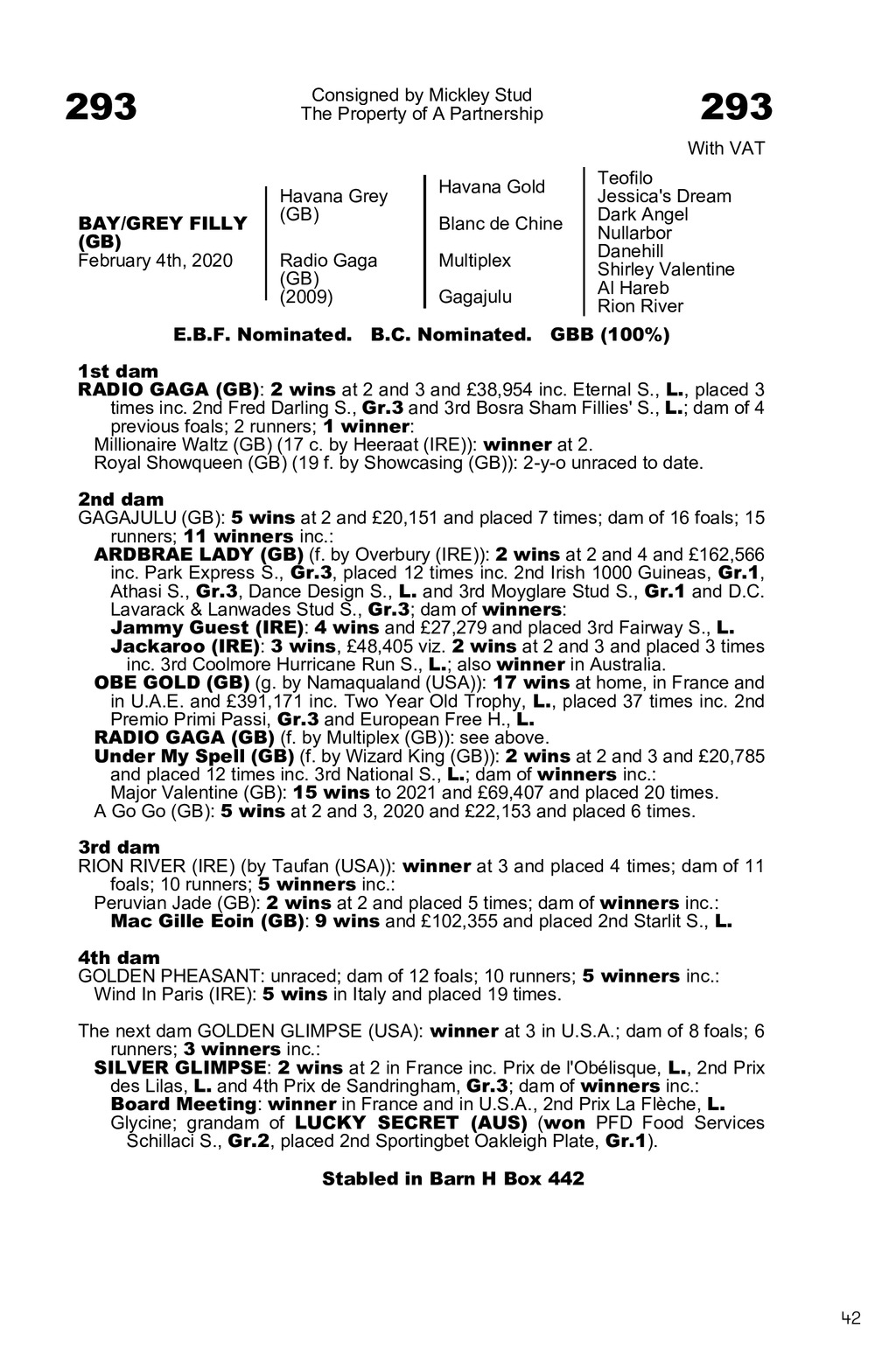 0065Z35.GUI 00Radio Gaga (GB)|2020|F|A|2740811 293 293 Consigned by Mickley Stud The Property of A Partnership With VAT BAY/GREY FILLY (GB) February 4th, 2020 Havana Grey (GB) Havana Gold Radio Gaga (GB) (2009) Multiplex Blanc de Chine Gagajulu Teofilo Jessica s Dream Dark Angel Nullarbor Danehill Shirley Valentine Al Hareb Rion River E.B.F. Nominated. B.C. Nominated. GBB (100%) 1st dam RADIO GAGA (GB): 2 wins at 2 and 3 and 38,954 inc. Eternal S., L., placed 3 times inc. 2nd Fred Darling S., Gr.3 and 3rd Bosra Sham Fillies S., L.; dam of 4 previous foals; 2 runners; 1 winner: Millionaire Waltz (GB) (17 c. by Heeraat (IRE)): winner at 2. Royal Showqueen (GB) (19 f. by Showcasing (GB)): 2-y-o unraced to date. 2nd dam GAGAJULU (GB): 5 wins at 2 and 20,151 and placed 7 times; dam of 16 foals; 15 runners; 11 winners inc.: ARDBRAE LADY (GB) (f. by Overbury (IRE)): 2 wins at 2 and 4 and 162,566 inc. Park Express S., Gr.3, placed 12 times inc. 2nd Irish 1000 Guineas, Gr.1, Athasi S., Gr.3, Dance Design S., L. and 3rd Moyglare Stud S., Gr.1 and D.C. Lavarack & Lanwades Stud S., Gr.3; dam of winners: Jammy Guest (IRE): 4 wins and 27,279 and placed 3rd Fairway S., L. Jackaroo (IRE): 3 wins, 48,405 viz. 2 wins at 2 and 3 and placed 3 times inc. 3rd Coolmore Hurricane Run S., L.; also winner in Australia. OBE GOLD (GB) (g. by Namaqualand (USA)): 17 wins at home, in France and in U.A.E. and 391,171 inc. Two Year Old Trophy, L., placed 37 times inc. 2nd Premio Primi Passi, Gr.3 and European Free H., L. RADIO GAGA (GB) (f. by Multiplex (GB)): see above. Under My Spell (GB) (f. by Wizard King (GB)): 2 wins at 2 and 3 and 20,785 and placed 12 times inc. 3rd National S., L.; dam of winners inc.: Major Valentine (GB): 15 wins to 2021 and 69,407 and placed 20 times. A Go Go (GB): 5 wins at 2 and 3, 2020 and 22,153 and placed 6 times. 3rd dam RION RIVER (IRE) (by Taufan (USA)): winner at 3 and placed 4 times; dam of 11 foals; 10 runners; 5 winners inc.: Peruvian Jade (GB): 2 wins at 2 and placed 5 times; dam of winners inc.: Mac Gille Eoin (GB): 9 wins and 102,355 and placed 2nd Starlit S., L. 4th dam GOLDEN PHEASANT: unraced; dam of 12 foals; 10 runners; 5 winners inc.: Wind In Paris (IRE): 5 wins in Italy and placed 19 times. The next dam GOLDEN GLIMPSE (USA): winner at 3 in U.S.A.; dam of 8 foals; 6 runners; 3 winners inc.: SILVER GLIMPSE: 2 wins at 2 in France inc. Prix de l Oblisque, L., 2nd Prix des Lilas, L. and 4th Prix de Sandringham, Gr.3; dam of winners inc.: Board Meeting: winner in France and in U.S.A., 2nd Prix La Flche, L. Glycine; grandam of LUCKY SECRET (AUS) (won PFD Food Services Schillaci S., Gr.2, placed 2nd Sportingbet Oakleigh Plate, Gr.1). Stabled in Barn Box Stabled in Barn H Box 442 42