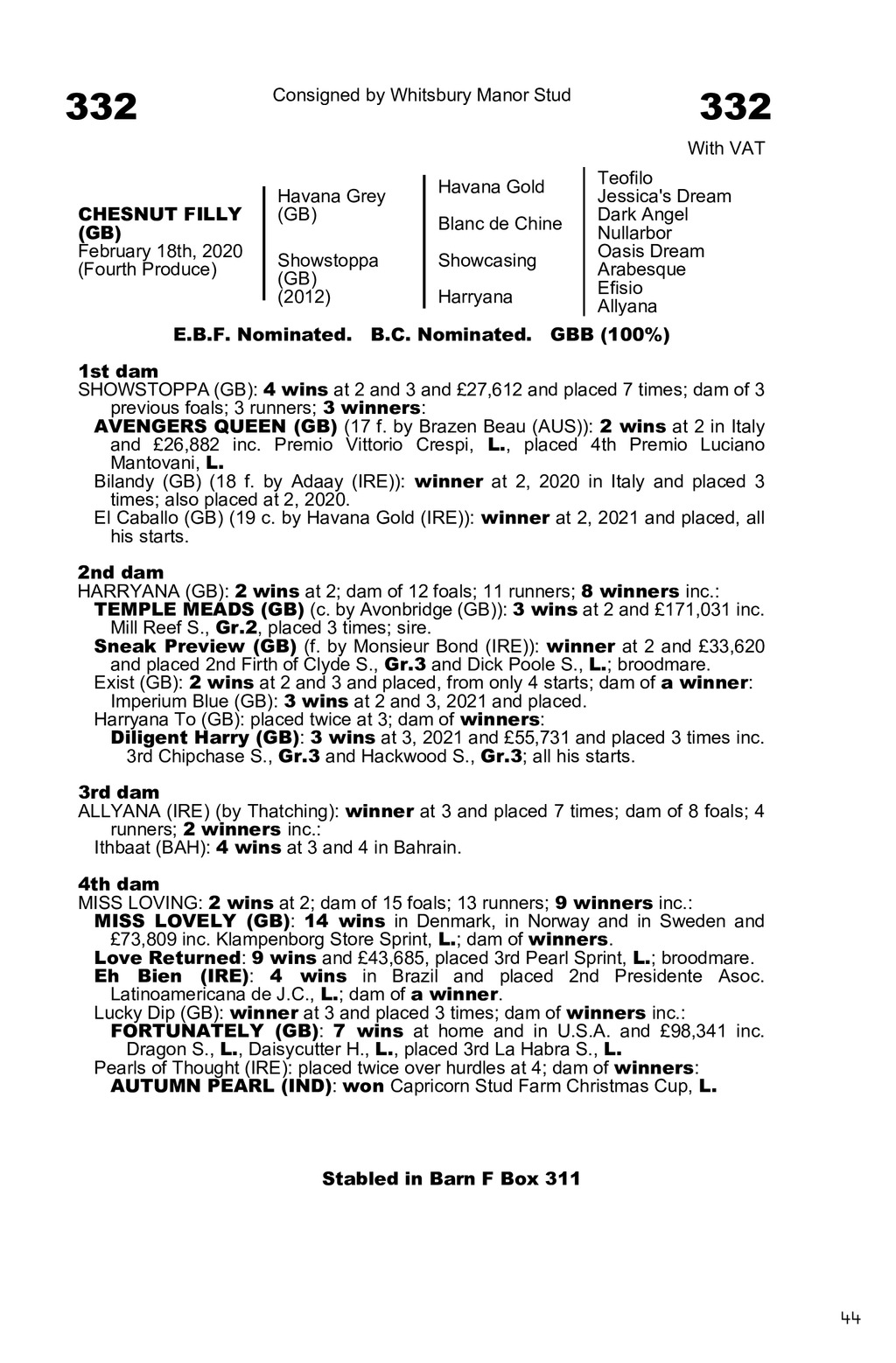 0196Y03.GUI 00Showstoppa (GB)|2020|F|A|2743169 332 332 Consigned by Whitsbury Manor Stud With VAT CHESNUT FILLY (GB) February 18th, 2020 (Fourth Produce) Havana Grey (GB) Havana Gold Showstoppa (GB) (2012) Showcasing Blanc de Chine Harryana Teofilo Jessica s Dream Dark Angel Nullarbor Oasis Dream Arabesque Efisio Allyana E.B.F. Nominated. B.C. Nominated. GBB (100%) 1st dam SHOWSTOPPA (GB): 4 wins at 2 and 3 and 27,612 and placed 7 times; dam of 3 previous foals; 3 runners; 3 winners: AVENGERS QUEEN (GB) (17 f. by Brazen Beau (AUS)): 2 wins at 2 in Italy and 26,882 inc. Premio Vittorio Crespi, L., placed 4th Premio Luciano Mantovani, L. Bilandy (GB) (18 f. by Adaay (IRE)): winner at 2, 2020 in Italy and placed 3 times; also placed at 2, 2020. El Caballo (GB) (19 c. by Havana Gold (IRE)): winner at 2, 2021 and placed, all his starts. 2nd dam HARRYANA (GB): 2 wins at 2; dam of 12 foals; 11 runners; 8 winners inc.: TEMPLE MEADS (GB) (c. by Avonbridge (GB)): 3 wins at 2 and 171,031 inc. Mill Reef S., Gr.2, placed 3 times; sire. Sneak Preview (GB) (f. by Monsieur Bond (IRE)): winner at 2 and 33,620 and placed 2nd Firth of Clyde S., Gr.3 and Dick Poole S., L.; broodmare. Exist (GB): 2 wins at 2 and 3 and placed, from only 4 starts; dam of a winner: Imperium Blue (GB): 3 wins at 2 and 3, 2021 and placed. Harryana To (GB): placed twice at 3; dam of winners: Diligent Harry (GB): 3 wins at 3, 2021 and 55,731 and placed 3 times inc. 3rd Chipchase S., Gr.3 and Hackwood S., Gr.3; all his starts. 3rd dam ALLYANA (IRE) (by Thatching): winner at 3 and placed 7 times; dam of 8 foals; 4 runners; 2 winners inc.: Ithbaat (BAH): 4 wins at 3 and 4 in Bahrain. 4th dam MISS LOVING: 2 wins at 2; dam of 15 foals; 13 runners; 9 winners inc.: MISS LOVELY (GB): 14 wins in Denmark, in Norway and in Sweden and 73,809 inc. Klampenborg Store Sprint, L.; dam of winners. Love Returned: 9 wins and 43,685, placed 3rd Pearl Sprint, L.; broodmare. Eh Bien (IRE): 4 wins in Brazil and placed 2nd Presidente Asoc. Latinoamericana de J.C., L.; dam of a winner. Lucky Dip (GB): winner at 3 and placed 3 times; dam of winners inc.: FORTUNATELY (GB): 7 wins at home and in U.S.A. and 98,341 inc. Dragon S., L., Daisycutter H., L., placed 3rd La Habra S., L. Pearls of Thought (IRE): placed twice over hurdles at 4; dam of winners: AUTUMN PEARL (IND): won Capricorn Stud Farm Christmas Cup, L. Stabled in Barn Box Stabled in Barn F Box 311 44