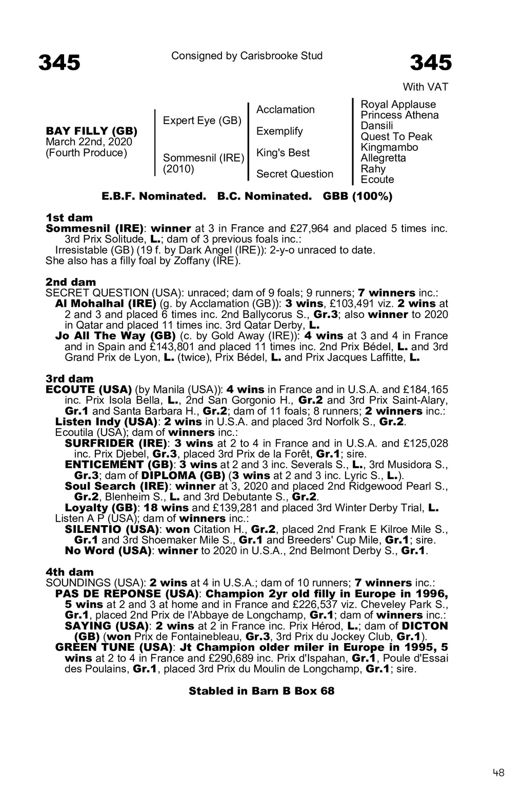 0029Z71.GUI 00Sommesnil (IRE)|2020|F|A|2746686 345 345 Consigned by Carisbrooke Stud With VAT BAY FILLY (GB) March 22nd, 2020 (Fourth Produce) Expert Eye (GB) Sommesnil (IRE) (2010) Acclamation Exemplify King s Best Secret Question Royal Applause Princess Athena Dansili Quest To Peak Kingmambo Allegretta Rahy Ecoute E.B.F. Nominated. B.C. Nominated. GBB (100%) 1st dam Sommesnil (IRE): winner at 3 in France and 27,964 and placed 5 times inc. 3rd Prix Solitude, L.; dam of 3 previous foals inc.: Irresistable (GB) (19 f. by Dark Angel (IRE)): 2-y-o unraced to date. She also has a filly foal by Zoffany (IRE). 2nd dam SECRET QUESTION (USA): unraced; dam of 9 foals; 9 runners; 7 winners inc.: Al Mohalhal (IRE) (g. by Acclamation (GB)): 3 wins, 103,491 viz. 2 wins at 2 and 3 and placed 6 times inc. 2nd Ballycorus S., Gr.3; also winner to 2020 in Qatar and placed 11 times inc. 3rd Qatar Derby, L. Jo All The Way (GB) (c. by Gold Away (IRE)): 4 wins at 3 and 4 in France and in Spain and 143,801 and placed 11 times inc. 2nd Prix Bdel, L. and 3rd Grand Prix de Lyon, L. (twice), Prix Bdel, L. and Prix Jacques Laffitte, L. 3rd dam ECOUTE (USA) (by Manila (USA)): 4 wins in France and in U.S.A. and 184,165 inc. Prix Isola Bella, L., 2nd San Gorgonio H., Gr.2 and 3rd Prix Saint-Alary, Gr.1 and Santa Barbara H., Gr.2; dam of 11 foals; 8 runners; 2 winners inc.: Listen Indy (USA): 2 wins in U.S.A. and placed 3rd Norfolk S., Gr.2. Ecoutila (USA); dam of winners inc.: SURFRIDER (IRE): 3 wins at 2 to 4 in France and in U.S.A. and 125,028 inc. Prix Djebel, Gr.3, placed 3rd Prix de la Fort, Gr.1; sire. ENTICEMENT (GB): 3 wins at 2 and 3 inc. Severals S., L., 3rd Musidora S., Gr.3; dam of DIPLOMA (GB) (3 wins at 2 and 3 inc. Lyric S., L.). Soul Search (IRE): winner at 3, 2020 and placed 2nd Ridgewood Pearl S., Gr.2, Blenheim S., L. and 3rd Debutante S., Gr.2. Loyalty (GB): 18 wins and 139,281 and placed 3rd Winter Derby Trial, L. Listen A P (USA); dam of winners inc.: SILENTIO (USA): won Citation H., Gr.2, placed 2nd Frank E Kilroe Mile S., Gr.1 and 3rd Shoemaker Mile S., Gr.1 and Breeders Cup Mile, Gr.1; sire. No Word (USA): winner to 2020 in U.S.A., 2nd Belmont Derby S., Gr.1. 4th dam SOUNDINGS (USA): 2 wins at 4 in U.S.A.; dam of 10 runners; 7 winners inc.: PAS DE REPONSE (USA): Champion 2yr old filly in Europe in 1996, 5 wins at 2 and 3 at home and in France and 226,537 viz. Cheveley Park S., Gr.1, placed 2nd Prix de l Abbaye de Longchamp, Gr.1; dam of winners inc.: SAYING (USA): 2 wins at 2 in France inc. Prix Hrod, L.; dam of DICTON (GB) (won Prix de Fontainebleau, Gr.3, 3rd Prix du Jockey Club, Gr.1). GREEN TUNE (USA): Jt Champion older miler in Europe in 1995, 5 wins at 2 to 4 in France and 290,689 inc. Prix d Ispahan, Gr.1, Poule d Essai des Poulains, Gr.1, placed 3rd Prix du Moulin de Longchamp, Gr.1; sire. Stabled in Barn Box Stabled in Barn B Box 68 48