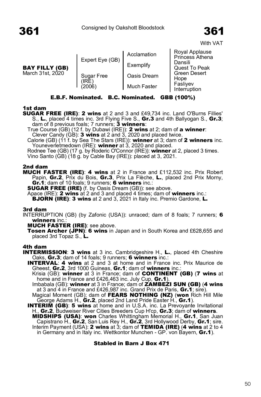 0141Y58.GUI 00Sugar Free (IRE)|2020|F|A|2747356 361 361 Consigned by Oakshott Bloodstock With VAT Expert Eye (GB) BAY FILLY (GB) March 31st, 2020 Sugar Free (IRE) (2006) Acclamation Exemplify Oasis Dream Much Faster Royal Applause Princess Athena Dansili Quest To Peak Green Desert Hope Fasliyev Interruption E.B.F. Nominated. B.C. Nominated. GBB (100%) 1st dam SUGAR FREE (IRE): 2 wins at 2 and 3 and 49,734 inc. Land O Burns Fillies S., L., placed 4 times inc. 3rd Flying Five S., Gr.3 and 4th Ballyogan S., Gr.3; dam of 8 previous foals; 7 runners; 3 winners: True Course (GB) (12 f. by Dubawi (IRE)): 2 wins at 2; dam of a winner: Clever Candy (GB): 3 wins at 2 and 3, 2020 and placed twice. Calorie (GB) (11 f. by Sea The Stars (IRE)): winner at 3; dam of 2 winners inc. Youneverletmedown (IRE): winner at 3, 2020 and placed. Rodnee Tee (GB) (17 g. by Roderic O Connor (IRE)): winner at 2, placed 3 times. Vino Santo (GB) (18 g. by Cable Bay (IRE)): placed at 3, 2021. 2nd dam MUCH FASTER (IRE): 4 wins at 2 in France and 112,532 inc. Prix Robert Papin, Gr.2, Prix du Bois, Gr.3, Prix La Flche, L., placed 2nd Prix Morny, Gr.1; dam of 10 foals; 9 runners; 6 winners inc.: SUGAR FREE (IRE) (f. by Oasis Dream (GB)): see above. Apace (IRE): 2 wins at 2 and 3 and placed 4 times; dam of winners inc.: BJORN (IRE): 3 wins at 2 and 3, 2021 in Italy inc. Premio Gardone, L. 3rd dam INTERRUPTION (GB) (by Zafonic (USA)): unraced; dam of 8 foals; 7 runners; 6 winners inc.: MUCH FASTER (IRE): see above. Tosen Archer (JPN): 6 wins in Japan and in South Korea and 628,655 and placed 3rd Topaz S., L. 4th dam INTERMISSION: 3 wins at 3 inc. Cambridgeshire H., L., placed 4th Cheshire Oaks, Gr.3; dam of 14 foals; 9 runners; 6 winners inc.: INTERVAL: 4 wins at 2 and 3 at home and in France inc. Prix Maurice de Gheest, Gr.2, 3rd 1000 Guineas, Gr.1; dam of winners inc.: Krisia (GB): winner at 3 in France; dam of CONTINENT (GB) (7 wins at home and in France and 426,463 inc. July Cup, Gr.1). Imbabala (GB): winner at 3 in France; dam of ZAMBEZI SUN (GB) (4 wins at 3 and 4 in France and 426,987 inc. Grand Prix de Paris, Gr.1; sire). Magical Moment (GB); dam of FEARS NOTHING (NZ) (won Rich Hill Mile George Adams H., Gr.2, placed 2nd Land Pride Easter H., Gr.1). INTERIM (GB): 5 wins at home and in U.S.A. inc. La Prevoyante Invitational H., Gr.2, Budweiser River Cities Breeders Cup H cp, Gr.3; dam of winners. MIDSHIPS (USA): won Charles Whittingham Memorial H., Gr.1, San Juan Capistrano H., Gr.2, San Luis Rey H., Gr.2, 3rd Hollywood Derby, Gr.1; sire. Interim Payment (USA): 2 wins at 3; dam of TEMIDA (IRE) (4 wins at 2 to 4 in Germany and in Italy inc. Wettkontor Munchen - GP. von Bayern, Gr.1). Stabled in Barn Box Stabled in Barn J Box 471 50