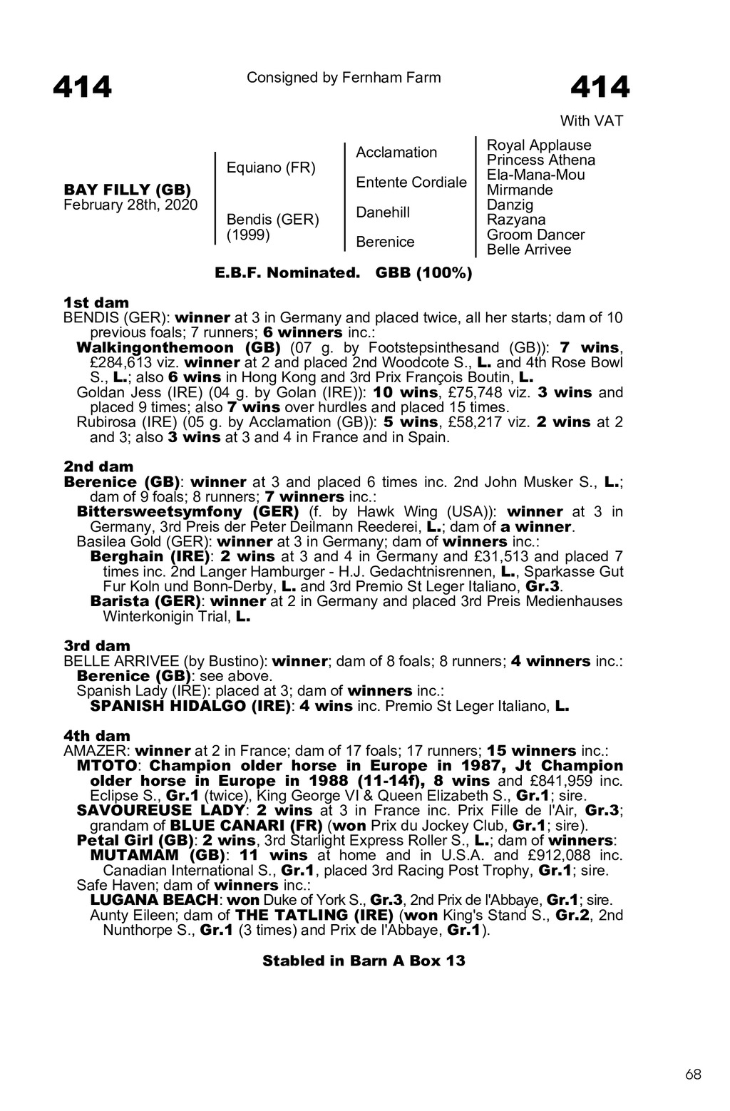 0007Z93.GUJ 00Bendis (GER)|2020|F|A|2743820 414 Consigned by Fernham Farm 414 With VAT Equiano (FR) BAY FILLY (GB) February 28th, 2020 Bendis (GER) (1999) Acclamation Entente Cordiale Danehill Berenice Royal Applause Princess Athena Ela-Mana-Mou Mirmande Danzig Razyana Groom Dancer Belle Arrivee E.B.F. Nominated. GBB (100%) 1st dam BENDIS (GER): winner at 3 in Germany and placed twice, all her starts; dam of 10 previous foals; 7 runners; 6 winners inc.: Walkingonthemoon (GB) (07 g. by Footstepsinthesand (GB)): 7 wins, 284,613 viz. winner at 2 and placed 2nd Woodcote S., L. and 4th Rose Bowl S., L.; also 6 wins in Hong Kong and 3rd Prix Franois Boutin, L. Goldan Jess (IRE) (04 g. by Golan (IRE)): 10 wins, 75,748 viz. 3 wins and placed 9 times; also 7 wins over hurdles and placed 15 times. Rubirosa (IRE) (05 g. by Acclamation (GB)): 5 wins, 58,217 viz. 2 wins at 2 and 3; also 3 wins at 3 and 4 in France and in Spain. 2nd dam Berenice (GB): winner at 3 and placed 6 times inc. 2nd John Musker S., L.; dam of 9 foals; 8 runners; 7 winners inc.: Bittersweetsymfony (GER) (f. by Hawk Wing (USA)): winner at 3 in Germany, 3rd Preis der Peter Deilmann Reederei, L.; dam of a winner. Basilea Gold (GER): winner at 3 in Germany; dam of winners inc.: Berghain (IRE): 2 wins at 3 and 4 in Germany and 31,513 and placed 7 times inc. 2nd Langer Hamburger - H.J. Gedachtnisrennen, L., Sparkasse Gut Fur Koln und Bonn-Derby, L. and 3rd Premio St Leger Italiano, Gr.3. Barista (GER): winner at 2 in Germany and placed 3rd Preis Medienhauses Winterkonigin Trial, L. 3rd dam BELLE ARRIVEE (by Bustino): winner; dam of 8 foals; 8 runners; 4 winners inc.: Berenice (GB): see above. Spanish Lady (IRE): placed at 3; dam of winners inc.: SPANISH HIDALGO (IRE): 4 wins inc. Premio St Leger Italiano, L. 4th dam AMAZER: winner at 2 in France; dam of 17 foals; 17 runners; 15 winners inc.: MTOTO: Champion older horse in Europe in 1987, Jt Champion older horse in Europe in 1988 (11-14f), 8 wins and 841,959 inc. Eclipse S., Gr.1 (twice), King George VI & Queen Elizabeth S., Gr.1; sire. SAVOUREUSE LADY: 2 wins at 3 in France inc. Prix Fille de l Air, Gr.3; grandam of BLUE CANARI (FR) (won Prix du Jockey Club, Gr.1; sire). Petal Girl (GB): 2 wins, 3rd Starlight Express Roller S., L.; dam of winners: MUTAMAM (GB): 11 wins at home and in U.S.A. and 912,088 inc. Canadian International S., Gr.1, placed 3rd Racing Post Trophy, Gr.1; sire. Safe Haven; dam of winners inc.: LUGANA BEACH: won Duke of York S., Gr.3, 2nd Prix de l Abbaye, Gr.1; sire. Aunty Eileen; dam of THE TATLING (IRE) (won King s Stand S., Gr.2, 2nd Nunthorpe S., Gr.1 (3 times) and Prix de l Abbaye, Gr.1). Stabled in Barn Box Stabled in Barn A Box 13 68