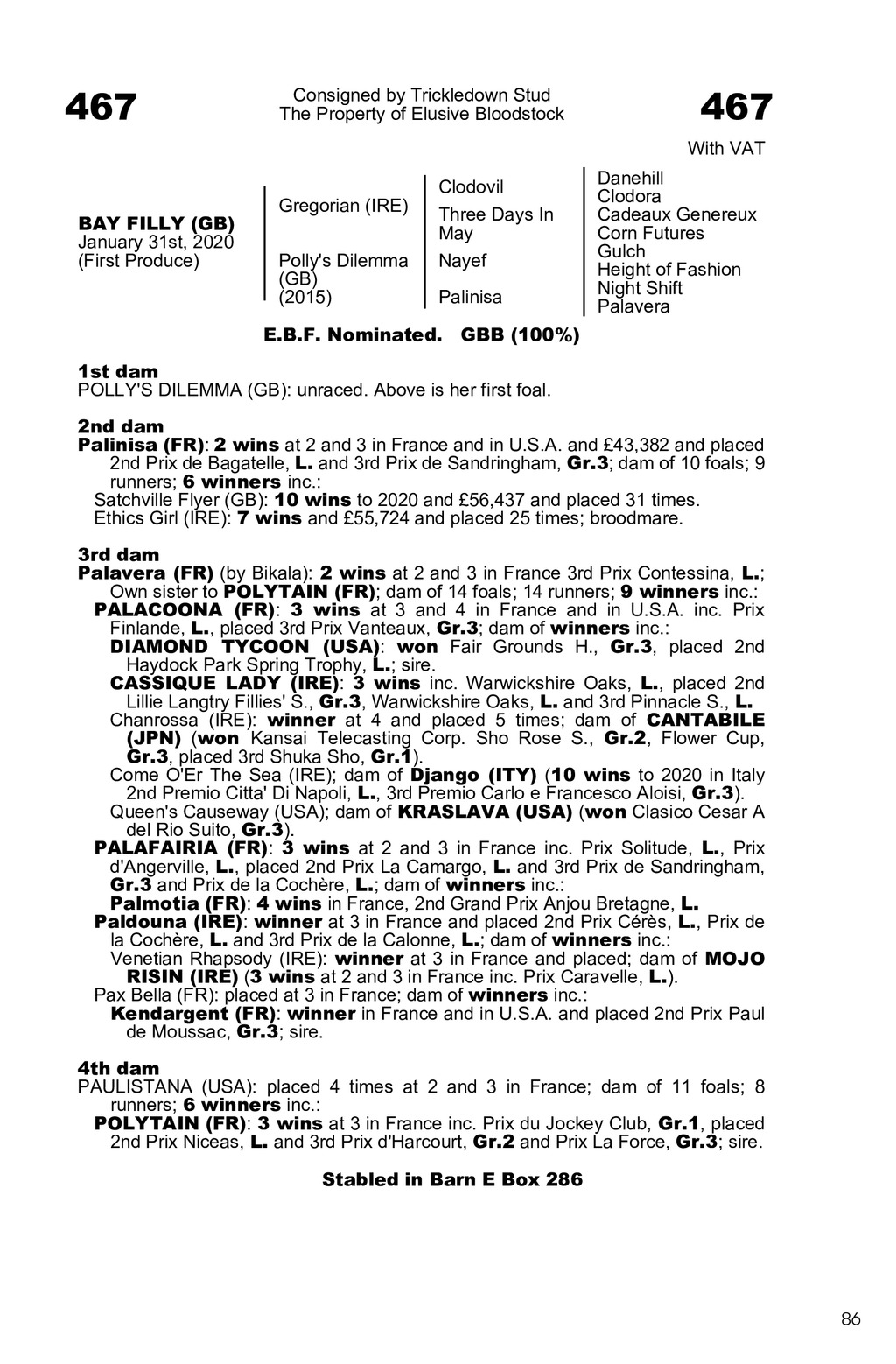 0032Z68.GUJ 00Polly s Dilemma (GB)|2020|F|A|2742597 467 Consigned by Trickledown Stud The Property of Elusive Bloodstock 467 With VAT BAY FILLY (GB) January 31st, 2020 (First Produce) Gregorian (IRE) Polly s Dilemma (GB) (2015) Clodovil Three Days In May Nayef Palinisa Danehill Clodora Cadeaux Genereux Corn Futures Gulch Height of Fashion Night Shift Palavera E.B.F. Nominated. GBB (100%) 1st dam POLLY S DILEMMA (GB): unraced. Above is her first foal. 2nd dam Palinisa (FR): 2 wins at 2 and 3 in France and in U.S.A. and 43,382 and placed 2nd Prix de Bagatelle, L. and 3rd Prix de Sandringham, Gr.3; dam of 10 foals; 9 runners; 6 winners inc.: Satchville Flyer (GB): 10 wins to 2020 and 56,437 and placed 31 times. Ethics Girl (IRE): 7 wins and 55,724 and placed 25 times; broodmare. 3rd dam Palavera (FR) (by Bikala): 2 wins at 2 and 3 in France 3rd Prix Contessina, L.; Own sister to POLYTAIN (FR); dam of 14 foals; 14 runners; 9 winners inc.: PALACOONA (FR): 3 wins at 3 and 4 in France and in U.S.A. inc. Prix Finlande, L., placed 3rd Prix Vanteaux, Gr.3; dam of winners inc.: DIAMOND TYCOON (USA): won Fair Grounds H., Gr.3, placed 2nd Haydock Park Spring Trophy, L.; sire. CASSIQUE LADY (IRE): 3 wins inc. Warwickshire Oaks, L., placed 2nd Lillie Langtry Fillies S., Gr.3, Warwickshire Oaks, L. and 3rd Pinnacle S., L. Chanrossa (IRE): winner at 4 and placed 5 times; dam of CANTABILE (JPN) (won Kansai Telecasting Corp. Sho Rose S., Gr.2, Flower Cup, Gr.3, placed 3rd Shuka Sho, Gr.1). Come O Er The Sea (IRE); dam of Django (ITY) (10 wins to 2020 in Italy 2nd Premio Citta Di Napoli, L., 3rd Premio Carlo e Francesco Aloisi, Gr.3). Queen s Causeway (USA); dam of KRASLAVA (USA) (won Clasico Cesar A del Rio Suito, Gr.3). PALAFAIRIA (FR): 3 wins at 2 and 3 in France inc. Prix Solitude, L., Prix d Angerville, L., placed 2nd Prix La Camargo, L. and 3rd Prix de Sandringham, Gr.3 and Prix de la Cochre, L.; dam of winners inc.: Palmotia (FR): 4 wins in France, 2nd Grand Prix Anjou Bretagne, L. Paldouna (IRE): winner at 3 in France and placed 2nd Prix Crs, L., Prix de la Cochre, L. and 3rd Prix de la Calonne, L.; dam of winners inc.: Venetian Rhapsody (IRE): winner at 3 in France and placed; dam of MOJO RISIN (IRE) (3 wins at 2 and 3 in France inc. Prix Caravelle, L.). Pax Bella (FR): placed at 3 in France; dam of winners inc.: Kendargent (FR): winner in France and in U.S.A. and placed 2nd Prix Paul de Moussac, Gr.3; sire. 4th dam PAULISTANA (USA): placed 4 times at 2 and 3 in France; dam of 11 foals; 8 runners; 6 winners inc.: POLYTAIN (FR): 3 wins at 3 in France inc. Prix du Jockey Club, Gr.1, placed 2nd Prix Niceas, L. and 3rd Prix d Harcourt, Gr.2 and Prix La Force, Gr.3; sire. Stabled in Barn Box Stabled in Barn E Box 286 86