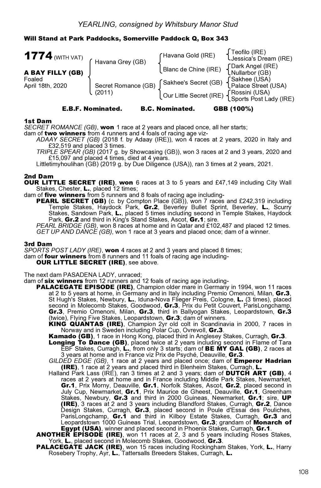 YEARLING, consigned by Whitsbury Manor Stud Will Stand at Park Paddocks, Somerville Paddock Q, Box 343 1774 (WITH VAT) A BAY FILLY (GB) Foaled April 18th, 2020 Havana Grey (GB) Secret Romance (GB) (2011) E.B.F. Nominated. Havana Gold (IRE) Blanc de Chine (IRE) Sakhee s Secret (GB) Our Little Secret (IRE) B.C. Nominated. Teofilo (IRE) Jessica s Dream (IRE) Dark Angel (IRE) Nullarbor (GB) Sakhee (USA) Palace Street (USA) Rossini (USA) Sports Post Lady (IRE) GBB (100%) 1st Dam SECRET ROMANCE (GB), won 1 race at 2 years and placed once, all her starts; dam of two winners from 4 runners and 4 foals of racing age vizADAAY SECRET (GB) (2018 f. by Adaay (IRE)), won 4 races at 2 years, 2020 in Italy and 32,519 and placed 3 times. TRIPLE SPEAR (GB) (2017 g. by Showcasing (GB)), won 3 races at 2 and 3 years, 2020 and 15,097 and placed 4 times, died at 4 years. Littletimyhoulihan (GB) (2019 g. by Due Diligence (USA)), ran 3 times at 2 years, 2021. 2nd Dam OUR LITTLE SECRET (IRE), won 6 races at 3 to 5 years and 47,149 including City Wall Stakes, Chester, L., placed 12 times; dam of five winners from 5 runners and 8 foals of racing age includingPEARL SECRET (GB) (c. by Compton Place (GB)), won 7 races and 242,319 including Temple Stakes, Haydock Park, Gr.2, Beverley Bullet Sprint, Beverley, L., Scurry Stakes, Sandown Park, L., placed 5 times including second in Temple Stakes, Haydock Park, Gr.2 and third in King s Stand Stakes, Ascot, Gr.1; sire. PEARL BRIDGE (GB), won 8 races at home and in Qatar and 102,487 and placed 12 times. GET UP AND DANCE (GB), won 1 race at 3 years and placed once; dam of a winner. 3rd Dam SPORTS POST LADY (IRE), won 4 races at 2 and 3 years and placed 8 times; dam of four winners from 8 runners and 11 foals of racing age includingOUR LITTLE SECRET (IRE), see above. The next dam PASADENA LADY, unraced; dam of six winners from 12 runners and 12 foals of racing age includingPALACEGATE EPISODE (IRE), Champion older mare in Germany in 1994, won 11 races at 2 to 5 years at home, in Germany and in Italy including Premio Omenoni, Milan, Gr.3, St Hugh s Stakes, Newbury, L., Iduna-Nova Flieger Preis, Cologne, L. (3 times), placed second in Molecomb Stakes, Goodwood, Gr.3, Prix du Petit Couvert, ParisLongchamp, Gr.3, Premio Omenoni, Milan, Gr.3, third in Ballyogan Stakes, Leopardstown, Gr.3 (twice), Flying Five Stakes, Leopardstown, Gr.3; dam of winners. KING QUANTAS (IRE), Champion 2yr old colt in Scandinavia in 2000, 7 races in Norway and in Sweden including Polar Cup, Ovrevoll, Gr.3. Kamado (GB), 1 race in Hong Kong, placed third in Anglesey Stakes, Curragh, Gr.3. Longing To Dance (GB), placed twice at 2 years including second in Flame of Tara EBF Stakes, Curragh, L., from only 3 starts; dam of BE MY GAL (GB), 2 races at 3 years at home and in France viz Prix de Psych, Deauville, Gr.3. GILDED EDGE (GB), 1 race at 2 years and placed once; dam of Emperor Hadrian (IRE), 1 race at 2 years and placed third in Blenheim Stakes, Curragh, L. Halland Park Lass (IRE), ran 3 times at 2 and 3 years; dam of DUTCH ART (GB), 4 races at 2 years at home and in France including Middle Park Stakes, Newmarket, Gr.1, Prix Morny, Deauville, Gr.1, Norfolk Stakes, Ascot, Gr.2, placed second in July Cup, Newmarket, Gr.1, Prix Maurice de Gheest, Deauville, Gr.1, Greenham Stakes, Newbury, Gr.3 and third in 2000 Guineas, Newmarket, Gr.1; sire, UP (IRE), 3 races at 2 and 3 years including Blandford Stakes, Curragh, Gr.2, Dance Design Stakes, Curragh, Gr.3, placed second in Poule d Essai des Pouliches, ParisLongchamp, Gr.1 and third in Kilboy Estate Stakes, Curragh, Gr.3 and Leopardstown 1000 Guineas Trial, Leopardstown, Gr.3; grandam of Monarch of Egypt (USA), winner and placed second in Phoenix Stakes, Curragh, Gr.1. ANOTHER EPISODE (IRE), won 11 races at 2, 3 and 5 years including Roses Stakes, York, L., placed second in Molecomb Stakes, Goodwood, Gr.3. PALACEGATE JACK (IRE), won 15 races including Rockingham Stakes, York, L., Harry Rosebery Trophy, Ayr, L., Tattersalls Breeders Stakes, Curragh, L. 108
