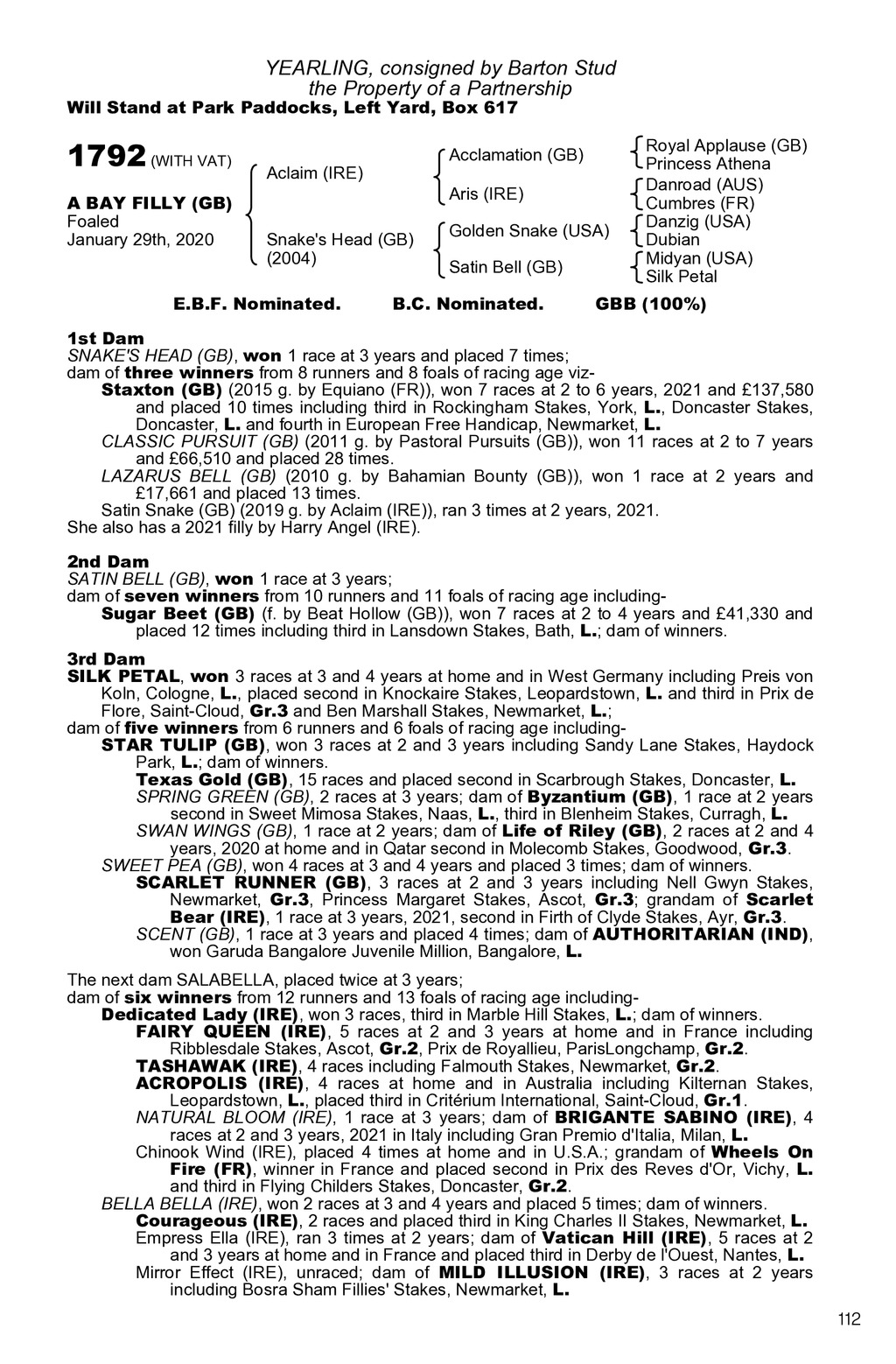 YEARLING, consigned by Barton Stud the Property of a Partnership Will Stand at Park Paddocks, Left Yard, Box 617 1792 (WITH VAT) A BAY FILLY (GB) Foaled January 29th, 2020 Acclamation (GB) Aclaim (IRE) Aris (IRE) Snake s Head (GB) (2004) E.B.F. Nominated. Golden Snake (USA) Satin Bell (GB) B.C. Nominated. Royal Applause (GB) Princess Athena Danroad (AUS) Cumbres (FR) Danzig (USA) Dubian Midyan (USA) Silk Petal GBB (100%) 1st Dam SNAKE S HEAD (GB), won 1 race at 3 years and placed 7 times; dam of three winners from 8 runners and 8 foals of racing age vizStaxton (GB) (2015 g. by Equiano (FR)), won 7 races at 2 to 6 years, 2021 and 137,580 and placed 10 times including third in Rockingham Stakes, York, L., Doncaster Stakes, Doncaster, L. and fourth in European Free Handicap, Newmarket, L. CLASSIC PURSUIT (GB) (2011 g. by Pastoral Pursuits (GB)), won 11 races at 2 to 7 years and 66,510 and placed 28 times. LAZARUS BELL (GB) (2010 g. by Bahamian Bounty (GB)), won 1 race at 2 years and 17,661 and placed 13 times. Satin Snake (GB) (2019 g. by Aclaim (IRE)), ran 3 times at 2 years, 2021. She also has a 2021 filly by Harry Angel (IRE). 2nd Dam SATIN BELL (GB), won 1 race at 3 years; dam of seven winners from 10 runners and 11 foals of racing age includingSugar Beet (GB) (f. by Beat Hollow (GB)), won 7 races at 2 to 4 years and 41,330 and placed 12 times including third in Lansdown Stakes, Bath, L.; dam of winners. 3rd Dam SILK PETAL, won 3 races at 3 and 4 years at home and in West Germany including Preis von Koln, Cologne, L., placed second in Knockaire Stakes, Leopardstown, L. and third in Prix de Flore, Saint-Cloud, Gr.3 and Ben Marshall Stakes, Newmarket, L.; dam of five winners from 6 runners and 6 foals of racing age includingSTAR TULIP (GB), won 3 races at 2 and 3 years including Sandy Lane Stakes, Haydock Park, L.; dam of winners. Texas Gold (GB), 15 races and placed second in Scarbrough Stakes, Doncaster, L. SPRING GREEN (GB), 2 races at 3 years; dam of Byzantium (GB), 1 race at 2 years second in Sweet Mimosa Stakes, Naas, L., third in Blenheim Stakes, Curragh, L. SWAN WINGS (GB), 1 race at 2 years; dam of Life of Riley (GB), 2 races at 2 and 4 years, 2020 at home and in Qatar second in Molecomb Stakes, Goodwood, Gr.3. SWEET PEA (GB), won 4 races at 3 and 4 years and placed 3 times; dam of winners. SCARLET RUNNER (GB), 3 races at 2 and 3 years including Nell Gwyn Stakes, Newmarket, Gr.3, Princess Margaret Stakes, Ascot, Gr.3; grandam of Scarlet Bear (IRE), 1 race at 3 years, 2021, second in Firth of Clyde Stakes, Ayr, Gr.3. SCENT (GB), 1 race at 3 years and placed 4 times; dam of AUTHORITARIAN (IND), won Garuda Bangalore Juvenile Million, Bangalore, L. The next dam SALABELLA, placed twice at 3 years; dam of six winners from 12 runners and 13 foals of racing age includingDedicated Lady (IRE), won 3 races, third in Marble Hill Stakes, L.; dam of winners. FAIRY QUEEN (IRE), 5 races at 2 and 3 years at home and in France including Ribblesdale Stakes, Ascot, Gr.2, Prix de Royallieu, ParisLongchamp, Gr.2. TASHAWAK (IRE), 4 races including Falmouth Stakes, Newmarket, Gr.2. ACROPOLIS (IRE), 4 races at home and in Australia including Kilternan Stakes, Leopardstown, L., placed third in Critrium International, Saint-Cloud, Gr.1. NATURAL BLOOM (IRE), 1 race at 3 years; dam of BRIGANTE SABINO (IRE), 4 races at 2 and 3 years, 2021 in Italy including Gran Premio d Italia, Milan, L. Chinook Wind (IRE), placed 4 times at home and in U.S.A.; grandam of Wheels On Fire (FR), winner in France and placed second in Prix des Reves d Or, Vichy, L. and third in Flying Childers Stakes, Doncaster, Gr.2. BELLA BELLA (IRE), won 2 races at 3 and 4 years and placed 5 times; dam of winners. Courageous (IRE), 2 races and placed third in King Charles II Stakes, Newmarket, L. Empress Ella (IRE), ran 3 times at 2 years; dam of Vatican Hill (IRE), 5 races at 2 and 3 years at home and in France and placed third in Derby de l Ouest, Nantes, L. Mirror Effect (IRE), unraced; dam of MILD ILLUSION (IRE), 3 races at 2 years including Bosra Sham Fillies Stakes, Newmarket, L. 112