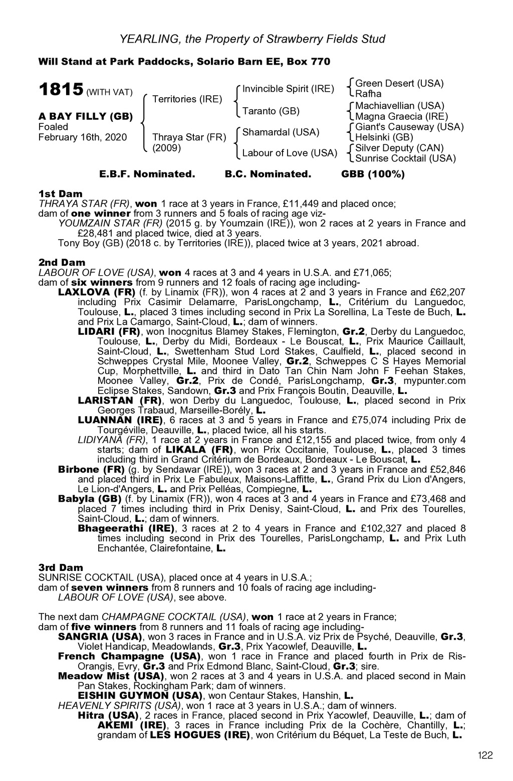YEARLING, the Property of Strawberry Fields Stud Will Stand at Park Paddocks, Solario Barn EE, Box 770 1815 (WITH VAT) A BAY FILLY (GB) Foaled February 16th, 2020 Invincible Spirit (IRE) Territories (IRE) Taranto (GB) Thraya Star (FR) (2009) E.B.F. Nominated. Shamardal (USA) Labour of Love (USA) B.C. Nominated. Green Desert (USA) Rafha Machiavellian (USA) Magna Graecia (IRE) Giant s Causeway (USA) Helsinki (GB) Silver Deputy (CAN) Sunrise Cocktail (USA) GBB (100%) 1st Dam THRAYA STAR (FR), won 1 race at 3 years in France, 11,449 and placed once; dam of one winner from 3 runners and 5 foals of racing age vizYOUMZAIN STAR (FR) (2015 g. by Youmzain (IRE)), won 2 races at 2 years in France and 28,481 and placed twice, died at 3 years. Tony Boy (GB) (2018 c. by Territories (IRE)), placed twice at 3 years, 2021 abroad. 2nd Dam LABOUR OF LOVE (USA), won 4 races at 3 and 4 years in U.S.A. and 71,065; dam of six winners from 9 runners and 12 foals of racing age includingLAXLOVA (FR) (f. by Linamix (FR)), won 4 races at 2 and 3 years in France and 62,207 including Prix Casimir Delamarre, ParisLongchamp, L., Critrium du Languedoc, Toulouse, L., placed 3 times including second in Prix La Sorellina, La Teste de Buch, L. and Prix La Camargo, Saint-Cloud, L.; dam of winners. LIDARI (FR), won Inocgnitus Blamey Stakes, Flemington, Gr.2, Derby du Languedoc, Toulouse, L., Derby du Midi, Bordeaux - Le Bouscat, L., Prix Maurice Caillault, Saint-Cloud, L., Swettenham Stud Lord Stakes, Caulfield, L., placed second in Schweppes Crystal Mile, Moonee Valley, Gr.2, Schweppes C S Hayes Memorial Cup, Morphettville, L. and third in Dato Tan Chin Nam John F Feehan Stakes, Moonee Valley, Gr.2, Prix de Cond, ParisLongchamp, Gr.3, mypunter.com Eclipse Stakes, Sandown, Gr.3 and Prix Franois Boutin, Deauville, L. LARISTAN (FR), won Derby du Languedoc, Toulouse, L., placed second in Prix Georges Trabaud, Marseille-Borly, L. LUANNAN (IRE), 6 races at 3 and 5 years in France and 75,074 including Prix de Tourgville, Deauville, L., placed twice, all his starts. LIDIYANA (FR), 1 race at 2 years in France and 12,155 and placed twice, from only 4 starts; dam of LIKALA (FR), won Prix Occitanie, Toulouse, L., placed 3 times including third in Grand Critrium de Bordeaux, Bordeaux - Le Bouscat, L. Birbone (FR) (g. by Sendawar (IRE)), won 3 races at 2 and 3 years in France and 52,846 and placed third in Prix Le Fabuleux, Maisons-Laffitte, L., Grand Prix du Lion d Angers, Le Lion-d Angers, L. and Prix Pellas, Compiegne, L. Babyla (GB) (f. by Linamix (FR)), won 4 races at 3 and 4 years in France and 73,468 and placed 7 times including third in Prix Denisy, Saint-Cloud, L. and Prix des Tourelles, Saint-Cloud, L.; dam of winners. Bhageerathi (IRE), 3 races at 2 to 4 years in France and 102,327 and placed 8 times including second in Prix des Tourelles, ParisLongchamp, L. and Prix Luth Enchante, Clairefontaine, L. 3rd Dam SUNRISE COCKTAIL (USA), placed once at 4 years in U.S.A.; dam of seven winners from 8 runners and 10 foals of racing age includingLABOUR OF LOVE (USA), see above. The next dam CHAMPAGNE COCKTAIL (USA), won 1 race at 2 years in France; dam of five winners from 8 runners and 11 foals of racing age includingSANGRIA (USA), won 3 races in France and in U.S.A. viz Prix de Psych, Deauville, Gr.3, Violet Handicap, Meadowlands, Gr.3, Prix Yacowlef, Deauville, L. French Champagne (USA), won 1 race in France and placed fourth in Prix de RisOrangis, Evry, Gr.3 and Prix Edmond Blanc, Saint-Cloud, Gr.3; sire. Meadow Mist (USA), won 2 races at 3 and 4 years in U.S.A. and placed second in Main Pan Stakes, Rockingham Park; dam of winners. EISHIN GUYMON (USA), won Centaur Stakes, Hanshin, L. HEAVENLY SPIRITS (USA), won 1 race at 3 years in U.S.A.; dam of winners. Hitra (USA), 2 races in France, placed second in Prix Yacowlef, Deauville, L.; dam of AKEMI (IRE), 3 races in France including Prix de la Cochre, Chantilly, L.; grandam of LES HOGUES (IRE), won Critrium du Bquet, La Teste de Buch, L. 122