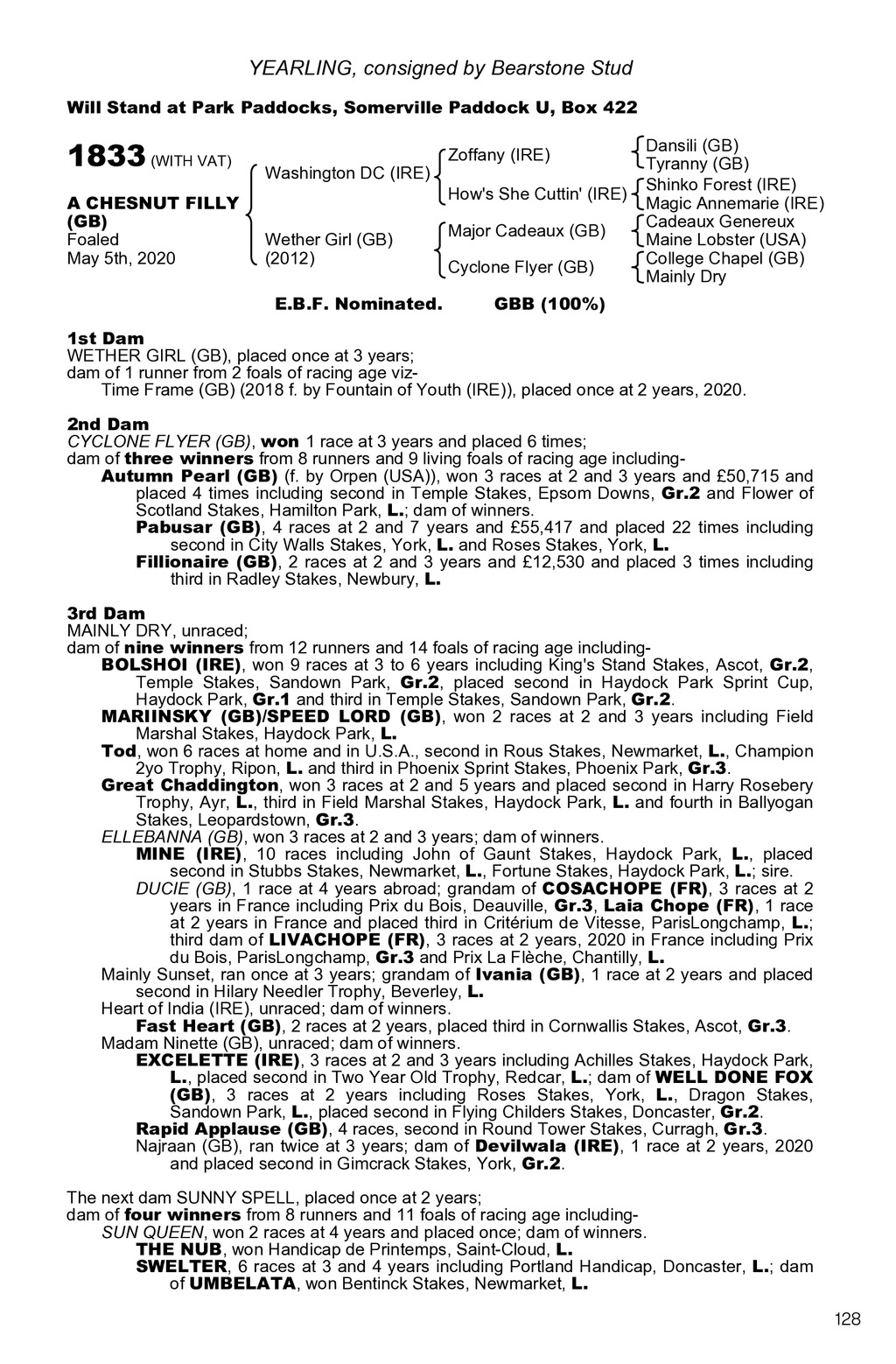 YEARLING, consigned by Bearstone Stud Will Stand at Park Paddocks, Somerville Paddock U, Box 422 1833 (WITH VAT) A CHESNUT FILLY (GB) Foaled May 5th, 2020 Washington DC (IRE) Wether Girl (GB) (2012) E.B.F. Nominated. Zoffany (IRE) How s She Cuttin (IRE) Major Cadeaux (GB) Cyclone Flyer (GB) Dansili (GB) Tyranny (GB) Shinko Forest (IRE) Magic Annemarie (IRE) Cadeaux Genereux Maine Lobster (USA) College Chapel (GB) Mainly Dry GBB (100%) 1st Dam WETHER GIRL (GB), placed once at 3 years; dam of 1 runner from 2 foals of racing age vizTime Frame (GB) (2018 f. by Fountain of Youth (IRE)), placed once at 2 years, 2020. 2nd Dam CYCLONE FLYER (GB), won 1 race at 3 years and placed 6 times; dam of three winners from 8 runners and 9 living foals of racing age includingAutumn Pearl (GB) (f. by Orpen (USA)), won 3 races at 2 and 3 years and 50,715 and placed 4 times including second in Temple Stakes, Epsom Downs, Gr.2 and Flower of Scotland Stakes, Hamilton Park, L.; dam of winners. Pabusar (GB), 4 races at 2 and 7 years and 55,417 and placed 22 times including second in City Walls Stakes, York, L. and Roses Stakes, York, L. Fillionaire (GB), 2 races at 2 and 3 years and 12,530 and placed 3 times including third in Radley Stakes, Newbury, L. 3rd Dam MAINLY DRY, unraced; dam of nine winners from 12 runners and 14 foals of racing age includingBOLSHOI (IRE), won 9 races at 3 to 6 years including King s Stand Stakes, Ascot, Gr.2, Temple Stakes, Sandown Park, Gr.2, placed second in Haydock Park Sprint Cup, Haydock Park, Gr.1 and third in Temple Stakes, Sandown Park, Gr.2. MARIINSKY (GB)/SPEED LORD (GB), won 2 races at 2 and 3 years including Field Marshal Stakes, Haydock Park, L. Tod, won 6 races at home and in U.S.A., second in Rous Stakes, Newmarket, L., Champion 2yo Trophy, Ripon, L. and third in Phoenix Sprint Stakes, Phoenix Park, Gr.3. Great Chaddington, won 3 races at 2 and 5 years and placed second in Harry Rosebery Trophy, Ayr, L., third in Field Marshal Stakes, Haydock Park, L. and fourth in Ballyogan Stakes, Leopardstown, Gr.3. ELLEBANNA (GB), won 3 races at 2 and 3 years; dam of winners. MINE (IRE), 10 races including John of Gaunt Stakes, Haydock Park, L., placed second in Stubbs Stakes, Newmarket, L., Fortune Stakes, Haydock Park, L.; sire. DUCIE (GB), 1 race at 4 years abroad; grandam of COSACHOPE (FR), 3 races at 2 years in France including Prix du Bois, Deauville, Gr.3, Laia Chope (FR), 1 race at 2 years in France and placed third in Critrium de Vitesse, ParisLongchamp, L.; third dam of LIVACHOPE (FR), 3 races at 2 years, 2020 in France including Prix du Bois, ParisLongchamp, Gr.3 and Prix La Flche, Chantilly, L. Mainly Sunset, ran once at 3 years; grandam of Ivania (GB), 1 race at 2 years and placed second in Hilary Needler Trophy, Beverley, L. Heart of India (IRE), unraced; dam of winners. Fast Heart (GB), 2 races at 2 years, placed third in Cornwallis Stakes, Ascot, Gr.3. Madam Ninette (GB), unraced; dam of winners. EXCELETTE (IRE), 3 races at 2 and 3 years including Achilles Stakes, Haydock Park, L., placed second in Two Year Old Trophy, Redcar, L.; dam of WELL DONE FOX (GB), 3 races at 2 years including Roses Stakes, York, L., Dragon Stakes, Sandown Park, L., placed second in Flying Childers Stakes, Doncaster, Gr.2. Rapid Applause (GB), 4 races, second in Round Tower Stakes, Curragh, Gr.3. Najraan (GB), ran twice at 3 years; dam of Devilwala (IRE), 1 race at 2 years, 2020 and placed second in Gimcrack Stakes, York, Gr.2. The next dam SUNNY SPELL, placed once at 2 years; dam of four winners from 8 runners and 11 foals of racing age includingSUN QUEEN, won 2 races at 4 years and placed once; dam of winners. THE NUB, won Handicap de Printemps, Saint-Cloud, L. SWELTER, 6 races at 3 and 4 years including Portland Handicap, Doncaster, L.; dam of UMBELATA, won Bentinck Stakes, Newmarket, L. 128