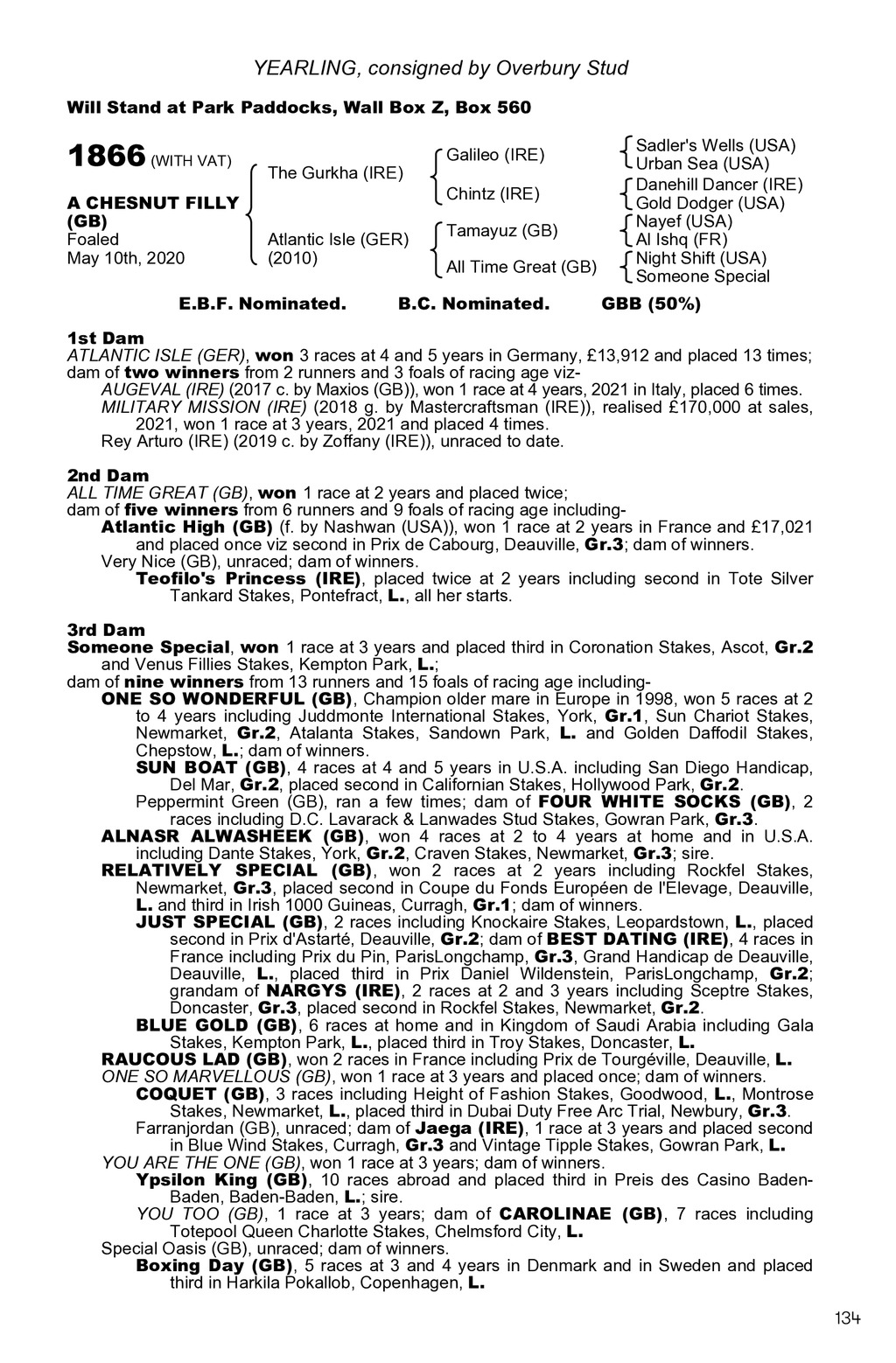 YEARLING, consigned by Overbury Stud Will Stand at Park Paddocks, Wall Box Z, Box 560 1866 (WITH VAT) A CHESNUT FILLY (GB) Foaled May 10th, 2020 The Gurkha (IRE) Atlantic Isle (GER) (2010) E.B.F. Nominated. Galileo (IRE) Chintz (IRE) Tamayuz (GB) All Time Great (GB) B.C. Nominated. Sadler s Wells (USA) Urban Sea (USA) Danehill Dancer (IRE) Gold Dodger (USA) Nayef (USA) Al Ishq (FR) Night Shift (USA) Someone Special GBB (50%) 1st Dam ATLANTIC ISLE (GER), won 3 races at 4 and 5 years in Germany, 13,912 and placed 13 times; dam of two winners from 2 runners and 3 foals of racing age vizAUGEVAL (IRE) (2017 c. by Maxios (GB)), won 1 race at 4 years, 2021 in Italy, placed 6 times. MILITARY MISSION (IRE) (2018 g. by Mastercraftsman (IRE)), realised 170,000 at sales, 2021, won 1 race at 3 years, 2021 and placed 4 times. Rey Arturo (IRE) (2019 c. by Zoffany (IRE)), unraced to date. 2nd Dam ALL TIME GREAT (GB), won 1 race at 2 years and placed twice; dam of five winners from 6 runners and 9 foals of racing age includingAtlantic High (GB) (f. by Nashwan (USA)), won 1 race at 2 years in France and 17,021 and placed once viz second in Prix de Cabourg, Deauville, Gr.3; dam of winners. Very Nice (GB), unraced; dam of winners. Teofilo s Princess (IRE), placed twice at 2 years including second in Tote Silver Tankard Stakes, Pontefract, L., all her starts. 3rd Dam Someone Special, won 1 race at 3 years and placed third in Coronation Stakes, Ascot, Gr.2 and Venus Fillies Stakes, Kempton Park, L.; dam of nine winners from 13 runners and 15 foals of racing age includingONE SO WONDERFUL (GB), Champion older mare in Europe in 1998, won 5 races at 2 to 4 years including Juddmonte International Stakes, York, Gr.1, Sun Chariot Stakes, Newmarket, Gr.2, Atalanta Stakes, Sandown Park, L. and Golden Daffodil Stakes, Chepstow, L.; dam of winners. SUN BOAT (GB), 4 races at 4 and 5 years in U.S.A. including San Diego Handicap, Del Mar, Gr.2, placed second in Californian Stakes, Hollywood Park, Gr.2. Peppermint Green (GB), ran a few times; dam of FOUR WHITE SOCKS (GB), 2 races including D.C. Lavarack & Lanwades Stud Stakes, Gowran Park, Gr.3. ALNASR ALWASHEEK (GB), won 4 races at 2 to 4 years at home and in U.S.A. including Dante Stakes, York, Gr.2, Craven Stakes, Newmarket, Gr.3; sire. RELATIVELY SPECIAL (GB), won 2 races at 2 years including Rockfel Stakes, Newmarket, Gr.3, placed second in Coupe du Fonds Europen de l Elevage, Deauville, L. and third in Irish 1000 Guineas, Curragh, Gr.1; dam of winners. JUST SPECIAL (GB), 2 races including Knockaire Stakes, Leopardstown, L., placed second in Prix d Astart, Deauville, Gr.2; dam of BEST DATING (IRE), 4 races in France including Prix du Pin, ParisLongchamp, Gr.3, Grand Handicap de Deauville, Deauville, L., placed third in Prix Daniel Wildenstein, ParisLongchamp, Gr.2; grandam of NARGYS (IRE), 2 races at 2 and 3 years including Sceptre Stakes, Doncaster, Gr.3, placed second in Rockfel Stakes, Newmarket, Gr.2. BLUE GOLD (GB), 6 races at home and in Kingdom of Saudi Arabia including Gala Stakes, Kempton Park, L., placed third in Troy Stakes, Doncaster, L. RAUCOUS LAD (GB), won 2 races in France including Prix de Tourgville, Deauville, L. ONE SO MARVELLOUS (GB), won 1 race at 3 years and placed once; dam of winners. COQUET (GB), 3 races including Height of Fashion Stakes, Goodwood, L., Montrose Stakes, Newmarket, L., placed third in Dubai Duty Free Arc Trial, Newbury, Gr.3. Farranjordan (GB), unraced; dam of Jaega (IRE), 1 race at 3 years and placed second in Blue Wind Stakes, Curragh, Gr.3 and Vintage Tipple Stakes, Gowran Park, L. YOU ARE THE ONE (GB), won 1 race at 3 years; dam of winners. Ypsilon King (GB), 10 races abroad and placed third in Preis des Casino BadenBaden, Baden-Baden, L.; sire. YOU TOO (GB), 1 race at 3 years; dam of CAROLINAE (GB), 7 races including Totepool Queen Charlotte Stakes, Chelmsford City, L. Special Oasis (GB), unraced; dam of winners. Boxing Day (GB), 5 races at 3 and 4 years in Denmark and in Sweden and placed third in Harkila Pokallob, Copenhagen, L. 134