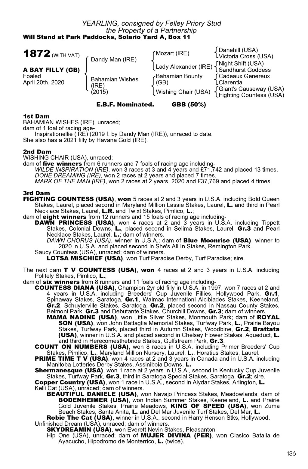 YEARLING, consigned by Felley Priory Stud the Property of a Partnership Will Stand at Park Paddocks, Solario Yard A, Box 11 1872 (WITH VAT) A BAY FILLY (GB) Foaled April 20th, 2020 Dandy Man (IRE) Bahamian Wishes (IRE) (2015) E.B.F. Nominated. Mozart (IRE) Lady Alexander (IRE) Bahamian Bounty (GB) Wishing Chair (USA) Danehill (USA) Victoria Cross (USA) Night Shift (USA) Sandhurst Goddess Cadeaux Genereux Clarentia Giant s Causeway (USA) Fighting Countess (USA) GBB (50%) 1st Dam BAHAMIAN WISHES (IRE), unraced; dam of 1 foal of racing ageInspirationellie (IRE) (2019 f. by Dandy Man (IRE)), unraced to date. She also has a 2021 filly by Havana Gold (IRE). 2nd Dam WISHING CHAIR (USA), unraced; dam of five winners from 6 runners and 7 foals of racing age includingWILDE INSPIRATION (IRE), won 3 races at 3 and 4 years and 71,742 and placed 13 times. DONE DREAMING (IRE), won 2 races at 2 years and placed 7 times. MARK OF THE MAN (IRE), won 2 races at 2 years, 2020 and 37,769 and placed 4 times. 3rd Dam FIGHTING COUNTESS (USA), won 5 races at 2 and 3 years in U.S.A. including Bold Queen Stakes, Laurel, placed second in Maryland Million Lassie Stakes, Laurel, L. and third in Pearl Necklace Stakes, Laurel, L.R. and Twixt Stakes, Pimlico, L.; dam of eight winners from 12 runners and 15 foals of racing age includingDAWN PRINCESS (USA), won 4 races at 2 and 3 years in U.S.A. including Tippett Stakes, Colonial Downs, L., placed second in Selima Stakes, Laurel, Gr.3 and Pearl Necklace Stakes, Laurel, L.; dam of winners. DAWN CHORUS (USA), winner in U.S.A.; dam of Blue Moonrise (USA), winner to 2020 in U.S.A. and placed second in She s All In Stakes, Remington Park. Saucy Countess (USA), unraced; dam of winners. LOTSA MISCHIEF (USA), won Turf Paradise Derby, Turf Paradise; sire. The next dam T V COUNTESS (USA), won 4 races at 2 and 3 years in U.S.A. including Politely Stakes, Pimlico, L.; dam of six winners from 8 runners and 11 foals of racing age includingCOUNTESS DIANA (USA), Champion 2yr old filly in U.S.A. in 1997, won 7 races at 2 and 4 years in U.S.A. including Breeders Cup Juvenile Fillies, Hollywood Park, Gr.1, Spinaway Stakes, Saratoga, Gr.1, Walmac Internationl Alcibiades Stakes, Keeneland, Gr.2, Schuylerville Stakes, Saratoga, Gr.2, placed second in Nassau County Stakes, Belmont Park, Gr.3 and Debutante Stakes, Churchill Downs, Gr.3; dam of winners. MAMA NADINE (USA), won Little Silver Stakes, Monmouth Park; dam of ROYAL SON (USA), won John Battaglia Memorial Stakes, Turfway Park, L., Prairie Bayou Stakes, Turfway Park, placed third in Autumn Stakes, Woodbine, Gr.2, Brattata (USA), winner in U.S.A. and placed second in Chelsey Flower Stakes, Aqueduct, L. and third in Herecomesthebride Stakes, Gulfstream Park, Gr.3. COUNT ON NUMBERS (USA), won 8 races in U.S.A. including Primer Breeders Cup Stakes, Pimlico, L., Maryland Million Nursery, Laurel, L., Horatius Stakes, Laurel. PRIME TIME T V (USA), won 4 races at 2 and 3 years in Canada and in U.S.A. including Manitoba Lotteries Derby Stakes, Assiniboia Downs, L. Shermanesque (USA), won 1 race at 2 years in U.S.A., second in Kentucky Cup Juvenile Stakes, Turfway Park, Gr.3, third in Saratoga Special Stakes, Saratoga, Gr.2; sire. Copper Country (USA), won 1 race in U.S.A., second in Alydar Stakes, Arlington, L. Kelli Cat (USA), unraced; dam of winners. BEAUTIFUL DANIELE (USA), won Navajo Princess Stakes, Meadowlands; dam of BODENHEIMER (USA), won Indian Summer Stakes, Keeneland, L. and Prairie Gold Juvenile Stakes, Prairie Meadows, KING OF SPEED (USA), won Zuma Beach Stakes, Santa Anita, L. and Del Mar Juvenile Turf Stakes, Del Mar, L. Robie The Cat (USA), winner in U.S.A., second in Harry Henson Stks, Hollywood. Unfinished Dream (USA), unraced; dam of winners. SKYDREAMIN (USA), won Everett Nevin Stakes, Pleasanton Hip One (USA), unraced; dam of MUJER DIVINA (PER), won Clasico Batalla de Ayacucho, Hipodromo de Monterrico, L. (twice). 136
