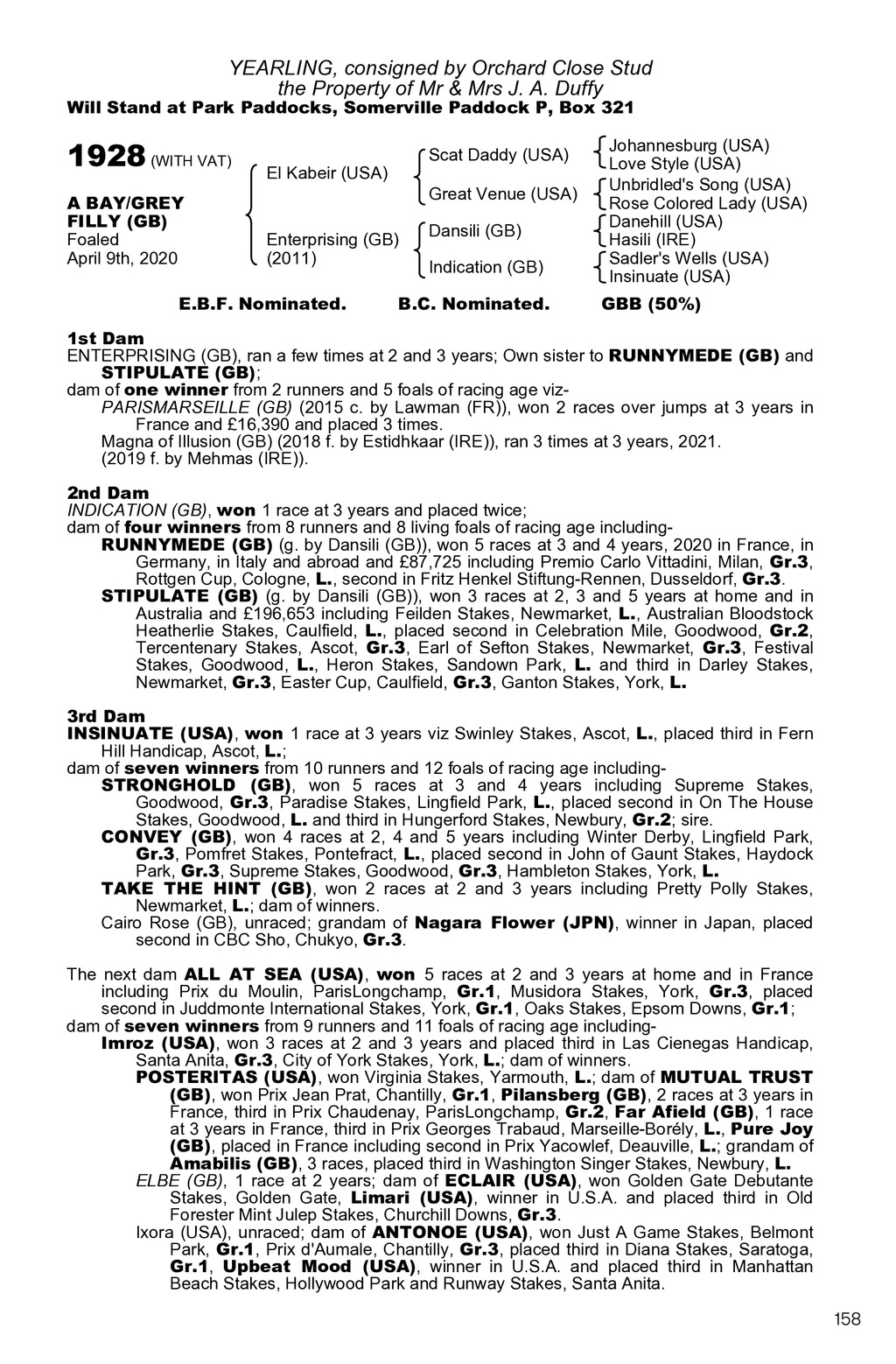 YEARLING, consigned by Orchard Close Stud the Property of Mr & Mrs J. A. Duffy Will Stand at Park Paddocks, Somerville Paddock P, Box 321 1928 (WITH VAT) A BAY/GREY FILLY (GB) Foaled April 9th, 2020 Scat Daddy (USA) El Kabeir (USA) Great Venue (USA) Enterprising (GB) (2011) E.B.F. Nominated. Dansili (GB) Indication (GB) B.C. Nominated. Johannesburg (USA) Love Style (USA) Unbridled s Song (USA) Rose Colored Lady (USA) Danehill (USA) Hasili (IRE) Sadler s Wells (USA) Insinuate (USA) GBB (50%) 1st Dam ENTERPRISING (GB), ran a few times at 2 and 3 years; Own sister to RUNNYMEDE (GB) and STIPULATE (GB); dam of one winner from 2 runners and 5 foals of racing age vizPARISMARSEILLE (GB) (2015 c. by Lawman (FR)), won 2 races over jumps at 3 years in France and 16,390 and placed 3 times. Magna of Illusion (GB) (2018 f. by Estidhkaar (IRE)), ran 3 times at 3 years, 2021. (2019 f. by Mehmas (IRE)). 2nd Dam INDICATION (GB), won 1 race at 3 years and placed twice; dam of four winners from 8 runners and 8 living foals of racing age includingRUNNYMEDE (GB) (g. by Dansili (GB)), won 5 races at 3 and 4 years, 2020 in France, in Germany, in Italy and abroad and 87,725 including Premio Carlo Vittadini, Milan, Gr.3, Rottgen Cup, Cologne, L., second in Fritz Henkel Stiftung-Rennen, Dusseldorf, Gr.3. STIPULATE (GB) (g. by Dansili (GB)), won 3 races at 2, 3 and 5 years at home and in Australia and 196,653 including Feilden Stakes, Newmarket, L., Australian Bloodstock Heatherlie Stakes, Caulfield, L., placed second in Celebration Mile, Goodwood, Gr.2, Tercentenary Stakes, Ascot, Gr.3, Earl of Sefton Stakes, Newmarket, Gr.3, Festival Stakes, Goodwood, L., Heron Stakes, Sandown Park, L. and third in Darley Stakes, Newmarket, Gr.3, Easter Cup, Caulfield, Gr.3, Ganton Stakes, York, L. 3rd Dam INSINUATE (USA), won 1 race at 3 years viz Swinley Stakes, Ascot, L., placed third in Fern Hill Handicap, Ascot, L.; dam of seven winners from 10 runners and 12 foals of racing age includingSTRONGHOLD (GB), won 5 races at 3 and 4 years including Supreme Stakes, Goodwood, Gr.3, Paradise Stakes, Lingfield Park, L., placed second in On The House Stakes, Goodwood, L. and third in Hungerford Stakes, Newbury, Gr.2; sire. CONVEY (GB), won 4 races at 2, 4 and 5 years including Winter Derby, Lingfield Park, Gr.3, Pomfret Stakes, Pontefract, L., placed second in John of Gaunt Stakes, Haydock Park, Gr.3, Supreme Stakes, Goodwood, Gr.3, Hambleton Stakes, York, L. TAKE THE HINT (GB), won 2 races at 2 and 3 years including Pretty Polly Stakes, Newmarket, L.; dam of winners. Cairo Rose (GB), unraced; grandam of Nagara Flower (JPN), winner in Japan, placed second in CBC Sho, Chukyo, Gr.3. The next dam ALL AT SEA (USA), won 5 races at 2 and 3 years at home and in France including Prix du Moulin, ParisLongchamp, Gr.1, Musidora Stakes, York, Gr.3, placed second in Juddmonte International Stakes, York, Gr.1, Oaks Stakes, Epsom Downs, Gr.1; dam of seven winners from 9 runners and 11 foals of racing age includingImroz (USA), won 3 races at 2 and 3 years and placed third in Las Cienegas Handicap, Santa Anita, Gr.3, City of York Stakes, York, L.; dam of winners. POSTERITAS (USA), won Virginia Stakes, Yarmouth, L.; dam of MUTUAL TRUST (GB), won Prix Jean Prat, Chantilly, Gr.1, Pilansberg (GB), 2 races at 3 years in France, third in Prix Chaudenay, ParisLongchamp, Gr.2, Far Afield (GB), 1 race at 3 years in France, third in Prix Georges Trabaud, Marseille-Borly, L., Pure Joy (GB), placed in France including second in Prix Yacowlef, Deauville, L.; grandam of Amabilis (GB), 3 races, placed third in Washington Singer Stakes, Newbury, L. ELBE (GB), 1 race at 2 years; dam of ECLAIR (USA), won Golden Gate Debutante Stakes, Golden Gate, Limari (USA), winner in U.S.A. and placed third in Old Forester Mint Julep Stakes, Churchill Downs, Gr.3. Ixora (USA), unraced; dam of ANTONOE (USA), won Just A Game Stakes, Belmont Park, Gr.1, Prix d Aumale, Chantilly, Gr.3, placed third in Diana Stakes, Saratoga, Gr.1, Upbeat Mood (USA), winner in U.S.A. and placed third in Manhattan Beach Stakes, Hollywood Park and Runway Stakes, Santa Anita. 158