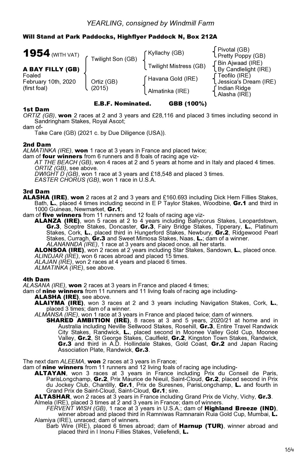YEARLING, consigned by Windmill Farm Will Stand at Park Paddocks, Highflyer Paddock N, Box 212A 1954 (WITH VAT) A BAY FILLY (GB) Foaled February 10th, 2020 (first foal) Twilight Son (GB) Ortiz (GB) (2015) Kyllachy (GB) Twilight Mistress (GB) Havana Gold (IRE) Almatinka (IRE) Pivotal (GB) Pretty Poppy (GB) Bin Ajwaad (IRE) By Candlelight (IRE) Teofilo (IRE) Jessica s Dream (IRE) Indian Ridge Alasha (IRE) E.B.F. Nominated. GBB (100%) 1st Dam ORTIZ (GB), won 2 races at 2 and 3 years and 28,116 and placed 3 times including second in Sandringham Stakes, Royal Ascot; dam ofTake Care (GB) (2021 c. by Due Diligence (USA)). 2nd Dam ALMATINKA (IRE), won 1 race at 3 years in France and placed twice; dam of four winners from 6 runners and 8 foals of racing age vizAT THE BEACH (GB), won 4 races at 2 and 5 years at home and in Italy and placed 4 times. ORTIZ (GB), see above. DWIGHT D (GB), won 1 race at 3 years and 18,548 and placed 3 times. EASTER CHORUS (GB), won 1 race in U.S.A. 3rd Dam ALASHA (IRE), won 2 races at 2 and 3 years and 160.693 including Dick Hern Fillies Stakes, Bath, L., placed 4 times including second in E P Taylor Stakes, Woodbine, Gr.1 and third in 1000 Guineas, Newmarket, Gr.1; dam of five winners from 11 runners and 12 foals of racing age vizALANZA (IRE), won 5 races at 2 to 4 years including Ballycorus Stakes, Leopardstown, Gr.3, Sceptre Stakes, Doncaster, Gr.3, Fairy Bridge Stakes, Tipperary, L., Platinum Stakes, Cork, L., placed third in Hungerford Stakes, Newbury, Gr.2, Ridgewood Pearl Stakes, Curragh, Gr.3 and Sweet Mimosa Stakes, Naas, L.; dam of a winner. ALANANNDA (IRE), 1 race at 3 years and placed once, all her starts. ALONSOA (IRE), won 2 races at 2 years including Star Stakes, Sandown, L., placed once. ALINDJAR (IRE), won 6 races abroad and placed 15 times. ALAJAN (IRE), won 2 races at 4 years and placed 6 times. ALMATINKA (IRE), see above. 4th Dam ALASANA (IRE), won 2 races at 3 years in France and placed 4 times; dam of nine winners from 11 runners and 11 living foals of racing age includingALASHA (IRE), see above. ALAIYMA (IRE), won 3 races at 2 and 3 years including Navigation Stakes, Cork, L., placed 3 times; dam of a winner. ALMANSA (IRE), won 1 race at 3 years in France and placed twice; dam of winners. SHARED AMBITION (IRE), 8 races at 3 and 5 years, 2020/21 at home and in Australia including Neville Sellwood Stakes, Rosehill, Gr.3, Entire Travel Randwick City Stakes, Randwick, L., placed second in Moonee Valley Gold Cup, Moonee Valley, Gr.2, St George Stakes, Caulfield, Gr.2, Kingston Town Stakes, Randwick, Gr.3 and third in A.D. Hollindale Stakes, Gold Coast, Gr.2 and Japan Racing Association Plate, Randwick, Gr.3. The next dam ALEEMA, won 2 races at 3 years in France; dam of nine winners from 11 runners and 12 living foals of racing age includingALTAYAN, won 3 races at 3 years in France including Prix du Conseil de Paris, ParisLongchamp, Gr.2, Prix Maurice de Nieuil, Saint-Cloud, Gr.2, placed second in Prix du Jockey Club, Chantilly, Gr.1, Prix de Suresnes, ParisLongchamp, L. and fourth in Grand Prix de Saint-Cloud, Saint-Cloud, Gr.1; sire. ALTASHAR, won 2 races at 3 years in France including Grand Prix de Vichy, Vichy, Gr.3. Almela (IRE), placed 3 times at 2 and 3 years in France; dam of winners. FERVENT WISH (GB), 1 race at 3 years in U.S.A.; dam of Highland Breeze (IND), winner abroad and placed third in Ramniwas Ramnarain Ruia Gold Cup, Mumbai, L. Alamiya (IRE), unraced; dam of winners. Barb Wire (IRE), placed 6 times abroad; dam of Harnup (TUR), winner abroad and placed third in I Inonu Fillies Stakes, Veliefendi, L. 164