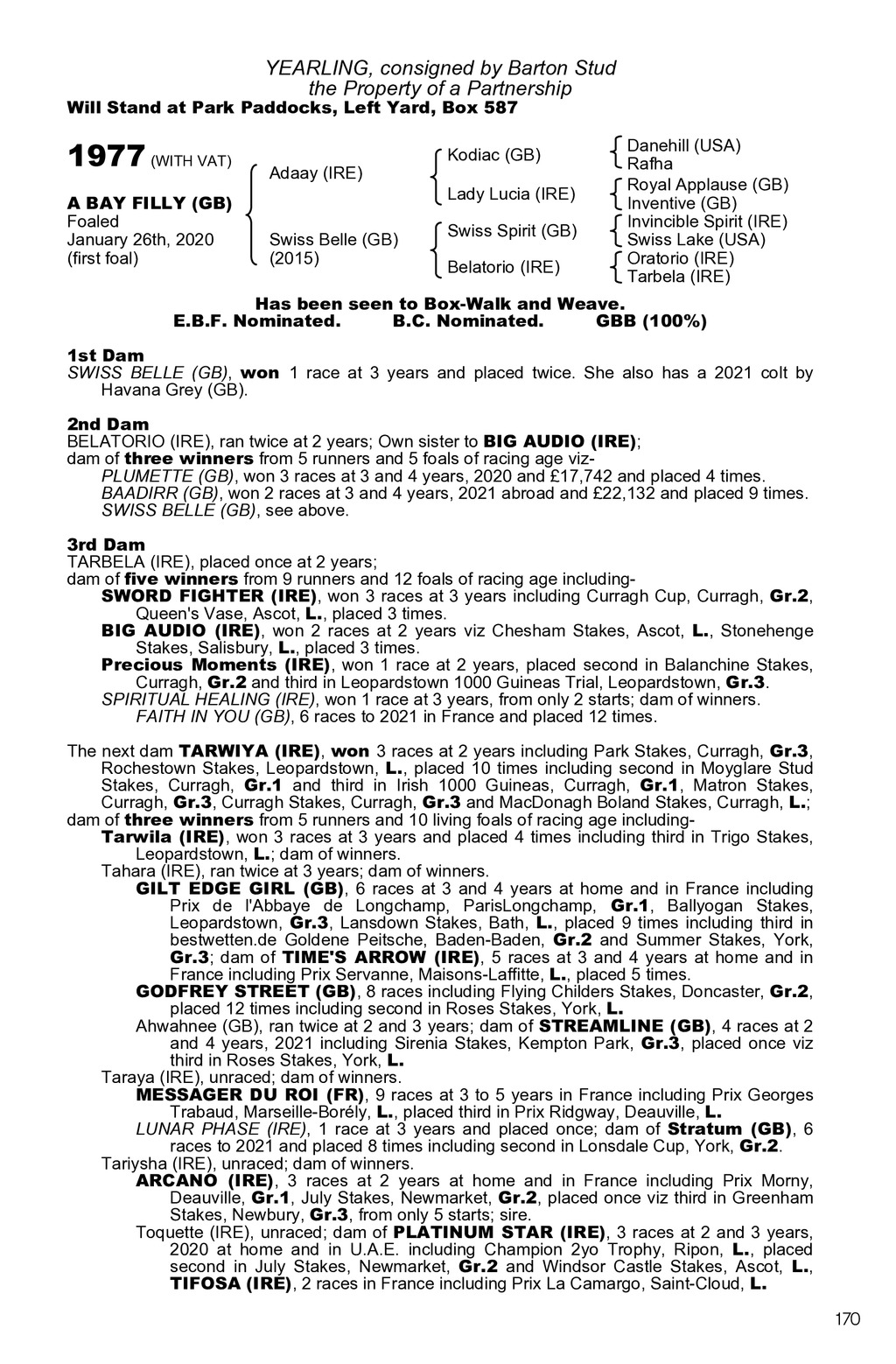 YEARLING, consigned by Barton Stud the Property of a Partnership Will Stand at Park Paddocks, Left Yard, Box 587 1977 (WITH VAT) A BAY FILLY (GB) Foaled January 26th, 2020 (first foal) Adaay (IRE) Swiss Belle (GB) (2015) Kodiac (GB) Lady Lucia (IRE) Swiss Spirit (GB) Belatorio (IRE) Danehill (USA) Rafha Royal Applause (GB) Inventive (GB) Invincible Spirit (IRE) Swiss Lake (USA) Oratorio (IRE) Tarbela (IRE) Has been seen to Box-Walk and Weave. E.B.F. Nominated. B.C. Nominated. GBB (100%) 1st Dam SWISS BELLE (GB), won 1 race at 3 years and placed twice. She also has a 2021 colt by Havana Grey (GB). 2nd Dam BELATORIO (IRE), ran twice at 2 years; Own sister to BIG AUDIO (IRE); dam of three winners from 5 runners and 5 foals of racing age vizPLUMETTE (GB), won 3 races at 3 and 4 years, 2020 and 17,742 and placed 4 times. BAADIRR (GB), won 2 races at 3 and 4 years, 2021 abroad and 22,132 and placed 9 times. SWISS BELLE (GB), see above. 3rd Dam TARBELA (IRE), placed once at 2 years; dam of five winners from 9 runners and 12 foals of racing age includingSWORD FIGHTER (IRE), won 3 races at 3 years including Curragh Cup, Curragh, Gr.2, Queen s Vase, Ascot, L., placed 3 times. BIG AUDIO (IRE), won 2 races at 2 years viz Chesham Stakes, Ascot, L., Stonehenge Stakes, Salisbury, L., placed 3 times. Precious Moments (IRE), won 1 race at 2 years, placed second in Balanchine Stakes, Curragh, Gr.2 and third in Leopardstown 1000 Guineas Trial, Leopardstown, Gr.3. SPIRITUAL HEALING (IRE), won 1 race at 3 years, from only 2 starts; dam of winners. FAITH IN YOU (GB), 6 races to 2021 in France and placed 12 times. The next dam TARWIYA (IRE), won 3 races at 2 years including Park Stakes, Curragh, Gr.3, Rochestown Stakes, Leopardstown, L., placed 10 times including second in Moyglare Stud Stakes, Curragh, Gr.1 and third in Irish 1000 Guineas, Curragh, Gr.1, Matron Stakes, Curragh, Gr.3, Curragh Stakes, Curragh, Gr.3 and MacDonagh Boland Stakes, Curragh, L.; dam of three winners from 5 runners and 10 living foals of racing age includingTarwila (IRE), won 3 races at 3 years and placed 4 times including third in Trigo Stakes, Leopardstown, L.; dam of winners. Tahara (IRE), ran twice at 3 years; dam of winners. GILT EDGE GIRL (GB), 6 races at 3 and 4 years at home and in France including Prix de l Abbaye de Longchamp, ParisLongchamp, Gr.1, Ballyogan Stakes, Leopardstown, Gr.3, Lansdown Stakes, Bath, L., placed 9 times including third in bestwetten.de Goldene Peitsche, Baden-Baden, Gr.2 and Summer Stakes, York, Gr.3; dam of TIME S ARROW (IRE), 5 races at 3 and 4 years at home and in France including Prix Servanne, Maisons-Laffitte, L., placed 5 times. GODFREY STREET (GB), 8 races including Flying Childers Stakes, Doncaster, Gr.2, placed 12 times including second in Roses Stakes, York, L. Ahwahnee (GB), ran twice at 2 and 3 years; dam of STREAMLINE (GB), 4 races at 2 and 4 years, 2021 including Sirenia Stakes, Kempton Park, Gr.3, placed once viz third in Roses Stakes, York, L. Taraya (IRE), unraced; dam of winners. MESSAGER DU ROI (FR), 9 races at 3 to 5 years in France including Prix Georges Trabaud, Marseille-Borly, L., placed third in Prix Ridgway, Deauville, L. LUNAR PHASE (IRE), 1 race at 3 years and placed once; dam of Stratum (GB), 6 races to 2021 and placed 8 times including second in Lonsdale Cup, York, Gr.2. Tariysha (IRE), unraced; dam of winners. ARCANO (IRE), 3 races at 2 years at home and in France including Prix Morny, Deauville, Gr.1, July Stakes, Newmarket, Gr.2, placed once viz third in Greenham Stakes, Newbury, Gr.3, from only 5 starts; sire. Toquette (IRE), unraced; dam of PLATINUM STAR (IRE), 3 races at 2 and 3 years, 2020 at home and in U.A.E. including Champion 2yo Trophy, Ripon, L., placed second in July Stakes, Newmarket, Gr.2 and Windsor Castle Stakes, Ascot, L., TIFOSA (IRE), 2 races in France including Prix La Camargo, Saint-Cloud, L. 170