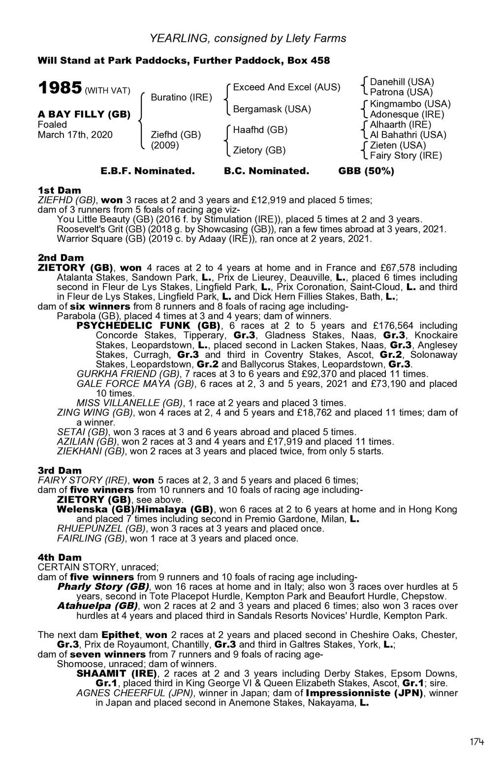 YEARLING, consigned by Llety Farms Will Stand at Park Paddocks, Further Paddock, Box 458 1985 (WITH VAT) A BAY FILLY (GB) Foaled March 17th, 2020 Buratino (IRE) Ziefhd (GB) (2009) E.B.F. Nominated. Exceed And Excel (AUS) Bergamask (USA) Haafhd (GB) Zietory (GB) B.C. Nominated. Danehill (USA) Patrona (USA) Kingmambo (USA) Adonesque (IRE) Alhaarth (IRE) Al Bahathri (USA) Zieten (USA) Fairy Story (IRE) GBB (50%) 1st Dam ZIEFHD (GB), won 3 races at 2 and 3 years and 12,919 and placed 5 times; dam of 3 runners from 5 foals of racing age vizYou Little Beauty (GB) (2016 f. by Stimulation (IRE)), placed 5 times at 2 and 3 years. Roosevelt s Grit (GB) (2018 g. by Showcasing (GB)), ran a few times abroad at 3 years, 2021. Warrior Square (GB) (2019 c. by Adaay (IRE)), ran once at 2 years, 2021. 2nd Dam ZIETORY (GB), won 4 races at 2 to 4 years at home and in France and 67,578 including Atalanta Stakes, Sandown Park, L., Prix de Lieurey, Deauville, L., placed 6 times including second in Fleur de Lys Stakes, Lingfield Park, L., Prix Coronation, Saint-Cloud, L. and third in Fleur de Lys Stakes, Lingfield Park, L. and Dick Hern Fillies Stakes, Bath, L.; dam of six winners from 8 runners and 8 foals of racing age includingParabola (GB), placed 4 times at 3 and 4 years; dam of winners. PSYCHEDELIC FUNK (GB), 6 races at 2 to 5 years and 176,564 including Concorde Stakes, Tipperary, Gr.3, Gladness Stakes, Naas, Gr.3, Knockaire Stakes, Leopardstown, L., placed second in Lacken Stakes, Naas, Gr.3, Anglesey Stakes, Curragh, Gr.3 and third in Coventry Stakes, Ascot, Gr.2, Solonaway Stakes, Leopardstown, Gr.2 and Ballycorus Stakes, Leopardstown, Gr.3. GURKHA FRIEND (GB), 7 races at 3 to 6 years and 92,370 and placed 11 times. GALE FORCE MAYA (GB), 6 races at 2, 3 and 5 years, 2021 and 73,190 and placed 10 times. MISS VILLANELLE (GB), 1 race at 2 years and placed 3 times. ZING WING (GB), won 4 races at 2, 4 and 5 years and 18,762 and placed 11 times; dam of a winner. SETAI (GB), won 3 races at 3 and 6 years abroad and placed 5 times. AZILIAN (GB), won 2 races at 3 and 4 years and 17,919 and placed 11 times. ZIEKHANI (GB), won 2 races at 3 years and placed twice, from only 5 starts. 3rd Dam FAIRY STORY (IRE), won 5 races at 2, 3 and 5 years and placed 6 times; dam of five winners from 10 runners and 10 foals of racing age includingZIETORY (GB), see above. Welenska (GB)/Himalaya (GB), won 6 races at 2 to 6 years at home and in Hong Kong and placed 7 times including second in Premio Gardone, Milan, L. RHUEPUNZEL (GB), won 3 races at 3 years and placed once. FAIRLING (GB), won 1 race at 3 years and placed once. 4th Dam CERTAIN STORY, unraced; dam of five winners from 9 runners and 10 foals of racing age includingPharly Story (GB), won 16 races at home and in Italy; also won 3 races over hurdles at 5 years, second in Tote Placepot Hurdle, Kempton Park and Beaufort Hurdle, Chepstow. Atahuelpa (GB), won 2 races at 2 and 3 years and placed 6 times; also won 3 races over hurdles at 4 years and placed third in Sandals Resorts Novices Hurdle, Kempton Park. The next dam Epithet, won 2 races at 2 years and placed second in Cheshire Oaks, Chester, Gr.3, Prix de Royaumont, Chantilly, Gr.3 and third in Galtres Stakes, York, L.; dam of seven winners from 7 runners and 9 foals of racing ageShomoose, unraced; dam of winners. SHAAMIT (IRE), 2 races at 2 and 3 years including Derby Stakes, Epsom Downs, Gr.1, placed third in King George VI & Queen Elizabeth Stakes, Ascot, Gr.1; sire. AGNES CHEERFUL (JPN), winner in Japan; dam of Impressionniste (JPN), winner in Japan and placed second in Anemone Stakes, Nakayama, L. 174
