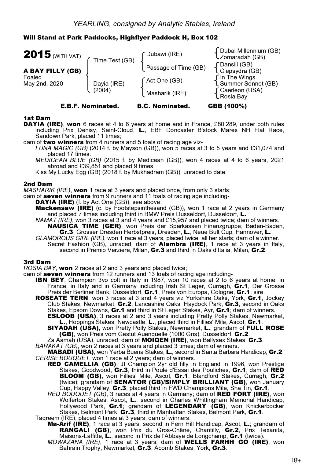 YEARLING, consigned by Analytic Stables, Ireland Will Stand at Park Paddocks, Highflyer Paddock H, Box 102 2015 (WITH VAT) A BAY FILLY (GB) Foaled May 2nd, 2020 Time Test (GB) Dayia (IRE) (2004) E.B.F. Nominated. Dubawi (IRE) Passage of Time (GB) Act One (GB) Masharik (IRE) B.C. Nominated. Dubai Millennium (GB) Zomaradah (GB) Dansili (GB) Clepsydra (GB) In The Wings Summer Sonnet (GB) Caerleon (USA) Rosia Bay GBB (100%) 1st Dam DAYIA (IRE), won 6 races at 4 to 6 years at home and in France, 80,289, under both rules including Prix Denisy, Saint-Cloud, L., EBF Doncaster B stock Mares NH Flat Race, Sandown Park, placed 11 times; dam of two winners from 4 runners and 5 foals of racing age vizLUNA MAGIC (GB) (2014 f. by Mayson (GB)), won 5 races at 3 to 5 years and 31,074 and placed 17 times. MEDICEAN BLUE (GB) (2015 f. by Medicean (GB)), won 4 races at 4 to 6 years, 2021 abroad and 39,851 and placed 9 times. Kiss My Lucky Egg (GB) (2018 f. by Mukhadram (GB)), unraced to date. 2nd Dam MASHARIK (IRE), won 1 race at 3 years and placed once, from only 3 starts; dam of seven winners from 9 runners and 11 foals of racing age includingDAYIA (IRE) (f. by Act One (GB)), see above. Mackensaw (IRE) (c. by Footstepsinthesand (GB)), won 1 race at 2 years in Germany and placed 7 times including third in BMW Preis Dusseldorf, Dusseldorf, L. NAMAT (IRE), won 3 races at 3 and 4 years and 15,957 and placed twice; dam of winners. NAUSICA TIME (GER), won Preis der Sparkassen Finanzgruppe, Baden-Baden, Gr.3, Grosser Dresden Herbstpreis, Dresden, L., Neue Bult Cup, Hannover, L. GLAMOROUS GIRL (IRE), won 1 race at 3 years, placed twice, all her starts; dam of a winner. Secret Fashion (GB), unraced; dam of Alambra (IRE), 1 race at 3 years in Italy, second in Premio Verziere, Milan, Gr.3 and third in Oaks d Italia, Milan, Gr.2. 3rd Dam ROSIA BAY, won 2 races at 2 and 3 years and placed twice; dam of seven winners from 12 runners and 13 foals of racing age includingIBN BEY, Champion 3yo colt in Italy in 1987, won 10 races at 2 to 6 years at home, in France, in Italy and in Germany including Irish St Leger, Curragh, Gr.1, Der Grosse Preis der Berliner Bank, Dusseldorf, Gr.1, Preis von Europa, Cologne, Gr.1; sire. ROSEATE TERN, won 3 races at 3 and 4 years viz Yorkshire Oaks, York, Gr.1, Jockey Club Stakes, Newmarket, Gr.2, Lancashire Oaks, Haydock Park, Gr.3, second in Oaks Stakes, Epsom Downs, Gr.1 and third in St Leger Stakes, Ayr, Gr.1; dam of winners. ESLOOB (USA), 3 races at 2 and 3 years including Pretty Polly Stakes, Newmarket, L., Hoppings Stakes, Newcastle, L., placed third in Fillies Mile, Ascot, Gr.1. SIYADAH (USA), won Pretty Polly Stakes, Newmarket, L.; grandam of FULL ROSE (GB), won Preis vom Gestut Auenquelle (1000 Gns), Dusseldorf, Gr.2. Za Aamah (USA), unraced; dam of MOIQEN (IRE), won Ballysax Stakes, Gr.3. BARAKAT (GB), won 2 races at 3 years and placed 3 times; dam of winners. MABADI (USA), won Yerba Buena Stakes, L., second in Santa Barbara Handicap, Gr.2. CERISE BOUQUET, won 1 race at 2 years; dam of winners. RED CAMELLIA (GB), Jt Champion 2yr old filly in England in 1996, won Prestige Stakes, Goodwood, Gr.3, third in Poule d Essai des Pouliches, Gr.1; dam of RED BLOOM (GB), won Fillies Mile, Ascot, Gr.1, Blandford Stakes, Curragh, Gr.2 (twice); grandam of SENATOR (GB)/SIMPLY BRILLIANT (GB), won January Cup, Happy Valley, Gr.3, placed third in FWD Champions Mile, Sha Tin, Gr.1. RED BOUQUET (GB), 3 races at 4 years in Germany; dam of RED FORT (IRE), won Wolferton Stakes, Ascot, L., second in Charles Whittingham Memorial Handicap, Hollywood Park, Gr.1; grandam of LEGENDARY (GB), won Knickerbocker Stakes, Belmont Park, Gr.3, third in Manhattan Stakes, Belmont Park, Gr.1. Taqreem (IRE), placed 4 times at 3 years; dam of winners. Ma-Arif (IRE), 1 race at 3 years, second in Fern Hill Handicap, Ascot, L.; grandam of RANGALI (GB), won Prix du Gros-Chne, Chantilly, Gr.2, Prix Texanita, Maisons-Laffitte, L., second in Prix de l Abbaye de Longchamp, Gr.1 (twice). MOWAZANA (IRE), 1 race at 3 years; dam of WELLS FARHH GO (IRE), won Bahrain Trophy, Newmarket, Gr.3, Acomb Stakes, York, Gr.3. 184