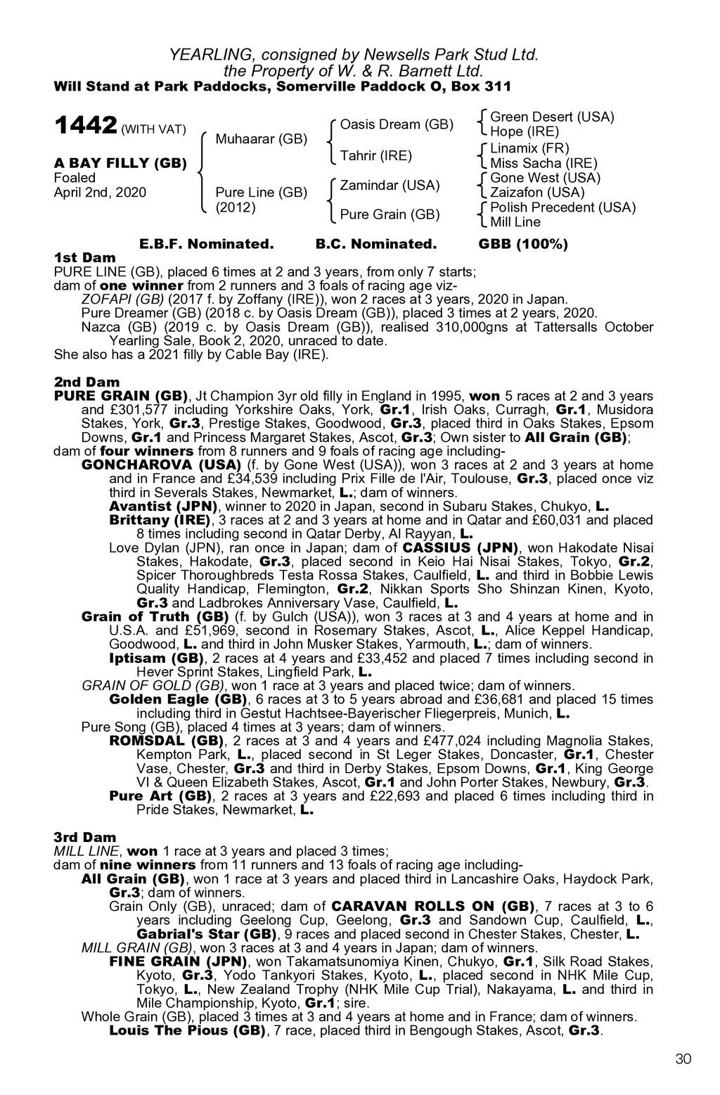 YEARLING, consigned by Newsells Park Stud Ltd. the Property of W. & R. Barnett Ltd. Will Stand at Park Paddocks, Somerville Paddock O, Box 311 1442 (WITH VAT) A BAY FILLY (GB) Foaled April 2nd, 2020 Muhaarar (GB) Pure Line (GB) (2012) Oasis Dream (GB) Tahrir (IRE) Zamindar (USA) Pure Grain (GB) Green Desert (USA) Hope (IRE) Linamix (FR) Miss Sacha (IRE) Gone West (USA) Zaizafon (USA) Polish Precedent (USA) Mill Line E.B.F. Nominated. B.C. Nominated. GBB (100%) 1st Dam PURE LINE (GB), placed 6 times at 2 and 3 years, from only 7 starts; dam of one winner from 2 runners and 3 foals of racing age vizZOFAPI (GB) (2017 f. by Zoffany (IRE)), won 2 races at 3 years, 2020 in Japan. Pure Dreamer (GB) (2018 c. by Oasis Dream (GB)), placed 3 times at 2 years, 2020. Nazca (GB) (2019 c. by Oasis Dream (GB)), realised 310,000gns at Tattersalls October Yearling Sale, Book 2, 2020, unraced to date. She also has a 2021 filly by Cable Bay (IRE). 2nd Dam PURE GRAIN (GB), Jt Champion 3yr old filly in England in 1995, won 5 races at 2 and 3 years and 301,577 including Yorkshire Oaks, York, Gr.1, Irish Oaks, Curragh, Gr.1, Musidora Stakes, York, Gr.3, Prestige Stakes, Goodwood, Gr.3, placed third in Oaks Stakes, Epsom Downs, Gr.1 and Princess Margaret Stakes, Ascot, Gr.3; Own sister to All Grain (GB); dam of four winners from 8 runners and 9 foals of racing age includingGONCHAROVA (USA) (f. by Gone West (USA)), won 3 races at 2 and 3 years at home and in France and 34,539 including Prix Fille de l Air, Toulouse, Gr.3, placed once viz third in Severals Stakes, Newmarket, L.; dam of winners. Avantist (JPN), winner to 2020 in Japan, second in Subaru Stakes, Chukyo, L. Brittany (IRE), 3 races at 2 and 3 years at home and in Qatar and 60,031 and placed 8 times including second in Qatar Derby, Al Rayyan, L. Love Dylan (JPN), ran once in Japan; dam of CASSIUS (JPN), won Hakodate Nisai Stakes, Hakodate, Gr.3, placed second in Keio Hai Nisai Stakes, Tokyo, Gr.2, Spicer Thoroughbreds Testa Rossa Stakes, Caulfield, L. and third in Bobbie Lewis Quality Handicap, Flemington, Gr.2, Nikkan Sports Sho Shinzan Kinen, Kyoto, Gr.3 and Ladbrokes Anniversary Vase, Caulfield, L. Grain of Truth (GB) (f. by Gulch (USA)), won 3 races at 3 and 4 years at home and in U.S.A. and 51,969, second in Rosemary Stakes, Ascot, L., Alice Keppel Handicap, Goodwood, L. and third in John Musker Stakes, Yarmouth, L.; dam of winners. Iptisam (GB), 2 races at 4 years and 33,452 and placed 7 times including second in Hever Sprint Stakes, Lingfield Park, L. GRAIN OF GOLD (GB), won 1 race at 3 years and placed twice; dam of winners. Golden Eagle (GB), 6 races at 3 to 5 years abroad and 36,681 and placed 15 times including third in Gestut Hachtsee-Bayerischer Fliegerpreis, Munich, L. Pure Song (GB), placed 4 times at 3 years; dam of winners. ROMSDAL (GB), 2 races at 3 and 4 years and 477,024 including Magnolia Stakes, Kempton Park, L., placed second in St Leger Stakes, Doncaster, Gr.1, Chester Vase, Chester, Gr.3 and third in Derby Stakes, Epsom Downs, Gr.1, King George VI & Queen Elizabeth Stakes, Ascot, Gr.1 and John Porter Stakes, Newbury, Gr.3. Pure Art (GB), 2 races at 3 years and 22,693 and placed 6 times including third in Pride Stakes, Newmarket, L. 3rd Dam MILL LINE, won 1 race at 3 years and placed 3 times; dam of nine winners from 11 runners and 13 foals of racing age includingAll Grain (GB), won 1 race at 3 years and placed third in Lancashire Oaks, Haydock Park, Gr.3; dam of winners. Grain Only (GB), unraced; dam of CARAVAN ROLLS ON (GB), 7 races at 3 to 6 years including Geelong Cup, Geelong, Gr.3 and Sandown Cup, Caulfield, L., Gabrial s Star (GB), 9 races and placed second in Chester Stakes, Chester, L. MILL GRAIN (GB), won 3 races at 3 and 4 years in Japan; dam of winners. FINE GRAIN (JPN), won Takamatsunomiya Kinen, Chukyo, Gr.1, Silk Road Stakes, Kyoto, Gr.3, Yodo Tankyori Stakes, Kyoto, L., placed second in NHK Mile Cup, Tokyo, L., New Zealand Trophy (NHK Mile Cup Trial), Nakayama, L. and third in Mile Championship, Kyoto, Gr.1; sire. Whole Grain (GB), placed 3 times at 3 and 4 years at home and in France; dam of winners. Louis The Pious (GB), 7 race, placed third in Bengough Stakes, Ascot, Gr.3. 30