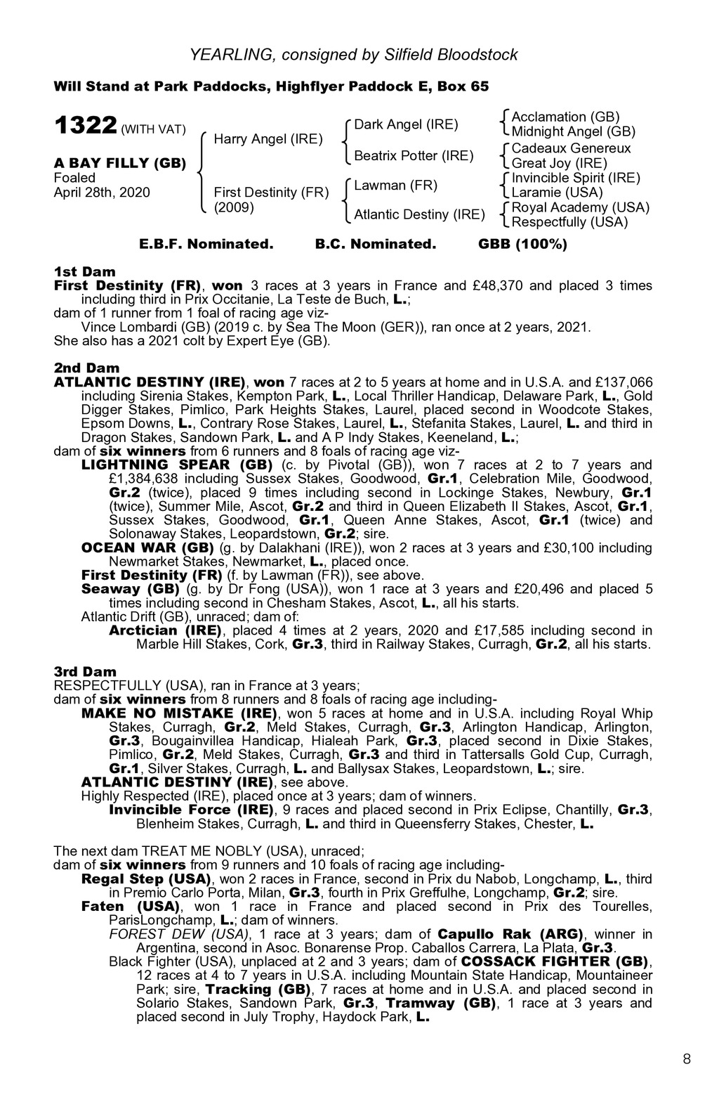 YEARLING, consigned by Silfield Bloodstock Will Stand at Park Paddocks, Highflyer Paddock E, Box 65 1322 (WITH VAT) A BAY FILLY (GB) Foaled April 28th, 2020 Harry Angel (IRE) First Destinity (FR) (2009) E.B.F. Nominated. Dark Angel (IRE) Beatrix Potter (IRE) Lawman (FR) Atlantic Destiny (IRE) B.C. Nominated. Acclamation (GB) Midnight Angel (GB) Cadeaux Genereux Great Joy (IRE) Invincible Spirit (IRE) Laramie (USA) Royal Academy (USA) Respectfully (USA) GBB (100%) 1st Dam First Destinity (FR), won 3 races at 3 years in France and 48,370 and placed 3 times including third in Prix Occitanie, La Teste de Buch, L.; dam of 1 runner from 1 foal of racing age vizVince Lombardi (GB) (2019 c. by Sea The Moon (GER)), ran once at 2 years, 2021. She also has a 2021 colt by Expert Eye (GB). 2nd Dam ATLANTIC DESTINY (IRE), won 7 races at 2 to 5 years at home and in U.S.A. and 137,066 including Sirenia Stakes, Kempton Park, L., Local Thriller Handicap, Delaware Park, L., Gold Digger Stakes, Pimlico, Park Heights Stakes, Laurel, placed second in Woodcote Stakes, Epsom Downs, L., Contrary Rose Stakes, Laurel, L., Stefanita Stakes, Laurel, L. and third in Dragon Stakes, Sandown Park, L. and A P Indy Stakes, Keeneland, L.; dam of six winners from 6 runners and 8 foals of racing age vizLIGHTNING SPEAR (GB) (c. by Pivotal (GB)), won 7 races at 2 to 7 years and 1,384,638 including Sussex Stakes, Goodwood, Gr.1, Celebration Mile, Goodwood, Gr.2 (twice), placed 9 times including second in Lockinge Stakes, Newbury, Gr.1 (twice), Summer Mile, Ascot, Gr.2 and third in Queen Elizabeth II Stakes, Ascot, Gr.1, Sussex Stakes, Goodwood, Gr.1, Queen Anne Stakes, Ascot, Gr.1 (twice) and Solonaway Stakes, Leopardstown, Gr.2; sire. OCEAN WAR (GB) (g. by Dalakhani (IRE)), won 2 races at 3 years and 30,100 including Newmarket Stakes, Newmarket, L., placed once. First Destinity (FR) (f. by Lawman (FR)), see above. Seaway (GB) (g. by Dr Fong (USA)), won 1 race at 3 years and 20,496 and placed 5 times including second in Chesham Stakes, Ascot, L., all his starts. Atlantic Drift (GB), unraced; dam of: Arctician (IRE), placed 4 times at 2 years, 2020 and 17,585 including second in Marble Hill Stakes, Cork, Gr.3, third in Railway Stakes, Curragh, Gr.2, all his starts. 3rd Dam RESPECTFULLY (USA), ran in France at 3 years; dam of six winners from 8 runners and 8 foals of racing age includingMAKE NO MISTAKE (IRE), won 5 races at home and in U.S.A. including Royal Whip Stakes, Curragh, Gr.2, Meld Stakes, Curragh, Gr.3, Arlington Handicap, Arlington, Gr.3, Bougainvillea Handicap, Hialeah Park, Gr.3, placed second in Dixie Stakes, Pimlico, Gr.2, Meld Stakes, Curragh, Gr.3 and third in Tattersalls Gold Cup, Curragh, Gr.1, Silver Stakes, Curragh, L. and Ballysax Stakes, Leopardstown, L.; sire. ATLANTIC DESTINY (IRE), see above. Highly Respected (IRE), placed once at 3 years; dam of winners. Invincible Force (IRE), 9 races and placed second in Prix Eclipse, Chantilly, Gr.3, Blenheim Stakes, Curragh, L. and third in Queensferry Stakes, Chester, L. The next dam TREAT ME NOBLY (USA), unraced; dam of six winners from 9 runners and 10 foals of racing age includingRegal Step (USA), won 2 races in France, second in Prix du Nabob, Longchamp, L., third in Premio Carlo Porta, Milan, Gr.3, fourth in Prix Greffulhe, Longchamp, Gr.2; sire. Faten (USA), won 1 race in France and placed second in Prix des Tourelles, ParisLongchamp, L.; dam of winners. FOREST DEW (USA), 1 race at 3 years; dam of Capullo Rak (ARG), winner in Argentina, second in Asoc. Bonarense Prop. Caballos Carrera, La Plata, Gr.3. Black Fighter (USA), unplaced at 2 and 3 years; dam of COSSACK FIGHTER (GB), 12 races at 4 to 7 years in U.S.A. including Mountain State Handicap, Mountaineer Park; sire, Tracking (GB), 7 races at home and in U.S.A. and placed second in Solario Stakes, Sandown Park, Gr.3, Tramway (GB), 1 race at 3 years and placed second in July Trophy, Haydock Park, L. 8