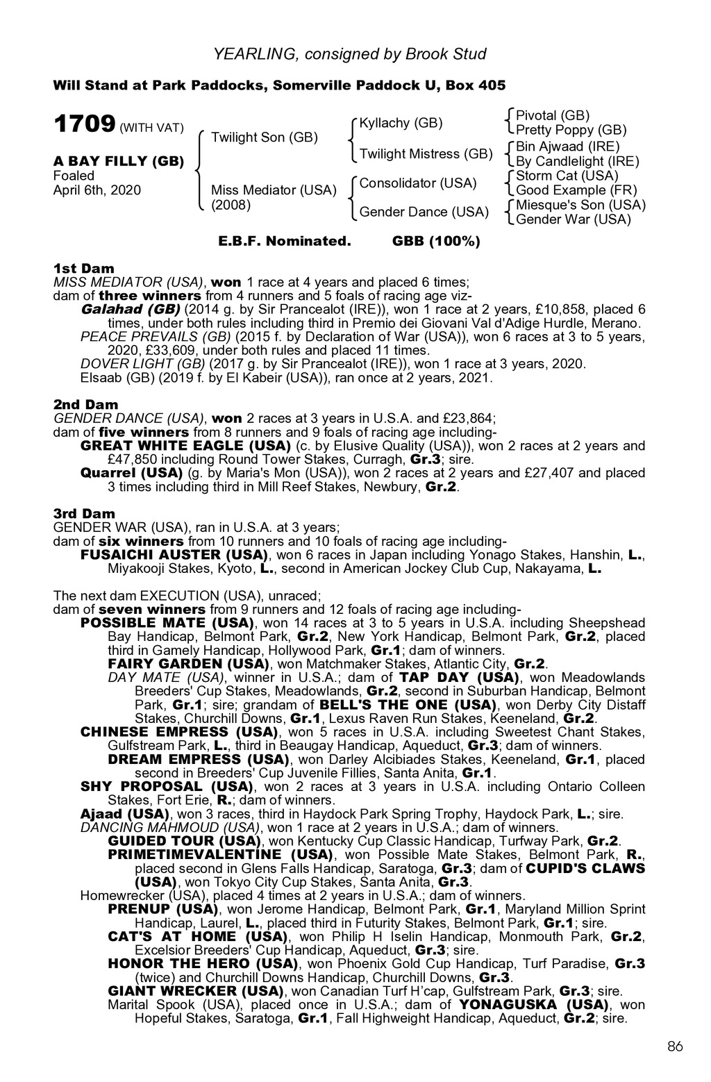 YEARLING, consigned by Brook Stud Will Stand at Park Paddocks, Somerville Paddock U, Box 405 1709 (WITH VAT) A BAY FILLY (GB) Foaled April 6th, 2020 Twilight Son (GB) Miss Mediator (USA) (2008) E.B.F. Nominated. Kyllachy (GB) Twilight Mistress (GB) Consolidator (USA) Gender Dance (USA) Pivotal (GB) Pretty Poppy (GB) Bin Ajwaad (IRE) By Candlelight (IRE) Storm Cat (USA) Good Example (FR) Miesque s Son (USA) Gender War (USA) GBB (100%) 1st Dam MISS MEDIATOR (USA), won 1 race at 4 years and placed 6 times; dam of three winners from 4 runners and 5 foals of racing age vizGalahad (GB) (2014 g. by Sir Prancealot (IRE)), won 1 race at 2 years, 10,858, placed 6 times, under both rules including third in Premio dei Giovani Val d Adige Hurdle, Merano. PEACE PREVAILS (GB) (2015 f. by Declaration of War (USA)), won 6 races at 3 to 5 years, 2020, 33,609, under both rules and placed 11 times. DOVER LIGHT (GB) (2017 g. by Sir Prancealot (IRE)), won 1 race at 3 years, 2020. Elsaab (GB) (2019 f. by El Kabeir (USA)), ran once at 2 years, 2021. 2nd Dam GENDER DANCE (USA), won 2 races at 3 years in U.S.A. and 23,864; dam of five winners from 8 runners and 9 foals of racing age includingGREAT WHITE EAGLE (USA) (c. by Elusive Quality (USA)), won 2 races at 2 years and 47,850 including Round Tower Stakes, Curragh, Gr.3; sire. Quarrel (USA) (g. by Maria s Mon (USA)), won 2 races at 2 years and 27,407 and placed 3 times including third in Mill Reef Stakes, Newbury, Gr.2. 3rd Dam GENDER WAR (USA), ran in U.S.A. at 3 years; dam of six winners from 10 runners and 10 foals of racing age includingFUSAICHI AUSTER (USA), won 6 races in Japan including Yonago Stakes, Hanshin, L., Miyakooji Stakes, Kyoto, L., second in American Jockey Club Cup, Nakayama, L. The next dam EXECUTION (USA), unraced; dam of seven winners from 9 runners and 12 foals of racing age includingPOSSIBLE MATE (USA), won 14 races at 3 to 5 years in U.S.A. including Sheepshead Bay Handicap, Belmont Park, Gr.2, New York Handicap, Belmont Park, Gr.2, placed third in Gamely Handicap, Hollywood Park, Gr.1; dam of winners. FAIRY GARDEN (USA), won Matchmaker Stakes, Atlantic City, Gr.2. DAY MATE (USA), winner in U.S.A.; dam of TAP DAY (USA), won Meadowlands Breeders Cup Stakes, Meadowlands, Gr.2, second in Suburban Handicap, Belmont Park, Gr.1; sire; grandam of BELL S THE ONE (USA), won Derby City Distaff Stakes, Churchill Downs, Gr.1, Lexus Raven Run Stakes, Keeneland, Gr.2. CHINESE EMPRESS (USA), won 5 races in U.S.A. including Sweetest Chant Stakes, Gulfstream Park, L., third in Beaugay Handicap, Aqueduct, Gr.3; dam of winners. DREAM EMPRESS (USA), won Darley Alcibiades Stakes, Keeneland, Gr.1, placed second in Breeders Cup Juvenile Fillies, Santa Anita, Gr.1. SHY PROPOSAL (USA), won 2 races at 3 years in U.S.A. including Ontario Colleen Stakes, Fort Erie, R.; dam of winners. Ajaad (USA), won 3 races, third in Haydock Park Spring Trophy, Haydock Park, L.; sire. DANCING MAHMOUD (USA), won 1 race at 2 years in U.S.A.; dam of winners. GUIDED TOUR (USA), won Kentucky Cup Classic Handicap, Turfway Park, Gr.2. PRIMETIMEVALENTINE (USA), won Possible Mate Stakes, Belmont Park, R., placed second in Glens Falls Handicap, Saratoga, Gr.3; dam of CUPID S CLAWS (USA), won Tokyo City Cup Stakes, Santa Anita, Gr.3. Homewrecker (USA), placed 4 times at 2 years in U.S.A.; dam of winners. PRENUP (USA), won Jerome Handicap, Belmont Park, Gr.1, Maryland Million Sprint Handicap, Laurel, L., placed third in Futurity Stakes, Belmont Park, Gr.1; sire. CAT S AT HOME (USA), won Philip H Iselin Handicap, Monmouth Park, Gr.2, Excelsior Breeders Cup Handicap, Aqueduct, Gr.3; sire. HONOR THE HERO (USA), won Phoenix Gold Cup Handicap, Turf Paradise, Gr.3 (twice) and Churchill Downs Handicap, Churchill Downs, Gr.3. GIANT WRECKER (USA), won Canadian Turf Hcap, Gulfstream Park, Gr.3; sire. Marital Spook (USA), placed once in U.S.A.; dam of YONAGUSKA (USA), won Hopeful Stakes, Saratoga, Gr.1, Fall Highweight Handicap, Aqueduct, Gr.2; sire. 86