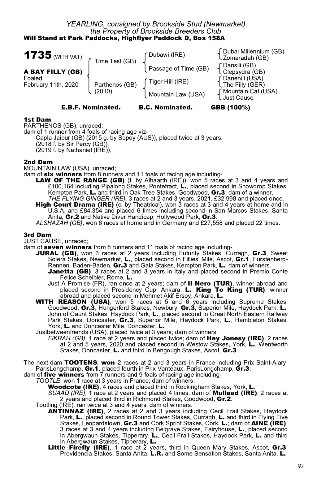 YEARLING, consigned by Brookside Stud (Newmarket) the Property of Brookside Breeders Club Will Stand at Park Paddocks, Highflyer Paddock D, Box 158A 1735 (WITH VAT) A BAY FILLY (GB) Foaled February 11th, 2020 Time Test (GB) Parthenos (GB) (2010) E.B.F. Nominated. Dubai Millennium (GB) Zomaradah (GB) Dansili (GB) Clepsydra (GB) Danehill (USA) The Filly (GER) Mountain Cat (USA) Just Cause Dubawi (IRE) Passage of Time (GB) Tiger Hill (IRE) Mountain Law (USA) B.C. Nominated. GBB (100%) 1st Dam PARTHENOS (GB), unraced; dam of 1 runner from 4 foals of racing age vizCapla Jaipur (GB) (2015 g. by Sepoy (AUS)), placed twice at 3 years. (2018 f. by Sir Percy (GB)). (2019 f. by Nathaniel (IRE)). 2nd Dam MOUNTAIN LAW (USA), unraced; dam of six winners from 8 runners and 11 foals of racing age includingLAW OF THE RANGE (GB) (f. by Alhaarth (IRE)), won 5 races at 3 and 4 years and 100,164 including Pipalong Stakes, Pontefract, L., placed second in Snowdrop Stakes, Kempton Park, L. and third in Oak Tree Stakes, Goodwood, Gr.3; dam of a winner. THE FLYING GINGER (IRE), 3 races at 2 and 3 years, 2021, 32,998 and placed once. High Court Drama (IRE) (c. by Theatrical), won 3 races at 3 and 4 years at home and in U.S.A. and 84,354 and placed 6 times including second in San Marcos Stakes, Santa Anita, Gr.2 and Native Diver Handicap, Hollywood Park, Gr.3. ALSHAZAH (GB), won 6 races at home and in Germany and 27,558 and placed 22 times. 3rd Dam JUST CAUSE, unraced; dam of seven winners from 8 runners and 11 foals of racing age includingJURAL (GB), won 3 races at 2 years including Futurity Stakes, Curragh, Gr.3, Sweet Solera Stakes, Newmarket, L., placed second in Fillies Mile, Ascot, Gr.1, FurstenbergRennen, Baden-Baden, Gr.3 and Gala Stakes, Kempton Park, L.; dam of winners. Janetta (GB), 3 races at 2 and 3 years in Italy and placed second in Premio Conte Felice Scheibler, Rome, L. Just A Promise (FR), ran once at 2 years; dam of Il Nero (TUR), winner abroad and placed second in Presidency Cup, Ankara, L., King To King (TUR), winner abroad and placed second in Mehmet Akif Ersoy, Ankara, L. WITH REASON (USA), won 5 races at 5 and 6 years including Supreme Stakes, Goodwood, Gr.3, Hungerford Stakes, Newbury, Gr.3, Superior Mile, Haydock Park, L., John of Gaunt Stakes, Haydock Park, L., placed second in Great North Eastern Railway Park Stakes, Doncaster, Gr.3, Superior Mile, Haydock Park, L., Hambleton Stakes, York, L. and Doncaster Mile, Doncaster, L. Justbetweenfriends (USA), placed twice at 3 years; dam of winners. FIKRAH (GB), 1 race at 2 years and placed twice; dam of Hey Jonesy (IRE), 2 races at 2 and 5 years, 2020 and placed second in Westow Stakes, York, L., Wentworth Stakes, Doncaster, L. and third in Bengough Stakes, Ascot, Gr.3. The next dam TOOTENS, won 2 races at 2 and 3 years in France including Prix Saint-Alary, ParisLongchamp, Gr.1, placed fourth in Prix Vanteaux, ParisLongchamp, Gr.3; dam of five winners from 7 runners and 9 foals of racing age includingTOOTLE, won 1 race at 3 years in France; dam of winners. Woodcote (IRE), 4 races and placed third in Rockingham Stakes, York, L. SUAAD (IRE), 1 race at 2 years and placed 4 times; dam of Mullaad (IRE), 2 races at 2 years and placed third in Richmond Stakes, Goodwood, Gr.2. Tootling (IRE), ran twice at 3 and 4 years; dam of winners. ANTINNAZ (IRE), 2 races at 2 and 3 years including Cecil Frail Stakes, Haydock Park, L., placed second in Round Tower Stakes, Curragh, L. and third in Flying Five Stakes, Leopardstown, Gr.3 and Cork Sprint Stakes, Cork, L.; dam of AINE (IRE), 3 races at 3 and 4 years including Belgrave Stakes, Fairyhouse, L., placed second in Abergwaun Stakes, Tipperary, L., Cecil Frail Stakes, Haydock Park, L. and third in Abergwaun Stakes, Tipperary, L. Little Firefly (IRE), 1 race at 2 years, third in Queen Mary Stakes, Ascot, Gr.3, Providencia Stakes, Santa Anita, L.R. and Some Sensation Stakes, Santa Anita, L. 92