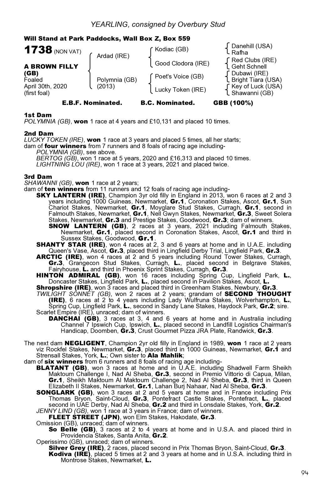 YEARLING, consigned by Overbury Stud Will Stand at Park Paddocks, Wall Box Z, Box 559 1738 (NON VAT) A BROWN FILLY (GB) Foaled April 30th, 2020 (first foal) Ardad (IRE) Polymnia (GB) (2013) E.B.F. Nominated. Danehill (USA) Rafha Red Clubs (IRE) Geht Schnell Dubawi (IRE) Bright Tiara (USA) Key of Luck (USA) Shawanni (GB) Kodiac (GB) Good Clodora (IRE) Poet s Voice (GB) Lucky Token (IRE) B.C. Nominated. GBB (100%) 1st Dam POLYMNIA (GB), won 1 race at 4 years and 10,131 and placed 10 times. 2nd Dam LUCKY TOKEN (IRE), won 1 race at 3 years and placed 5 times, all her starts; dam of four winners from 7 runners and 8 foals of racing age includingPOLYMNIA (GB), see above. BERTOG (GB), won 1 race at 5 years, 2020 and 16,313 and placed 10 times. LIGHTNING LOU (IRE), won 1 race at 3 years, 2021 and placed twice. 3rd Dam SHAWANNI (GB), won 1 race at 2 years; dam of ten winners from 11 runners and 12 foals of racing age includingSKY LANTERN (IRE), Champion 3yr old filly in England in 2013, won 6 races at 2 and 3 years including 1000 Guineas, Newmarket, Gr.1, Coronation Stakes, Ascot, Gr.1, Sun Chariot Stakes, Newmarket, Gr.1, Moyglare Stud Stakes, Curragh, Gr.1, second in Falmouth Stakes, Newmarket, Gr.1, Nell Gwyn Stakes, Newmarket, Gr.3, Sweet Solera Stakes, Newmarket, Gr.3 and Prestige Stakes, Goodwood, Gr.3; dam of winners. SNOW LANTERN (GB), 2 races at 3 years, 2021 including Falmouth Stakes, Newmarket, Gr.1, placed second in Coronation Stakes, Ascot, Gr.1 and third in Sussex Stakes, Goodwood, G r . 1 . SHANTY STAR (IRE), won 4 races at 2, 3 and 6 years at home and in U.A.E. including Queen s Vase, Ascot, Gr.3, placed third in Lingfield Derby Trial, Lingfield Park, Gr.3. ARCTIC (IRE), won 4 races at 2 and 5 years including Round Tower Stakes, Curragh, Gr.3, Grangecon Stud Stakes, Curragh, L., placed second in Belgrave Stakes, Fairyhouse, L. and third in Phoenix Sprint Stakes, Curragh, Gr.3. HINTON ADMIRAL (GB), won 16 races including Spring Cup, Lingfield Park, L., Doncaster Stakes, Lingfield Park, L., placed second in Pavilion Stakes, Ascot, L. Shropshire (IRE), won 3 races and placed third in Greenham Stakes, Newbury, Gr.3. TWILIGHT SONNET (GB), won 2 races at 2 years; grandam of SECOND THOUGHT (IRE), 6 races at 2 to 4 years including Lady Wulfruna Stakes, Wolverhampton, L., Spring Cup, Lingfield Park, L., second in Sandy Lane Stakes, Haydock Park, Gr.2; sire. Scarlet Empire (IRE), unraced; dam of winners. DANCHAI (GB), 3 races at 3, 4 and 6 years at home and in Australia including Channel 7 Ipswich Cup, Ipswich, L., placed second in Landfill Logistics Chairman s Handicap, Doomben, Gr.3, Crust Gourmet Pizza JRA Plate, Randwick, Gr.3. The next dam NEGLIGENT, Champion 2yr old filly in England in 1989, won 1 race at 2 years viz Rockfel Stakes, Newmarket, Gr.3, placed third in 1000 Guineas, Newmarket, Gr.1 and Strensall Stakes, York, L.; Own sister to Ala Mahlik; dam of six winners from 6 runners and 8 foals of racing age includingBLATANT (GB), won 3 races at home and in U.A.E. including Shadwell Farm Sheikh Maktoum Challenge I, Nad Al Sheba, Gr.3, second in Premio Vittorio di Capua, Milan, Gr.1, Sheikh Maktoum Al Maktoum Challenge 2, Nad Al Sheba, Gr.3, third in Queen Elizabeth II Stakes, Newmarket, Gr.1, Lahan Burj Nahaar, Nad Al Sheba, Gr.3. SONGLARK (GB), won 3 races at 2 and 5 years at home and in France including Prix Thomas Bryon, Saint-Cloud, Gr.3, Pontefract Castle Stakes, Pontefract, L., placed second in UAE Derby, Nad Al Sheba, Gr.2 and third in Lonsdale Stakes, York, Gr.2. JENNY LIND (GB), won 1 race at 3 years in France; dam of winners. FLEET STREET (JPN), won Elm Stakes, Hakodate, Gr.3. Omission (GB), unraced; dam of winners. So Belle (GB), 3 races at 2 to 4 years at home and in U.S.A. and placed third in Providencia Stakes, Santa Anita, Gr.2. Operissimo (GB), unraced; dam of winners. Silver Grey (IRE), 2 races, placed second in Prix Thomas Bryon, Saint-Cloud, Gr.3. Kodiva (IRE), placed 5 times at 2 and 3 years at home and in U.S.A. including third in Montrose Stakes, Newmarket, L. 94