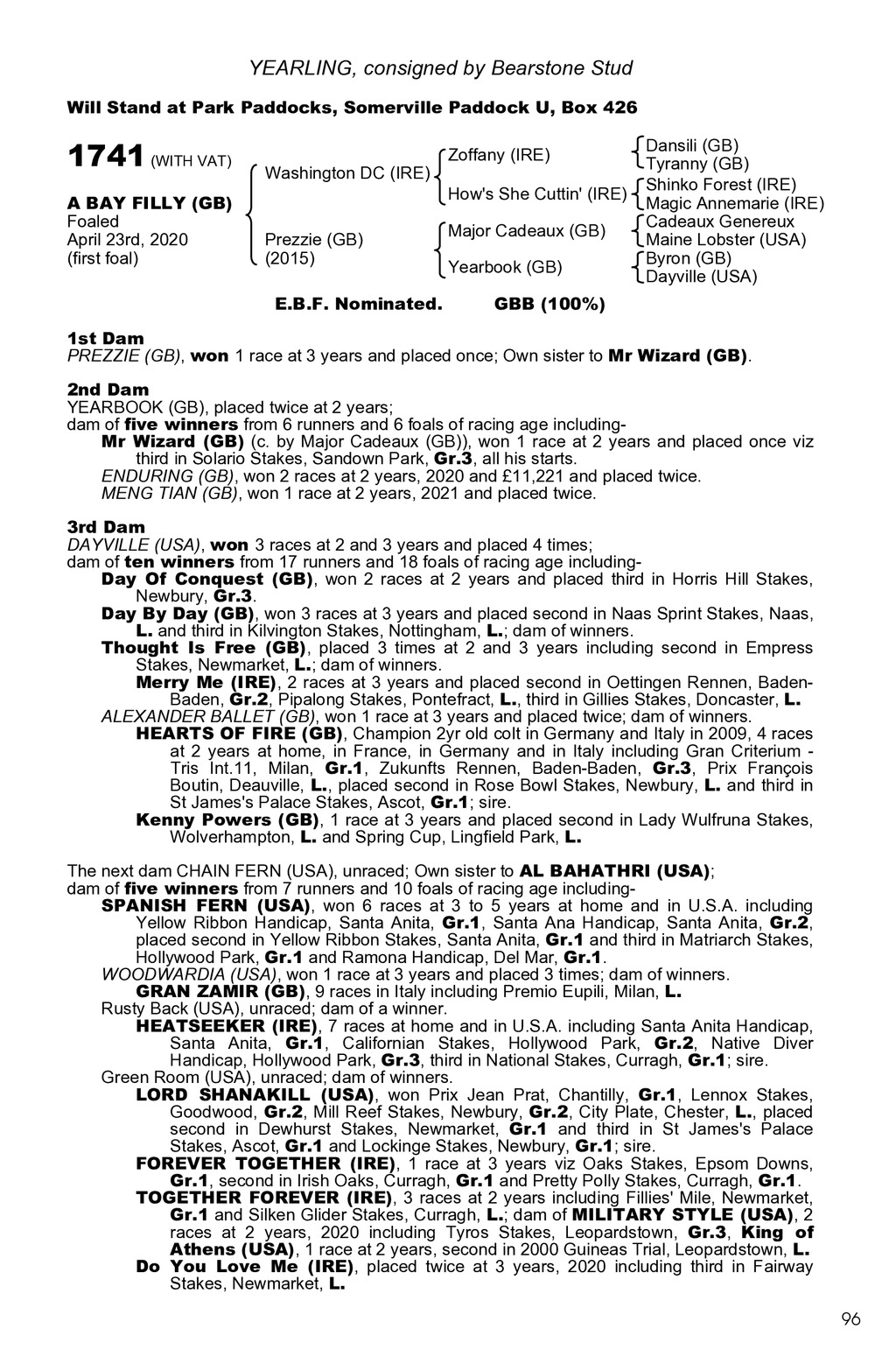 YEARLING, consigned by Bearstone Stud Will Stand at Park Paddocks, Somerville Paddock U, Box 426 1741 (WITH VAT) A BAY FILLY (GB) Foaled April 23rd, 2020 (first foal) Washington DC (IRE) Prezzie (GB) (2015) E.B.F. Nominated. Zoffany (IRE) How s She Cuttin (IRE) Major Cadeaux (GB) Yearbook (GB) Dansili (GB) Tyranny (GB) Shinko Forest (IRE) Magic Annemarie (IRE) Cadeaux Genereux Maine Lobster (USA) Byron (GB) Dayville (USA) GBB (100%) 1st Dam PREZZIE (GB), won 1 race at 3 years and placed once; Own sister to Mr Wizard (GB). 2nd Dam YEARBOOK (GB), placed twice at 2 years; dam of five winners from 6 runners and 6 foals of racing age includingMr Wizard (GB) (c. by Major Cadeaux (GB)), won 1 race at 2 years and placed once viz third in Solario Stakes, Sandown Park, Gr.3, all his starts. ENDURING (GB), won 2 races at 2 years, 2020 and 11,221 and placed twice. MENG TIAN (GB), won 1 race at 2 years, 2021 and placed twice. 3rd Dam DAYVILLE (USA), won 3 races at 2 and 3 years and placed 4 times; dam of ten winners from 17 runners and 18 foals of racing age includingDay Of Conquest (GB), won 2 races at 2 years and placed third in Horris Hill Stakes, Newbury, Gr.3. Day By Day (GB), won 3 races at 3 years and placed second in Naas Sprint Stakes, Naas, L. and third in Kilvington Stakes, Nottingham, L.; dam of winners. Thought Is Free (GB), placed 3 times at 2 and 3 years including second in Empress Stakes, Newmarket, L.; dam of winners. Merry Me (IRE), 2 races at 3 years and placed second in Oettingen Rennen, BadenBaden, Gr.2, Pipalong Stakes, Pontefract, L., third in Gillies Stakes, Doncaster, L. ALEXANDER BALLET (GB), won 1 race at 3 years and placed twice; dam of winners. HEARTS OF FIRE (GB), Champion 2yr old colt in Germany and Italy in 2009, 4 races at 2 years at home, in France, in Germany and in Italy including Gran Criterium Tris Int.11, Milan, Gr.1, Zukunfts Rennen, Baden-Baden, Gr.3, Prix Franois Boutin, Deauville, L., placed second in Rose Bowl Stakes, Newbury, L. and third in St James s Palace Stakes, Ascot, Gr.1; sire. Kenny Powers (GB), 1 race at 3 years and placed second in Lady Wulfruna Stakes, Wolverhampton, L. and Spring Cup, Lingfield Park, L. The next dam CHAIN FERN (USA), unraced; Own sister to AL BAHATHRI (USA); dam of five winners from 7 runners and 10 foals of racing age includingSPANISH FERN (USA), won 6 races at 3 to 5 years at home and in U.S.A. including Yellow Ribbon Handicap, Santa Anita, Gr.1, Santa Ana Handicap, Santa Anita, Gr.2, placed second in Yellow Ribbon Stakes, Santa Anita, Gr.1 and third in Matriarch Stakes, Hollywood Park, Gr.1 and Ramona Handicap, Del Mar, Gr.1. WOODWARDIA (USA), won 1 race at 3 years and placed 3 times; dam of winners. GRAN ZAMIR (GB), 9 races in Italy including Premio Eupili, Milan, L. Rusty Back (USA), unraced; dam of a winner. HEATSEEKER (IRE), 7 races at home and in U.S.A. including Santa Anita Handicap, Santa Anita, Gr.1, Californian Stakes, Hollywood Park, Gr.2, Native Diver Handicap, Hollywood Park, Gr.3, third in National Stakes, Curragh, Gr.1; sire. Green Room (USA), unraced; dam of winners. LORD SHANAKILL (USA), won Prix Jean Prat, Chantilly, Gr.1, Lennox Stakes, Goodwood, Gr.2, Mill Reef Stakes, Newbury, Gr.2, City Plate, Chester, L., placed second in Dewhurst Stakes, Newmarket, Gr.1 and third in St James s Palace Stakes, Ascot, Gr.1 and Lockinge Stakes, Newbury, Gr.1; sire. FOREVER TOGETHER (IRE), 1 race at 3 years viz Oaks Stakes, Epsom Downs, Gr.1, second in Irish Oaks, Curragh, Gr.1 and Pretty Polly Stakes, Curragh, Gr.1. TOGETHER FOREVER (IRE), 3 races at 2 years including Fillies Mile, Newmarket, Gr.1 and Silken Glider Stakes, Curragh, L.; dam of MILITARY STYLE (USA), 2 races at 2 years, 2020 including Tyros Stakes, Leopardstown, Gr.3, King of Athens (USA), 1 race at 2 years, second in 2000 Guineas Trial, Leopardstown, L. Do You Love Me (IRE), placed twice at 3 years, 2020 including third in Fairway Stakes, Newmarket, L. 96