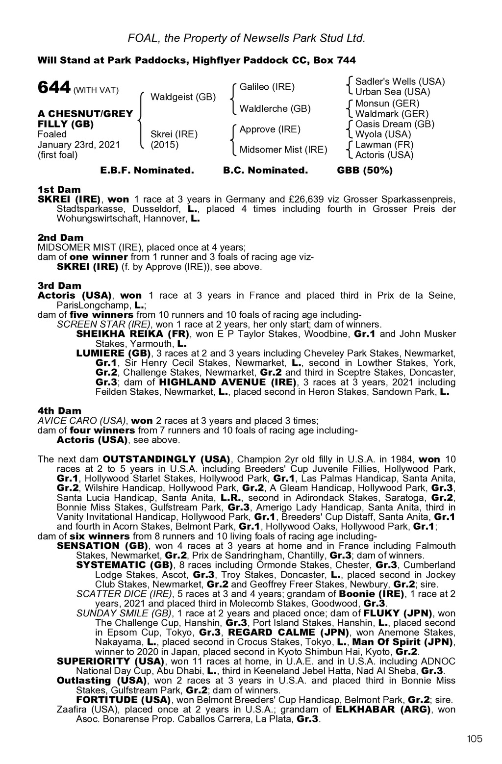 FOAL, the Property of Newsells Park Stud Ltd. Will Stand at Park Paddocks, Highflyer Paddock CC, Box 744 644 (WITH VAT) A CHESNUT/GREY FILLY (GB) Foaled January 23rd, 2021 (first foal) Waldgeist (GB) Skrei (IRE) (2015) E.B.F. Nominated. Galileo (IRE) Waldlerche (GB) Approve (IRE) Midsomer Mist (IRE) B.C. Nominated. Sadler s Wells (USA) Urban Sea (USA) Monsun (GER) Waldmark (GER) Oasis Dream (GB) Wyola (USA) Lawman (FR) Actoris (USA) GBB (50%) 1st Dam SKREI (IRE), won 1 race at 3 years in Germany and 26,639 viz Grosser Sparkassenpreis, Stadtsparkasse, Dusseldorf, L., placed 4 times including fourth in Grosser Preis der Wohungswirtschaft, Hannover, L. 2nd Dam MIDSOMER MIST (IRE), placed once at 4 years; dam of one winner from 1 runner and 3 foals of racing age vizSKREI (IRE) (f. by Approve (IRE)), see above. 3rd Dam Actoris (USA), won 1 race at 3 years in France and placed third in Prix de la Seine, ParisLongchamp, L.; dam of five winners from 10 runners and 10 foals of racing age includingSCREEN STAR (IRE), won 1 race at 2 years, her only start; dam of winners. SHEIKHA REIKA (FR), won E P Taylor Stakes, Woodbine, Gr.1 and John Musker Stakes, Yarmouth, L. LUMIERE (GB), 3 races at 2 and 3 years including Cheveley Park Stakes, Newmarket, Gr.1, Sir Henry Cecil Stakes, Newmarket, L., second in Lowther Stakes, York, Gr.2, Challenge Stakes, Newmarket, Gr.2 and third in Sceptre Stakes, Doncaster, Gr.3; dam of HIGHLAND AVENUE (IRE), 3 races at 3 years, 2021 including Feilden Stakes, Newmarket, L., placed second in Heron Stakes, Sandown Park, L. 4th Dam AVICE CARO (USA), won 2 races at 3 years and placed 3 times; dam of four winners from 7 runners and 10 foals of racing age includingActoris (USA), see above. The next dam OUTSTANDINGLY (USA), Champion 2yr old filly in U.S.A. in 1984, won 10 races at 2 to 5 years in U.S.A. including Breeders Cup Juvenile Fillies, Hollywood Park, Gr.1, Hollywood Starlet Stakes, Hollywood Park, Gr.1, Las Palmas Handicap, Santa Anita, Gr.2, Wilshire Handicap, Hollywood Park, Gr.2, A Gleam Handicap, Hollywood Park, Gr.3, Santa Lucia Handicap, Santa Anita, L.R., second in Adirondack Stakes, Saratoga, Gr.2, Bonnie Miss Stakes, Gulfstream Park, Gr.3, Amerigo Lady Handicap, Santa Anita, third in Vanity Invitational Handicap, Hollywood Park, Gr.1, Breeders Cup Distaff, Santa Anita, Gr.1 and fourth in Acorn Stakes, Belmont Park, Gr.1, Hollywood Oaks, Hollywood Park, Gr.1; dam of six winners from 8 runners and 10 living foals of racing age includingSENSATION (GB), won 4 races at 3 years at home and in France including Falmouth Stakes, Newmarket, Gr.2, Prix de Sandringham, Chantilly, Gr.3; dam of winners. SYSTEMATIC (GB), 8 races including Ormonde Stakes, Chester, Gr.3, Cumberland Lodge Stakes, Ascot, Gr.3, Troy Stakes, Doncaster, L., placed second in Jockey Club Stakes, Newmarket, Gr.2 and Geoffrey Freer Stakes, Newbury, Gr.2; sire. SCATTER DICE (IRE), 5 races at 3 and 4 years; grandam of Boonie (IRE), 1 race at 2 years, 2021 and placed third in Molecomb Stakes, Goodwood, Gr.3. SUNDAY SMILE (GB), 1 race at 2 years and placed once; dam of FLUKY (JPN), won The Challenge Cup, Hanshin, Gr.3, Port Island Stakes, Hanshin, L., placed second in Epsom Cup, Tokyo, Gr.3, REGARD CALME (JPN), won Anemone Stakes, Nakayama, L., placed second in Crocus Stakes, Tokyo, L., Man Of Spirit (JPN), winner to 2020 in Japan, placed second in Kyoto Shimbun Hai, Kyoto, Gr.2. SUPERIORITY (USA), won 11 races at home, in U.A.E. and in U.S.A. including ADNOC National Day Cup, Abu Dhabi, L., third in Keeneland Jebel Hatta, Nad Al Sheba, Gr.3. Outlasting (USA), won 2 races at 3 years in U.S.A. and placed third in Bonnie Miss Stakes, Gulfstream Park, Gr.2; dam of winners. FORTITUDE (USA), won Belmont Breeders Cup Handicap, Belmont Park, Gr.2; sire. Zaafira (USA), placed once at 2 years in U.S.A.; grandam of ELKHABAR (ARG), won Asoc. Bonarense Prop. Caballos Carrera, La Plata, Gr.3. 105