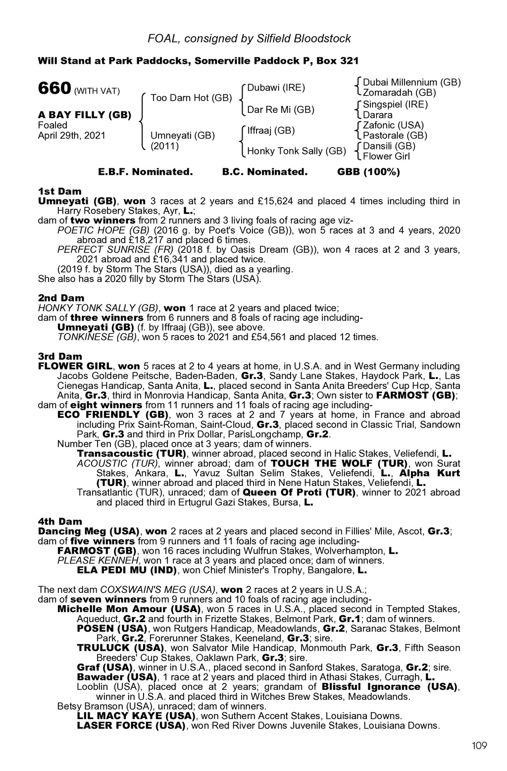 FOAL, consigned by Silfield Bloodstock Will Stand at Park Paddocks, Somerville Paddock P, Box 321 660 (WITH VAT) A BAY FILLY (GB) Foaled April 29th, 2021 Too Darn Hot (GB) Umneyati (GB) (2011) E.B.F. Nominated. Dubawi (IRE) Dar Re Mi (GB) Iffraaj (GB) Honky Tonk Sally (GB) B.C. Nominated. Dubai Millennium (GB) Zomaradah (GB) Singspiel (IRE) Darara Zafonic (USA) Pastorale (GB) Dansili (GB) Flower Girl GBB (100%) 1st Dam Umneyati (GB), won 3 races at 2 years and 15,624 and placed 4 times including third in Harry Rosebery Stakes, Ayr, L.; dam of two winners from 2 runners and 3 living foals of racing age vizPOETIC HOPE (GB) (2016 g. by Poet s Voice (GB)), won 5 races at 3 and 4 years, 2020 abroad and 18,217 and placed 6 times. PERFECT SUNRISE (FR) (2018 f. by Oasis Dream (GB)), won 4 races at 2 and 3 years, 2021 abroad and 16,341 and placed twice. (2019 f. by Storm The Stars (USA)), died as a yearling. She also has a 2020 filly by Storm The Stars (USA). 2nd Dam HONKY TONK SALLY (GB), won 1 race at 2 years and placed twice; dam of three winners from 6 runners and 8 foals of racing age includingUmneyati (GB) (f. by Iffraaj (GB)), see above. TONKINESE (GB), won 5 races to 2021 and 54,561 and placed 12 times. 3rd Dam FLOWER GIRL, won 5 races at 2 to 4 years at home, in U.S.A. and in West Germany including Jacobs Goldene Peitsche, Baden-Baden, Gr.3, Sandy Lane Stakes, Haydock Park, L., Las Cienegas Handicap, Santa Anita, L., placed second in Santa Anita Breeders Cup Hcp, Santa Anita, Gr.3, third in Monrovia Handicap, Santa Anita, Gr.3; Own sister to FARMOST (GB); dam of eight winners from 11 runners and 11 foals of racing age includingECO FRIENDLY (GB), won 3 races at 2 and 7 years at home, in France and abroad including Prix Saint-Roman, Saint-Cloud, Gr.3, placed second in Classic Trial, Sandown Park, Gr.3 and third in Prix Dollar, ParisLongchamp, Gr.2. Number Ten (GB), placed once at 3 years; dam of winners. Transacoustic (TUR), winner abroad, placed second in Halic Stakes, Veliefendi, L. ACOUSTIC (TUR), winner abroad; dam of TOUCH THE WOLF (TUR), won Surat Stakes, Ankara, L., Yavuz Sultan Selim Stakes, Veliefendi, L., Alpha Kurt (TUR), winner abroad and placed third in Nene Hatun Stakes, Veliefendi, L. Transatlantic (TUR), unraced; dam of Queen Of Proti (TUR), winner to 2021 abroad and placed third in Ertugrul Gazi Stakes, Bursa, L. 4th Dam Dancing Meg (USA), won 2 races at 2 years and placed second in Fillies Mile, Ascot, Gr.3; dam of five winners from 9 runners and 11 foals of racing age includingFARMOST (GB), won 16 races including Wulfrun Stakes, Wolverhampton, L. PLEASE KENNEH, won 1 race at 3 years and placed once; dam of winners. ELA PEDI MU (IND), won Chief Minister s Trophy, Bangalore, L. The next dam COXSWAIN S MEG (USA), won 2 races at 2 years in U.S.A.; dam of seven winners from 9 runners and 10 foals of racing age includingMichelle Mon Amour (USA), won 5 races in U.S.A., placed second in Tempted Stakes, Aqueduct, Gr.2 and fourth in Frizette Stakes, Belmont Park, Gr.1; dam of winners. POSEN (USA), won Rutgers Handicap, Meadowlands, Gr.2, Saranac Stakes, Belmont Park, Gr.2, Forerunner Stakes, Keeneland, Gr.3; sire. TRULUCK (USA), won Salvator Mile Handicap, Monmouth Park, Gr.3, Fifth Season Breeders Cup Stakes, Oaklawn Park, Gr.3; sire. Graf (USA), winner in U.S.A., placed second in Sanford Stakes, Saratoga, Gr.2; sire. Bawader (USA), 1 race at 2 years and placed third in Athasi Stakes, Curragh, L. Looblin (USA), placed once at 2 years; grandam of Blissful Ignorance (USA), winner in U.S.A. and placed third in Witches Brew Stakes, Meadowlands. Betsy Bramson (USA), unraced; dam of winners. LIL MACY KAYE (USA), won Suthern Accent Stakes, Louisiana Downs. LASER FORCE (USA), won Red River Downs Juvenile Stakes, Louisiana Downs. 109