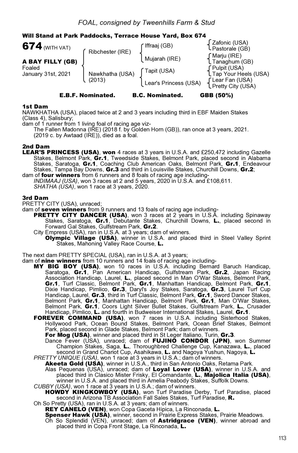 FOAL, consigned by Tweenhills Farm & Stud Will Stand at Park Paddocks, Terrace House Yard, Box 674 674 (WITH VAT) A BAY FILLY (GB) Foaled January 31st, 2021 Iffraaj (GB) Ribchester (IRE) Mujarah (IRE) Nawkhatha (USA) (2013) E.B.F. Nominated. Tapit (USA) Lear s Princess (USA) B.C. Nominated. Zafonic (USA) Pastorale (GB) Marju (IRE) Tanaghum (GB) Pulpit (USA) Tap Your Heels (USA) Lear Fan (USA) Pretty City (USA) GBB (50%) 1st Dam NAWKHATHA (USA), placed twice at 2 and 3 years including third in EBF Maiden Stakes (Class 4), Salisbury; dam of 1 runner from 1 living foal of racing age vizThe Fallen Madonna (IRE) (2018 f. by Golden Horn (GB)), ran once at 3 years, 2021. (2019 c. by Awtaad (IRE)), died as a foal. 2nd Dam LEAR S PRINCESS (USA), won 4 races at 3 years in U.S.A. and 250,472 including Gazelle Stakes, Belmont Park, Gr.1, Tweedside Stakes, Belmont Park, placed second in Alabama Stakes, Saratoga, Gr.1, Coaching Club American Oaks, Belmont Park, Gr.1, Endeavour Stakes, Tampa Bay Downs, Gr.3 and third in Louisville Stakes, Churchill Downs, Gr.2; dam of four winners from 6 runners and 8 foals of racing age includingINDIMAAJ (USA), won 3 races at 2 and 5 years, 2020 in U.S.A. and 108,611. SHATHA (USA), won 1 race at 3 years, 2020. 3rd Dam PRETTY CITY (USA), unraced; dam of seven winners from 9 runners and 13 foals of racing age includingPRETTY CITY DANCER (USA), won 3 races at 2 years in U.S.A. including Spinaway Stakes, Saratoga, Gr.1, Debutante Stakes, Churchill Downs, L., placed second in Forward Gal Stakes, Gulfstream Park, Gr.2. City Empress (USA), ran in U.S.A. at 3 years; dam of winners. Olympic Village (USA), winner in U.S.A. and placed third in Steel Valley Sprint Stakes, Mahoning Valley Race Course, L. The next dam PRETTY SPECIAL (USA), ran in U.S.A. at 3 years; dam of nine winners from 10 runners and 14 foals of racing age includingMY BIG BOY (USA), won 10 races in U.S.A. including Bernard Baruch Handicap, Saratoga, Gr.1, Pan American Handicap, Gulfstream Park, Gr.2, Japan Racing Association Handicap, Laurel, L., placed second in Man O War Stakes, Belmont Park, Gr.1, Turf Classic, Belmont Park, Gr.1, Manhattan Handicap, Belmont Park, Gr.1, Dixie Handicap, Pimlico, Gr.3, Daryl s Joy Stakes, Saratoga, Gr.3, Laurel Turf Cup Handicap, Laurel, Gr.3, third in Turf Classic, Belmont Park, Gr.1, Sword Dancer Stakes, Belmont Park, Gr.1, Manhattan Handicap, Belmont Park, Gr.1, Man O War Stakes, Belmont Park, Gr.1, Coors Light Silver Bullet Stakes, Gulfstream Park, L., Crusader Handicap, Pimlico, L. and fourth in Budweiser International Stakes, Laurel, Gr.1. FOREVER COMMAND (USA), won 7 races in U.S.A. including Sisterhood Stakes, Hollywood Park, Ocean Bound Stakes, Belmont Park, Ocean Brief Stakes, Belmont Park, placed second in Glade Stakes, Belmont Park; dam of winners. For Mog (USA), winner and placed third in St Leger Italiano, Turin, Gr.3. Dance Fever (USA), unraced; dam of FUJINO CONDOR (JPN), won Summer Champion Stakes, Saga, L., Thoroughbred Challenge Cup, Kanazawa, L., placed second in Grand Chariot Cup, Asahikawa, L. and Nagoya Yushun, Nagoya, L. PRETTY UNIQUE (USA), won 1 race at 3 years in U.S.A.; dam of winners. Akeeta Gold (USA), winner in U.S.A., third in San Antonio Oaks, Retama Park. Alas Pequenas (USA), unraced; dam of Loyal Lover (USA), winner in U.S.A. and placed third in Clasico Mister Frisky, El Comandante, L., Majolica Italia (USA), winner in U.S.A. and placed third in Amelia Peabody Stakes, Suffolk Downs. CUBBY (USA), won 1 race at 3 years in U.S.A.; dam of winners. HOWDY KINGKOWBOY (USA), won Turf Paradise Derby, Turf Paradise, placed second in Arizona TB Association Fall Sales Stakes, Turf Paradise, R. Oh So Pretty (USA), ran in U.S.A. at 3 years; dam of winners. REY CANELO (VEN), won Copa Gaceta Hipica, La Rinconada, L. Spenser Hawk (USA), winner, second in Prairie Express Stakes, Prairie Meadows. Oh So Splendid (VEN), unraced; dam of Astridgrace (VEN), winner abroad and placed third in Copa Front Stage, La Rinconada, L. 113