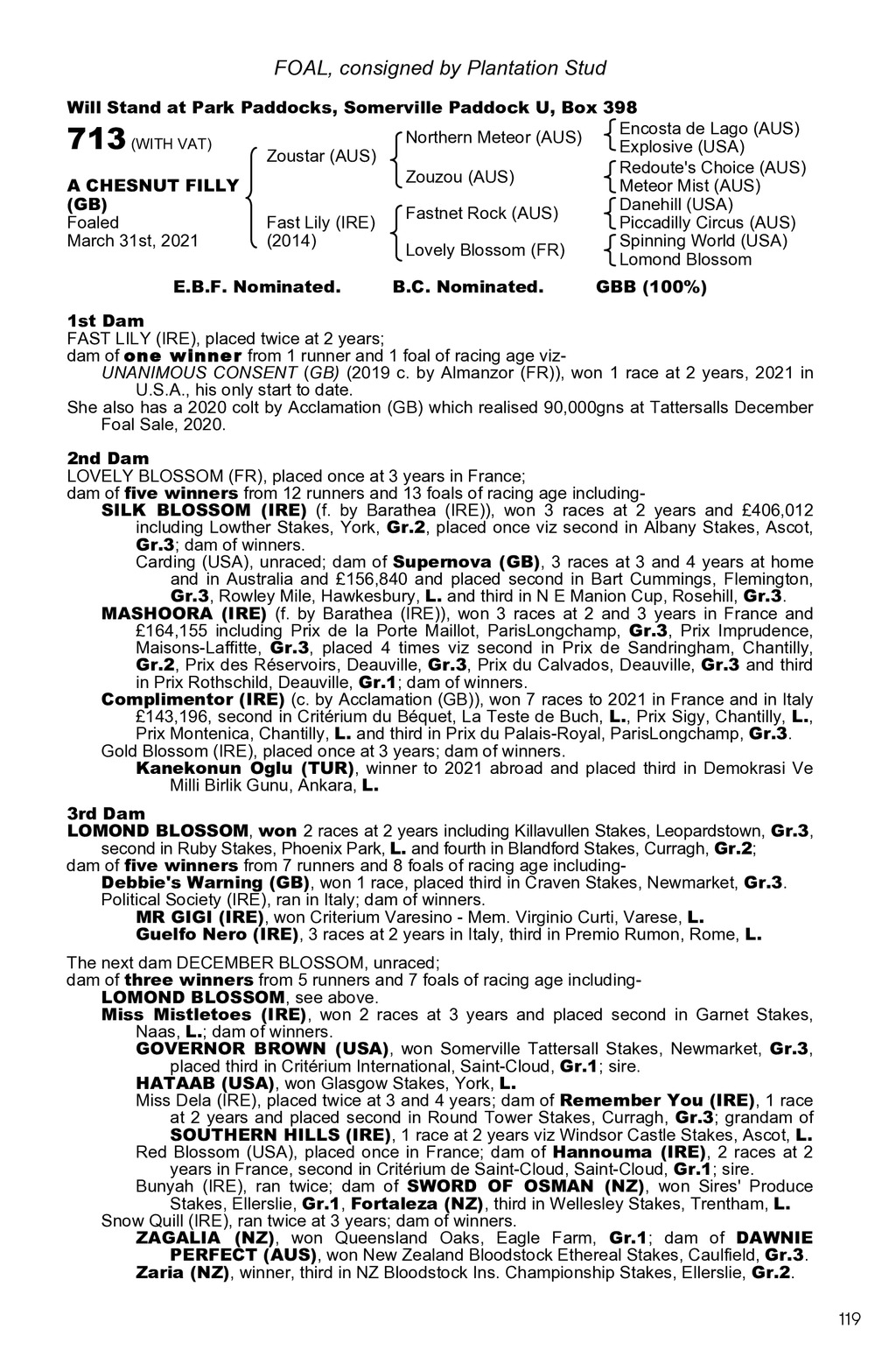 FOAL, consigned by Plantation Stud Will Stand at Park Paddocks, Somerville Paddock U, Box 398 Encosta de Lago (AUS) Northern Meteor (AUS) (WITH VAT) Explosive (USA) Zoustar (AUS) Redoute s Choice (AUS) Zouzou (AUS) A CHESNUT FILLY Meteor Mist (AUS) Danehill (USA) (GB) Fastnet Rock (AUS) Foaled Fast Lily (IRE) Piccadilly Circus (AUS) March 31st, 2021 (2014) Spinning World (USA) Lovely Blossom (FR) Lomond Blossom 713 E.B.F. Nominated. B.C. Nominated. GBB (100%) 1st Dam FAST LILY (IRE), placed twice at 2 years; dam of o n e w i n n e r from 1 runner and 1 foal of racing age vizUNANIMOUS CONSENT (GB) (2019 c. by Almanzor (FR)), won 1 race at 2 years, 2021 in U.S.A., his only start to date. She also has a 2020 colt by Acclamation (GB) which realised 90,000gns at Tattersalls December Foal Sale, 2020. 2nd Dam LOVELY BLOSSOM (FR), placed once at 3 years in France; dam of five winners from 12 runners and 13 foals of racing age includingSILK BLOSSOM (IRE) (f. by Barathea (IRE)), won 3 races at 2 years and 406,012 including Lowther Stakes, York, Gr.2, placed once viz second in Albany Stakes, Ascot, Gr.3; dam of winners. Carding (USA), unraced; dam of Supernova (GB), 3 races at 3 and 4 years at home and in Australia and 156,840 and placed second in Bart Cummings, Flemington, Gr.3, Rowley Mile, Hawkesbury, L. and third in N E Manion Cup, Rosehill, Gr.3. MASHOORA (IRE) (f. by Barathea (IRE)), won 3 races at 2 and 3 years in France and 164,155 including Prix de la Porte Maillot, ParisLongchamp, Gr.3, Prix Imprudence, Maisons-Laffitte, Gr.3, placed 4 times viz second in Prix de Sandringham, Chantilly, Gr.2, Prix des Rservoirs, Deauville, Gr.3, Prix du Calvados, Deauville, Gr.3 and third in Prix Rothschild, Deauville, Gr.1; dam of winners. Complimentor (IRE) (c. by Acclamation (GB)), won 7 races to 2021 in France and in Italy 143,196, second in Critrium du Bquet, La Teste de Buch, L., Prix Sigy, Chantilly, L., Prix Montenica, Chantilly, L. and third in Prix du Palais-Royal, ParisLongchamp, Gr.3. Gold Blossom (IRE), placed once at 3 years; dam of winners. Kanekonun Oglu (TUR), winner to 2021 abroad and placed third in Demokrasi Ve Milli Birlik Gunu, Ankara, L. 3rd Dam LOMOND BLOSSOM, won 2 races at 2 years including Killavullen Stakes, Leopardstown, Gr.3, second in Ruby Stakes, Phoenix Park, L. and fourth in Blandford Stakes, Curragh, Gr.2; dam of five winners from 7 runners and 8 foals of racing age includingDebbie s Warning (GB), won 1 race, placed third in Craven Stakes, Newmarket, Gr.3. Political Society (IRE), ran in Italy; dam of winners. MR GIGI (IRE), won Criterium Varesino - Mem. Virginio Curti, Varese, L. Guelfo Nero (IRE), 3 races at 2 years in Italy, third in Premio Rumon, Rome, L. The next dam DECEMBER BLOSSOM, unraced; dam of three winners from 5 runners and 7 foals of racing age includingLOMOND BLOSSOM, see above. Miss Mistletoes (IRE), won 2 races at 3 years and placed second in Garnet Stakes, Naas, L.; dam of winners. GOVERNOR BROWN (USA), won Somerville Tattersall Stakes, Newmarket, Gr.3, placed third in Critrium International, Saint-Cloud, Gr.1; sire. HATAAB (USA), won Glasgow Stakes, York, L. Miss Dela (IRE), placed twice at 3 and 4 years; dam of Remember You (IRE), 1 race at 2 years and placed second in Round Tower Stakes, Curragh, Gr.3; grandam of SOUTHERN HILLS (IRE), 1 race at 2 years viz Windsor Castle Stakes, Ascot, L. Red Blossom (USA), placed once in France; dam of Hannouma (IRE), 2 races at 2 years in France, second in Critrium de Saint-Cloud, Saint-Cloud, Gr.1; sire. Bunyah (IRE), ran twice; dam of SWORD OF OSMAN (NZ), won Sires Produce Stakes, Ellerslie, Gr.1, Fortaleza (NZ), third in Wellesley Stakes, Trentham, L. Snow Quill (IRE), ran twice at 3 years; dam of winners. ZAGALIA (NZ), won Queensland Oaks, Eagle Farm, Gr.1; dam of DAWNIE PERFECT (AUS), won New Zealand Bloodstock Ethereal Stakes, Caulfield, Gr.3. Zaria (NZ), winner, third in NZ Bloodstock Ins. Championship Stakes, Ellerslie, Gr.2. 119