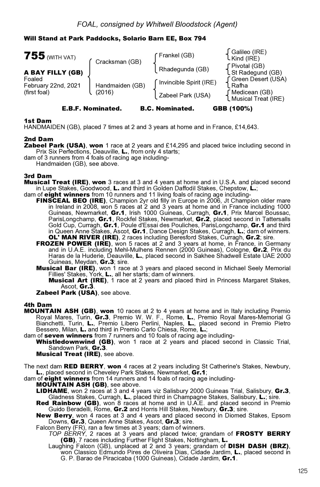 FOAL, consigned by Whitwell Bloodstock (Agent) Will Stand at Park Paddocks, Solario Barn EE, Box 794 755 (WITH VAT) A BAY FILLY (GB) Foaled February 22nd, 2021 (first foal) Cracksman (GB) Handmaiden (GB) (2016) E.B.F. Nominated. Frankel (GB) Rhadegunda (GB) Invincible Spirit (IRE) Zabeel Park (USA) B.C. Nominated. Galileo (IRE) Kind (IRE) Pivotal (GB) St Radegund (GB) Green Desert (USA) Rafha Medicean (GB) Musical Treat (IRE) GBB (100%) 1st Dam HANDMAIDEN (GB), placed 7 times at 2 and 3 years at home and in France, 14,643. 2nd Dam Zabeel Park (USA), won 1 race at 2 years and 14,295 and placed twice including second in Prix Six Perfections, Deauville, L., from only 4 starts; dam of 3 runners from 4 foals of racing age includingHandmaiden (GB), see above. 3rd Dam Musical Treat (IRE), won 3 races at 3 and 4 years at home and in U.S.A. and placed second in Lupe Stakes, Goodwood, L. and third in Golden Daffodil Stakes, Chepstow, L.; dam of eight winners from 10 runners and 11 living foals of racing age includingFINSCEAL BEO (IRE), Champion 2yr old filly in Europe in 2006, Jt Champion older mare in Ireland in 2008, won 5 races at 2 and 3 years at home and in France including 1000 Guineas, Newmarket, Gr.1, Irish 1000 Guineas, Curragh, Gr.1, Prix Marcel Boussac, ParisLongchamp, Gr.1, Rockfel Stakes, Newmarket, Gr.2, placed second in Tattersalls Gold Cup, Curragh, Gr.1, Poule d Essai des Pouliches, ParisLongchamp, Gr.1 and third in Queen Anne Stakes, Ascot, Gr.1, Dance Design Stakes, Curragh, L.; dam of winners. OL MAN RIVER (IRE), 2 races including Beresford Stakes, Curragh, Gr.2; sire. FROZEN POWER (IRE), won 5 races at 2 and 3 years at home, in France, in Germany and in U.A.E. including Mehl-Mulhens Rennen (2000 Guineas), Cologne, Gr.2, Prix du Haras de la Huderie, Deauville, L., placed second in Sakhee Shadwell Estate UAE 2000 Guineas, Meydan, Gr.3; sire. Musical Bar (IRE), won 1 race at 3 years and placed second in Michael Seely Memorial Fillies Stakes, York, L., all her starts; dam of winners. Musical Art (IRE), 1 race at 2 years and placed third in Princess Margaret Stakes, Ascot, Gr.3. Zabeel Park (USA), see above. 4th Dam MOUNTAIN ASH (GB), won 10 races at 2 to 4 years at home and in Italy including Premio Royal Mares, Turin, Gr.3, Premio W. W. F., Rome, L., Premio Royal Mares-Memorial G Bianchetti, Turin, L., Premio Libero Perlini, Naples, L., placed second in Premio Pietro Bessero, Milan, L. and third in Premio Carlo Chiesa, Rome, L.; dam of seven winners from 7 runners and 10 foals of racing age includingWhistledownwind (GB), won 1 race at 2 years and placed second in Classic Trial, Sandown Park, Gr.3. Musical Treat (IRE), see above. The next dam RED BERRY, won 4 races at 2 years including St Catherine s Stakes, Newbury, L., placed second in Cheveley Park Stakes, Newmarket, Gr.1; dam of eight winners from 14 runners and 14 foals of racing age includingMOUNTAIN ASH (GB), see above. LIDHAME, won 2 races at 3 and 4 years viz Salisbury 2000 Guineas Trial, Salisbury, Gr.3, Gladness Stakes, Curragh, L., placed third in Champagne Stakes, Salisbury, L.; sire. Red Rainbow (GB), won 8 races at home and in U.A.E. and placed second in Premio Guido Beradelli, Rome, Gr.2 and Horris Hill Stakes, Newbury, Gr.3; sire. New Berry, won 4 races at 3 and 4 years and placed second in Diomed Stakes, Epsom Downs, Gr.3, Queen Anne Stakes, Ascot, Gr.3; sire. Falcon Berry (FR), ran a few times at 3 years; dam of winners. TOP BERRY, 2 races at 3 years and placed twice; grandam of FROSTY BERRY (GB), 7 races including Further Flight Stakes, Nottingham, L. Laughing Falcon (GB), unplaced at 2 and 3 years; grandam of DISH DASH (BRZ), won Classico Edmundo Pires de Oliveira Dias, Cidade Jardim, L., placed second in G. P. Barao de Piracicaba (1000 Guineas), Cidade Jardim, Gr.1. 125
