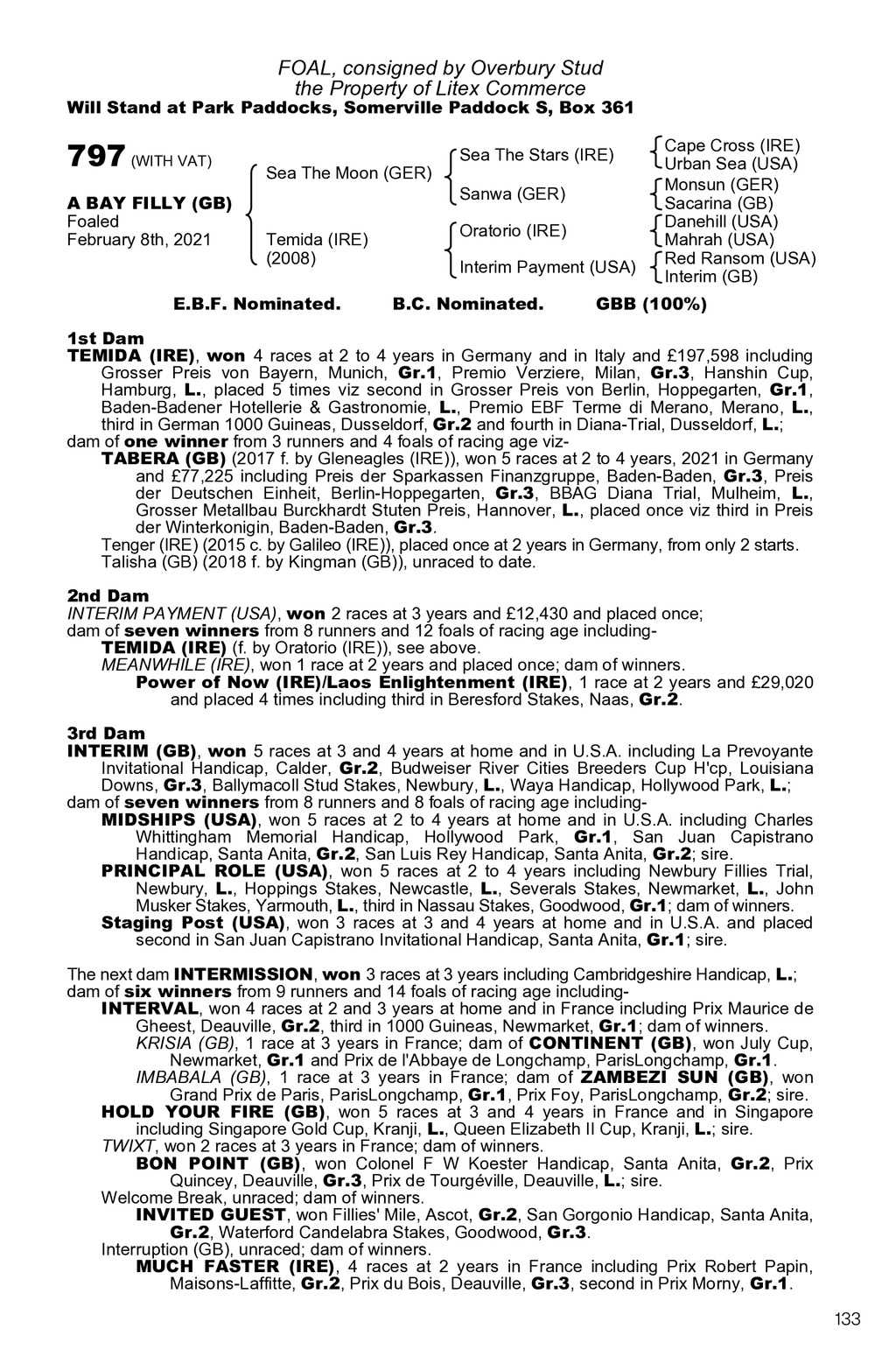 FOAL, consigned by Overbury Stud the Property of Litex Commerce Will Stand at Park Paddocks, Somerville Paddock S, Box 361 797 (WITH VAT) A BAY FILLY (GB) Foaled February 8th, 2021 Sea The Moon (GER) Temida (IRE) (2008) E.B.F. Nominated. Sea The Stars (IRE) Sanwa (GER) Oratorio (IRE) Interim Payment (USA) B.C. Nominated. Cape Cross (IRE) Urban Sea (USA) Monsun (GER) Sacarina (GB) Danehill (USA) Mahrah (USA) Red Ransom (USA) Interim (GB) GBB (100%) 1st Dam TEMIDA (IRE), won 4 races at 2 to 4 years in Germany and in Italy and 197,598 including Grosser Preis von Bayern, Munich, Gr.1, Premio Verziere, Milan, Gr.3, Hanshin Cup, Hamburg, L., placed 5 times viz second in Grosser Preis von Berlin, Hoppegarten, Gr.1, Baden-Badener Hotellerie & Gastronomie, L., Premio EBF Terme di Merano, Merano, L., third in German 1000 Guineas, Dusseldorf, Gr.2 and fourth in Diana-Trial, Dusseldorf, L.; dam of one winner from 3 runners and 4 foals of racing age vizTABERA (GB) (2017 f. by Gleneagles (IRE)), won 5 races at 2 to 4 years, 2021 in Germany and 77,225 including Preis der Sparkassen Finanzgruppe, Baden-Baden, Gr.3, Preis der Deutschen Einheit, Berlin-Hoppegarten, Gr.3, BBAG Diana Trial, Mulheim, L., Grosser Metallbau Burckhardt Stuten Preis, Hannover, L., placed once viz third in Preis der Winterkonigin, Baden-Baden, Gr.3. Tenger (IRE) (2015 c. by Galileo (IRE)), placed once at 2 years in Germany, from only 2 starts. Talisha (GB) (2018 f. by Kingman (GB)), unraced to date. 2nd Dam INTERIM PAYMENT (USA), won 2 races at 3 years and 12,430 and placed once; dam of seven winners from 8 runners and 12 foals of racing age includingTEMIDA (IRE) (f. by Oratorio (IRE)), see above. MEANWHILE (IRE), won 1 race at 2 years and placed once; dam of winners. Power of Now (IRE)/Laos Enlightenment (IRE), 1 race at 2 years and 29,020 and placed 4 times including third in Beresford Stakes, Naas, Gr.2. 3rd Dam INTERIM (GB), won 5 races at 3 and 4 years at home and in U.S.A. including La Prevoyante Invitational Handicap, Calder, Gr.2, Budweiser River Cities Breeders Cup H cp, Louisiana Downs, Gr.3, Ballymacoll Stud Stakes, Newbury, L., Waya Handicap, Hollywood Park, L.; dam of seven winners from 8 runners and 8 foals of racing age includingMIDSHIPS (USA), won 5 races at 2 to 4 years at home and in U.S.A. including Charles Whittingham Memorial Handicap, Hollywood Park, Gr.1, San Juan Capistrano Handicap, Santa Anita, Gr.2, San Luis Rey Handicap, Santa Anita, Gr.2; sire. PRINCIPAL ROLE (USA), won 5 races at 2 to 4 years including Newbury Fillies Trial, Newbury, L., Hoppings Stakes, Newcastle, L., Severals Stakes, Newmarket, L., John Musker Stakes, Yarmouth, L., third in Nassau Stakes, Goodwood, Gr.1; dam of winners. Staging Post (USA), won 3 races at 3 and 4 years at home and in U.S.A. and placed second in San Juan Capistrano Invitational Handicap, Santa Anita, Gr.1; sire. The next dam INTERMISSION, won 3 races at 3 years including Cambridgeshire Handicap, L.; dam of six winners from 9 runners and 14 foals of racing age includingINTERVAL, won 4 races at 2 and 3 years at home and in France including Prix Maurice de Gheest, Deauville, Gr.2, third in 1000 Guineas, Newmarket, Gr.1; dam of winners. KRISIA (GB), 1 race at 3 years in France; dam of CONTINENT (GB), won July Cup, Newmarket, Gr.1 and Prix de l Abbaye de Longchamp, ParisLongchamp, Gr.1. IMBABALA (GB), 1 race at 3 years in France; dam of ZAMBEZI SUN (GB), won Grand Prix de Paris, ParisLongchamp, Gr.1, Prix Foy, ParisLongchamp, Gr.2; sire. HOLD YOUR FIRE (GB), won 5 races at 3 and 4 years in France and in Singapore including Singapore Gold Cup, Kranji, L., Queen Elizabeth II Cup, Kranji, L.; sire. TWIXT, won 2 races at 3 years in France; dam of winners. BON POINT (GB), won Colonel F W Koester Handicap, Santa Anita, Gr.2, Prix Quincey, Deauville, Gr.3, Prix de Tourgville, Deauville, L.; sire. Welcome Break, unraced; dam of winners. INVITED GUEST, won Fillies Mile, Ascot, Gr.2, San Gorgonio Handicap, Santa Anita, Gr.2, Waterford Candelabra Stakes, Goodwood, Gr.3. Interruption (GB), unraced; dam of winners. MUCH FASTER (IRE), 4 races at 2 years in France including Prix Robert Papin, Maisons-Laffitte, Gr.2, Prix du Bois, Deauville, Gr.3, second in Prix Morny, Gr.1. 133