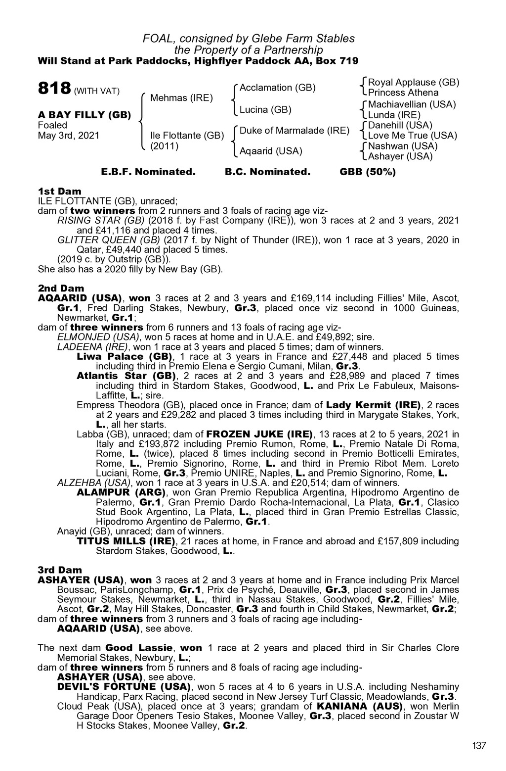 FOAL, consigned by Glebe Farm Stables the Property of a Partnership Will Stand at Park Paddocks, Highflyer Paddock AA, Box 719 818 (WITH VAT) A BAY FILLY (GB) Foaled May 3rd, 2021 Mehmas (IRE) Ile Flottante (GB) (2011) E.B.F. Nominated. Acclamation (GB) Lucina (GB) Duke of Marmalade (IRE) Aqaarid (USA) B.C. Nominated. Royal Applause (GB) Princess Athena Machiavellian (USA) Lunda (IRE) Danehill (USA) Love Me True (USA) Nashwan (USA) Ashayer (USA) GBB (50%) 1st Dam ILE FLOTTANTE (GB), unraced; dam of two winners from 2 runners and 3 foals of racing age vizRISING STAR (GB) (2018 f. by Fast Company (IRE)), won 3 races at 2 and 3 years, 2021 and 41,116 and placed 4 times. GLITTER QUEEN (GB) (2017 f. by Night of Thunder (IRE)), won 1 race at 3 years, 2020 in Qatar, 49,440 and placed 5 times. (2019 c. by Outstrip (GB)). She also has a 2020 filly by New Bay (GB). 2nd Dam AQAARID (USA), won 3 races at 2 and 3 years and 169,114 including Fillies Mile, Ascot, Gr.1, Fred Darling Stakes, Newbury, Gr.3, placed once viz second in 1000 Guineas, Newmarket, Gr.1; dam of three winners from 6 runners and 13 foals of racing age vizELMONJED (USA), won 5 races at home and in U.A.E. and 49,892; sire. LADEENA (IRE), won 1 race at 3 years and placed 5 times; dam of winners. Liwa Palace (GB), 1 race at 3 years in France and 27,448 and placed 5 times including third in Premio Elena e Sergio Cumani, Milan, Gr.3. Atlantis Star (GB), 2 races at 2 and 3 years and 28,989 and placed 7 times including third in Stardom Stakes, Goodwood, L. and Prix Le Fabuleux, MaisonsLaffitte, L.; sire. Empress Theodora (GB), placed once in France; dam of Lady Kermit (IRE), 2 races at 2 years and 29,282 and placed 3 times including third in Marygate Stakes, York, L., all her starts. Labba (GB), unraced; dam of FROZEN JUKE (IRE), 13 races at 2 to 5 years, 2021 in Italy and 193,872 including Premio Rumon, Rome, L., Premio Natale Di Roma, Rome, L. (twice), placed 8 times including second in Premio Botticelli Emirates, Rome, L., Premio Signorino, Rome, L. and third in Premio Ribot Mem. Loreto Luciani, Rome, Gr.3, Premio UNIRE, Naples, L. and Premio Signorino, Rome, L. ALZEHBA (USA), won 1 race at 3 years in U.S.A. and 20,514; dam of winners. ALAMPUR (ARG), won Gran Premio Republica Argentina, Hipodromo Argentino de Palermo, Gr.1, Gran Premio Dardo Rocha-Internacional, La Plata, Gr.1, Clasico Stud Book Argentino, La Plata, L., placed third in Gran Premio Estrellas Classic, Hipodromo Argentino de Palermo, Gr.1. Anayid (GB), unraced; dam of winners. TITUS MILLS (IRE), 21 races at home, in France and abroad and 157,809 including Stardom Stakes, Goodwood, L.. 3rd Dam ASHAYER (USA), won 3 races at 2 and 3 years at home and in France including Prix Marcel Boussac, ParisLongchamp, Gr.1, Prix de Psych, Deauville, Gr.3, placed second in James Seymour Stakes, Newmarket, L., third in Nassau Stakes, Goodwood, Gr.2, Fillies Mile, Ascot, Gr.2, May Hill Stakes, Doncaster, Gr.3 and fourth in Child Stakes, Newmarket, Gr.2; dam of three winners from 3 runners and 3 foals of racing age includingAQAARID (USA), see above. The next dam Good Lassie, won 1 race at 2 years and placed third in Sir Charles Clore Memorial Stakes, Newbury, L.; dam of three winners from 5 runners and 8 foals of racing age includingASHAYER (USA), see above. DEVIL S FORTUNE (USA), won 5 races at 4 to 6 years in U.S.A. including Neshaminy Handicap, Parx Racing, placed second in New Jersey Turf Classic, Meadowlands, Gr.3. Cloud Peak (USA), placed once at 3 years; grandam of KANIANA (AUS), won Merlin Garage Door Openers Tesio Stakes, Moonee Valley, Gr.3, placed second in Zoustar W H Stocks Stakes, Moonee Valley, Gr.2. 137