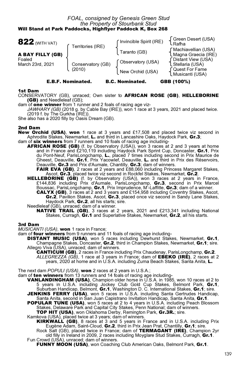 FOAL, consigned by Genesis Green Stud the Property of Stourbank Stud Will Stand at Park Paddocks, Highflyer Paddock K, Box 268 822 (WITH VAT) A BAY FILLY (GB) Foaled March 23rd, 2021 Invincible Spirit (IRE) Territories (IRE) Taranto (GB) Conservatory (GB) (2010) E.B.F. Nominated. Observatory (USA) New Orchid (USA) B.C. Nominated. Green Desert (USA) Rafha Machiavellian (USA) Magna Graecia (IRE) Distant View (USA) Stellaria (USA) Quest For Fame Musicanti (USA) GBB (100%) 1st Dam CONSERVATORY (GB), unraced; Own sister to AFRICAN ROSE (GB), HELLEBORINE (GB) and Needleleaf (GB); dam of one winner from 1 runner and 2 foals of racing age vizJAWHARY (GB) (2018 g. by Cable Bay (IRE)), won 1 race at 3 years, 2021 and placed twice. (2019 f. by The Gurkha (IRE)). She also has a 2020 filly by Oasis Dream (GB). 2nd Dam New Orchid (USA), won 1 race at 3 years and 17,508 and placed twice viz second in Aphrodite Stakes, Newmarket, L. and third in Lancashire Oaks, Haydock Park, Gr.3; dam of six winners from 7 runners and 10 foals of racing age includingAFRICAN ROSE (GB) (f. by Observatory (USA)), won 3 races at 2 and 3 years at home and in France and 210,119 including Haydock Park Sprint Cup, Doncaster, Gr.1, Prix du Pont-Neuf, ParisLongchamp, L., placed 7 times including second in Prix Maurice de Gheest, Deauville, Gr.1, Prix Yacowlef, Deauville, L. and third in Prix des Rservoirs, Deauville, Gr.3 and Prix d Aumale, Chantilly, Gr.3; dam of winners. FAIR EVA (GB), 2 races at 2 years and 88,060 including Princess Margaret Stakes, Ascot, Gr.3, placed twice viz second in Rockfel Stakes, Newmarket, Gr.2. HELLEBORINE (GB) (f. by Observatory (USA)), won 3 races at 2 years in France, 144,836 including Prix d Aumale, ParisLongchamp, Gr.3, second in Prix Marcel Boussac, ParisLongchamp, Gr.1, Prix Imprudence, M-Laffitte, Gr.3; dam of a winner. CALYX (GB), 3 races at 2 and 3 years and 154,958 including Coventry Stakes, Ascot, Gr.2, Pavilion Stakes, Ascot, Gr.3, placed once viz second in Sandy Lane Stakes, Haydock Park, Gr.2, all his starts; sire. Needleleaf (GB), unraced; dam of a winner. NATIVE TRAIL (GB), 3 races at 2 years, 2021 and 213,341 including National Stakes, Curragh, Gr.1 and Superlative Stakes, Newmarket, Gr.2, all his starts. 3rd Dam MUSICANTI (USA), won 1 race in France; dam of four winners from 9 runners and 11 foals of racing age includingDISTANT MUSIC (USA), won 5 races including Dewhurst Stakes, Newmarket, Gr.1, Champagne Stakes, Doncaster, Gr.2, third in Champion Stakes, Newmarket, Gr.1; sire. Allegro Viva (USA), unraced; dam of winners. CANTICUM (GB), 2 races in France including Prix Chaudenay, ParisLongchamp, Gr.2. ALLEGREZZA (GB), 1 race at 3 years in France; dam of EBEKO (IRE), 2 races at 2 years, 2020 at home and in U.S.A. including Zuma Beach Stakes, Santa Anita, L. The next dam POPULI (USA), won 2 races at 2 years in U.S.A.; dam of ten winners from 13 runners and 14 foals of racing age includingVANLANDINGHAM (USA), Champion older horse in U.S.A. in 1985, won 10 races at 2 to 5 years in U.S.A. including Jockey Club Gold Cup Stakes, Belmont Park, Gr.1, Suburban Handicap, Belmont, Gr.1, Washington D. C. International Stakes, Gr.1; sire. JENKINS FERRY (USA), won 5 races in U.S.A. including Santa Gertrudes Handicap, Santa Anita, second in San Juan Capistrano Invitation Handicap, Santa Anita, Gr.1. POPULAR TUNE (USA), won 5 races at 2 to 4 years in U.S.A. including Peach Blossom Stakes, Delaware Park and Capital City Stakes, Penn National; dam of winners. TOP HIT (USA), won Oklahoma Derby, Remington Park, Gr.3R.; sire. Kamkova (USA), placed twice at 3 years; dam of winners. KIRKWALL (GB), 8 races at 3 and 5 years in France and in U.S.A. including Prix Eugne Adam, Saint-Cloud, Gr.2, third in Prix Jean Prat, Chantilly, Gr.1; sire. Rock Salt (GB), placed twice in France; dam of TERMAGANT (IRE), Champion 2yr old filly in Ireland in 2009, 2 races including Moyglare Stud Stakes, Curragh, Gr.1. Fun Crowd (USA), unraced; dam of winners. FUNNY MOON (USA), won Coaching Club American Oaks, Belmont Park, Gr.1. 139