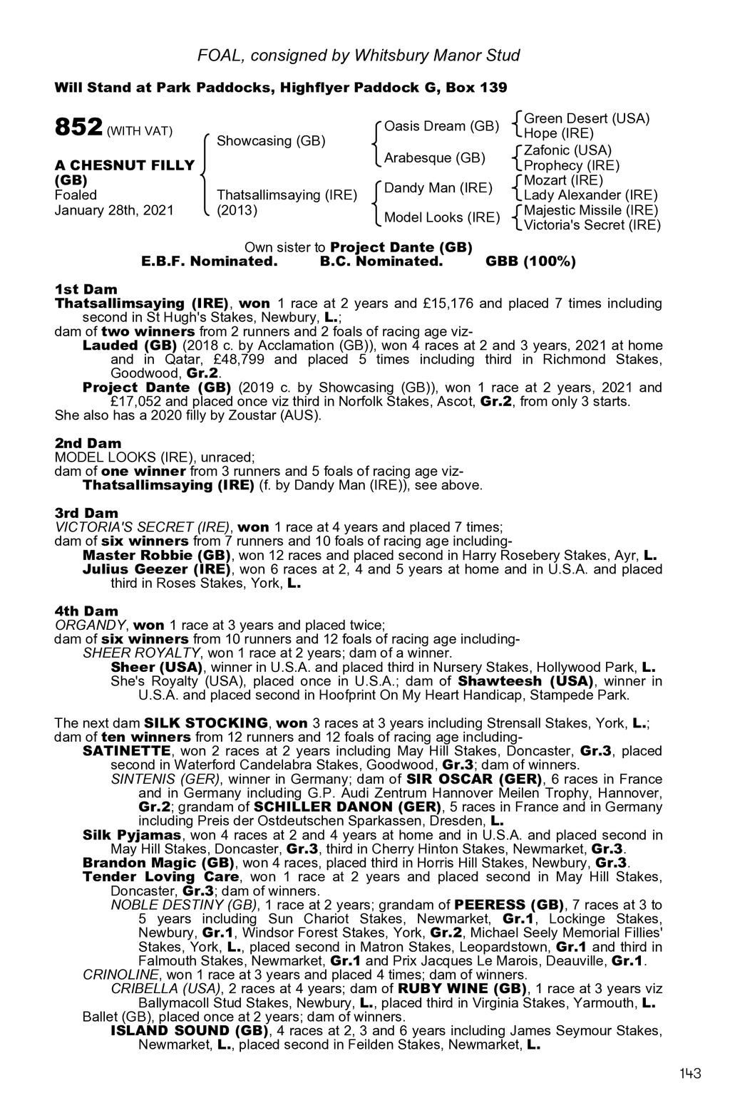 FOAL, consigned by Whitsbury Manor Stud Will Stand at Park Paddocks, Highflyer Paddock G, Box 139 852 (WITH VAT) A CHESNUT FILLY (GB) Foaled January 28th, 2021 Showcasing (GB) Thatsallimsaying (IRE) (2013) Oasis Dream (GB) Arabesque (GB) Dandy Man (IRE) Model Looks (IRE) Green Desert (USA) Hope (IRE) Zafonic (USA) Prophecy (IRE) Mozart (IRE) Lady Alexander (IRE) Majestic Missile (IRE) Victoria s Secret (IRE) Own sister to Project Dante (GB) E.B.F. Nominated. B.C. Nominated. GBB (100%) 1st Dam Thatsallimsaying (IRE), won 1 race at 2 years and 15,176 and placed 7 times including second in St Hugh s Stakes, Newbury, L.; dam of two winners from 2 runners and 2 foals of racing age vizLauded (GB) (2018 c. by Acclamation (GB)), won 4 races at 2 and 3 years, 2021 at home and in Qatar, 48,799 and placed 5 times including third in Richmond Stakes, Goodwood, Gr.2. Project Dante (GB) (2019 c. by Showcasing (GB)), won 1 race at 2 years, 2021 and 17,052 and placed once viz third in Norfolk Stakes, Ascot, Gr.2, from only 3 starts. She also has a 2020 filly by Zoustar (AUS). 2nd Dam MODEL LOOKS (IRE), unraced; dam of one winner from 3 runners and 5 foals of racing age vizThatsallimsaying (IRE) (f. by Dandy Man (IRE)), see above. 3rd Dam VICTORIA S SECRET (IRE), won 1 race at 4 years and placed 7 times; dam of six winners from 7 runners and 10 foals of racing age includingMaster Robbie (GB), won 12 races and placed second in Harry Rosebery Stakes, Ayr, L. Julius Geezer (IRE), won 6 races at 2, 4 and 5 years at home and in U.S.A. and placed third in Roses Stakes, York, L. 4th Dam ORGANDY, won 1 race at 3 years and placed twice; dam of six winners from 10 runners and 12 foals of racing age includingSHEER ROYALTY, won 1 race at 2 years; dam of a winner. Sheer (USA), winner in U.S.A. and placed third in Nursery Stakes, Hollywood Park, L. She s Royalty (USA), placed once in U.S.A.; dam of Shawteesh (USA), winner in U.S.A. and placed second in Hoofprint On My Heart Handicap, Stampede Park. The next dam SILK STOCKING, won 3 races at 3 years including Strensall Stakes, York, L.; dam of ten winners from 12 runners and 12 foals of racing age includingSATINETTE, won 2 races at 2 years including May Hill Stakes, Doncaster, Gr.3, placed second in Waterford Candelabra Stakes, Goodwood, Gr.3; dam of winners. SINTENIS (GER), winner in Germany; dam of SIR OSCAR (GER), 6 races in France and in Germany including G.P. Audi Zentrum Hannover Meilen Trophy, Hannover, Gr.2; grandam of SCHILLER DANON (GER), 5 races in France and in Germany including Preis der Ostdeutschen Sparkassen, Dresden, L. Silk Pyjamas, won 4 races at 2 and 4 years at home and in U.S.A. and placed second in May Hill Stakes, Doncaster, Gr.3, third in Cherry Hinton Stakes, Newmarket, Gr.3. Brandon Magic (GB), won 4 races, placed third in Horris Hill Stakes, Newbury, Gr.3. Tender Loving Care, won 1 race at 2 years and placed second in May Hill Stakes, Doncaster, Gr.3; dam of winners. NOBLE DESTINY (GB), 1 race at 2 years; grandam of PEERESS (GB), 7 races at 3 to 5 years including Sun Chariot Stakes, Newmarket, Gr.1, Lockinge Stakes, Newbury, Gr.1, Windsor Forest Stakes, York, Gr.2, Michael Seely Memorial Fillies Stakes, York, L., placed second in Matron Stakes, Leopardstown, Gr.1 and third in Falmouth Stakes, Newmarket, Gr.1 and Prix Jacques Le Marois, Deauville, Gr.1. CRINOLINE, won 1 race at 3 years and placed 4 times; dam of winners. CRIBELLA (USA), 2 races at 4 years; dam of RUBY WINE (GB), 1 race at 3 years viz Ballymacoll Stud Stakes, Newbury, L., placed third in Virginia Stakes, Yarmouth, L. Ballet (GB), placed once at 2 years; dam of winners. ISLAND SOUND (GB), 4 races at 2, 3 and 6 years including James Seymour Stakes, Newmarket, L., placed second in Feilden Stakes, Newmarket, L. 143