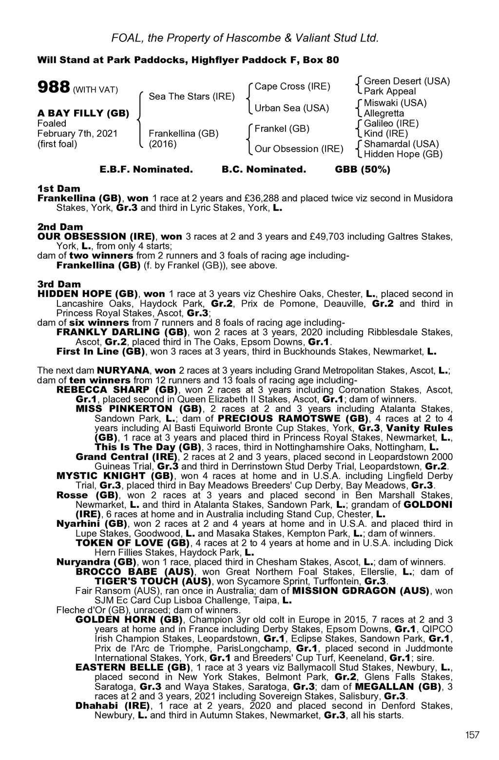 FOAL, the Property of Hascombe & Valiant Stud Ltd. Will Stand at Park Paddocks, Highflyer Paddock F, Box 80 988 (WITH VAT) A BAY FILLY (GB) Foaled February 7th, 2021 (first foal) Sea The Stars (IRE) Frankellina (GB) (2016) E.B.F. Nominated. Cape Cross (IRE) Urban Sea (USA) Frankel (GB) Our Obsession (IRE) B.C. Nominated. Green Desert (USA) Park Appeal Miswaki (USA) Allegretta Galileo (IRE) Kind (IRE) Shamardal (USA) Hidden Hope (GB) GBB (50%) 1st Dam Frankellina (GB), won 1 race at 2 years and 36,288 and placed twice viz second in Musidora Stakes, York, Gr.3 and third in Lyric Stakes, York, L. 2nd Dam OUR OBSESSION (IRE), won 3 races at 2 and 3 years and 49,703 including Galtres Stakes, York, L., from only 4 starts; dam of two winners from 2 runners and 3 foals of racing age includingFrankellina (GB) (f. by Frankel (GB)), see above. 3rd Dam HIDDEN HOPE (GB), won 1 race at 3 years viz Cheshire Oaks, Chester, L., placed second in Lancashire Oaks, Haydock Park, Gr.2, Prix de Pomone, Deauville, Gr.2 and third in Princess Royal Stakes, Ascot, Gr.3; dam of six winners from 7 runners and 8 foals of racing age includingFRANKLY DARLING (GB), won 2 races at 3 years, 2020 including Ribblesdale Stakes, Ascot, Gr.2, placed third in The Oaks, Epsom Downs, Gr.1. First In Line (GB), won 3 races at 3 years, third in Buckhounds Stakes, Newmarket, L. The next dam NURYANA, won 2 races at 3 years including Grand Metropolitan Stakes, Ascot, L.; dam of ten winners from 12 runners and 13 foals of racing age includingREBECCA SHARP (GB), won 2 races at 3 years including Coronation Stakes, Ascot, Gr.1, placed second in Queen Elizabeth II Stakes, Ascot, Gr.1; dam of winners. MISS PINKERTON (GB), 2 races at 2 and 3 years including Atalanta Stakes, Sandown Park, L.; dam of PRECIOUS RAMOTSWE (GB), 4 races at 2 to 4 years including Al Basti Equiworld Bronte Cup Stakes, York, Gr.3, Vanity Rules (GB), 1 race at 3 years and placed third in Princess Royal Stakes, Newmarket, L., This Is The Day (GB), 3 races, third in Nottinghamshire Oaks, Nottingham, L. Grand Central (IRE), 2 races at 2 and 3 years, placed second in Leopardstown 2000 Guineas Trial, Gr.3 and third in Derrinstown Stud Derby Trial, Leopardstown, Gr.2. MYSTIC KNIGHT (GB), won 4 races at home and in U.S.A. including Lingfield Derby Trial, Gr.3, placed third in Bay Meadows Breeders Cup Derby, Bay Meadows, Gr.3. Rosse (GB), won 2 races at 3 years and placed second in Ben Marshall Stakes, Newmarket, L. and third in Atalanta Stakes, Sandown Park, L.; grandam of GOLDONI (IRE), 6 races at home and in Australia including Stand Cup, Chester, L. Nyarhini (GB), won 2 races at 2 and 4 years at home and in U.S.A. and placed third in Lupe Stakes, Goodwood, L. and Masaka Stakes, Kempton Park, L.; dam of winners. TOKEN OF LOVE (GB), 4 races at 2 to 4 years at home and in U.S.A. including Dick Hern Fillies Stakes, Haydock Park, L. Nuryandra (GB), won 1 race, placed third in Chesham Stakes, Ascot, L.; dam of winners. BROCCO BABE (AUS), won Great Northern Foal Stakes, Ellerslie, L.; dam of TIGER S TOUCH (AUS), won Sycamore Sprint, Turffontein, Gr.3. Fair Ransom (AUS), ran once in Australia; dam of MISSION GDRAGON (AUS), won SJM Ec Card Cup Lisboa Challenge, Taipa, L. Fleche d Or (GB), unraced; dam of winners. GOLDEN HORN (GB), Champion 3yr old colt in Europe in 2015, 7 races at 2 and 3 years at home and in France including Derby Stakes, Epsom Downs, Gr.1, QIPCO Irish Champion Stakes, Leopardstown, Gr.1, Eclipse Stakes, Sandown Park, Gr.1, Prix de l Arc de Triomphe, ParisLongchamp, Gr.1, placed second in Juddmonte International Stakes, York, Gr.1 and Breeders Cup Turf, Keeneland, Gr.1; sire. EASTERN BELLE (GB), 1 race at 3 years viz Ballymacoll Stud Stakes, Newbury, L., placed second in New York Stakes, Belmont Park, Gr.2, Glens Falls Stakes, Saratoga, Gr.3 and Waya Stakes, Saratoga, Gr.3; dam of MEGALLAN (GB), 3 races at 2 and 3 years, 2021 including Sovereign Stakes, Salisbury, Gr.3. Dhahabi (IRE), 1 race at 2 years, 2020 and placed second in Denford Stakes, Newbury, L. and third in Autumn Stakes, Newmarket, Gr.3, all his starts. 157