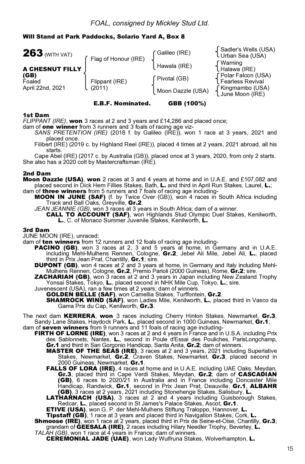 FOAL, consigned by Mickley Stud Ltd. Will Stand at Park Paddocks, Solario Yard A, Box 8 263 (WITH VAT) A CHESNUT FILLY (GB) Foaled April 22nd, 2021 Flag of Honour (IRE) Flippant (IRE) (2011) E.B.F. Nominated. Galileo (IRE) Hawala (IRE) Pivotal (GB) Moon Dazzle (USA) Sadler s Wells (USA) Urban Sea (USA) Warning Halawa (IRE) Polar Falcon (USA) Fearless Revival Kingmambo (USA) June Moon (IRE) GBB (100%) 1st Dam FLIPPANT (IRE), won 3 races at 2 and 3 years and 14,286 and placed once; dam of one winner from 3 runners and 3 foals of racing age vizSANS PRETENTION (IRE) (2018 f. by Galileo (IRE)), won 1 race at 3 years, 2021 and placed once. Filibert (IRE) (2019 c. by Highland Reel (IRE)), placed 4 times at 2 years, 2021 abroad, all his starts. Cape Abel (IRE) (2017 c. by Australia (GB)), placed once at 3 years, 2020, from only 2 starts. She also has a 2020 colt by Mastercraftsman (IRE). 2nd Dam Moon Dazzle (USA), won 2 races at 3 and 4 years at home and in U.A.E. and 107,082 and placed second in Dick Hern Fillies Stakes, Bath, L. and third in April Run Stakes, Laurel, L.; dam of three winners from 5 runners and 7 foals of racing age includingMOON IN JUNE (SAF) (f. by Twice Over (GB)), won 4 races in South Africa including Track and Ball Oaks, Greyville, Gr.2. JEAN JEANNIE (GB), won 3 races at 3 years in South Africa; dam of a winner. CALL TO ACCOUNT (SAF), won Highlands Stud Olympic Duel Stakes, Kenilworth, L., C. of Monaco Summer Juvenile Stakes, Kenilworth, L. 3rd Dam JUNE MOON (IRE), unraced; dam of ten winners from 12 runners and 12 foals of racing age includingPACINO (GB), won 3 races at 2, 3 and 5 years at home, in Germany and in U.A.E. including Mehl-Mulhens Rennen, Cologne, Gr.2, Jebel Ali Mile, Jebel Ali, L., placed third in Prix Jean Prat, Chantilly, Gr.1; sire. DUPONT (GB), won 4 races at 2 and 3 years at home, in Germany and Italy including MehlMulhens Rennen, Cologne, Gr.2, Premio Parioli (2000 Guineas), Rome, Gr.2; sire. ZACHARIAH (GB), won 3 races at 2 and 3 years in Japan including New Zealand Trophy Yonsai Stakes, Tokyo, L., placed second in NHK Mile Cup, Tokyo, L.; sire. Juvenescent (USA), ran a few times at 2 years; dam of winners. GOLDEN BELLE (SAF), won Camellia Stakes, Turffontein, Gr.2. SHAMROCK WIND (SAF), won Ladies Mile, Kenilworth, L., placed third in Vasco da Gama Prix du Cap, Kenilworth, Gr.3. The next dam KERRERA, won 3 races including Cherry Hinton Stakes, Newmarket, Gr.3, Sandy Lane Stakes, Haydock Park, L., placed second in 1000 Guineas, Newmarket, Gr.1; dam of seven winners from 9 runners and 11 foals of racing age includingFIRTH OF LORNE (IRE), won 3 races at 2 and 4 years in France and in U.S.A. including Prix des Sablonnets, Nantes, L., second in Poule d Essai des Pouliches, ParisLongchamp, Gr.1 and third in San Gorgonio Handicap, Santa Anita, Gr.2; dam of winners. MASTER OF THE SEAS (IRE), 3 races at 2 and 3 years, 2021 including Superlative Stakes, Newmarket, Gr.2, Craven Stakes, Newmarket, Gr.3, placed second in 2000 Guineas, Newmarket, Gr.1. FALLS OF LORA (IRE), 4 races at home and in U.A.E. including UAE Oaks, Meydan, Gr.3, placed third in Cape Verdi Stakes, Meydan, Gr.2; dam of CASCADIAN (GB), 6 races to 2020/21 in Australia and in France including Doncaster Mile Handicap, Randwick, Gr.1, second in Prix Jean Prat, Deauville, Gr.1, ALBAHR (GB), 3 races at 2 years, 2021 including Stonehenge Stakes, Salisbury, L. LATHARNACH (USA), 3 races at 2 and 4 years including Guisborough Stakes, Redcar, L., placed second in St James s Palace Stakes, Ascot, Gr.1. ETIVE (USA), won G. P. der Mehl-Mulhens Stiftung Traloppo, Hannover, L. Tipstaff (GB), 1 race at 3 years and placed third in Navigation Stakes, Cork, L. Shmoose (IRE), won 1 race at 2 years, placed third in Prix de Seine-et-Oise, Chantilly, Gr.3; grandam of GEESALA (IRE), 2 races including Hilary Needler Trophy, Beverley, L. TALAH (GB), won 1 race at 4 years in France; dam of winners. CEREMONIAL JADE (UAE), won Lady Wulfruna Stakes, Wolverhampton, L. 15