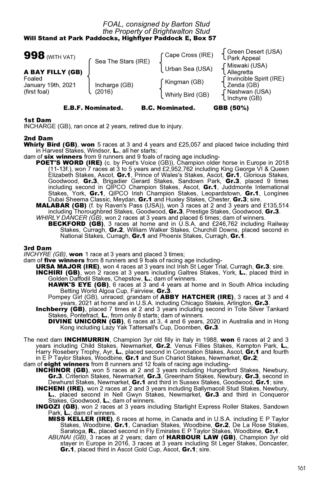 FOAL, consigned by Barton Stud the Property of Brightwalton Stud Will Stand at Park Paddocks, Highflyer Paddock E, Box 57 998 (WITH VAT) A BAY FILLY (GB) Foaled January 19th, 2021 (first foal) Sea The Stars (IRE) Incharge (GB) (2016) E.B.F. Nominated. Cape Cross (IRE) Urban Sea (USA) Kingman (GB) Whirly Bird (GB) B.C. Nominated. Green Desert (USA) Park Appeal Miswaki (USA) Allegretta Invincible Spirit (IRE) Zenda (GB) Nashwan (USA) Inchyre (GB) GBB (50%) 1st Dam INCHARGE (GB), ran once at 2 years, retired due to injury. 2nd Dam Whirly Bird (GB), won 5 races at 3 and 4 years and 25,057 and placed twice including third in Harvest Stakes, Windsor, L., all her starts; dam of six winners from 9 runners and 9 foals of racing age includingPOET S WORD (IRE) (c. by Poet s Voice (GB)), Champion older horse in Europe in 2018 (11-13f.), won 7 races at 3 to 5 years and 2,952,762 including King George VI & Queen Elizabeth Stakes, Ascot, Gr.1, Prince of Wales s Stakes, Ascot, Gr.1, Glorious Stakes, Goodwood, Gr.3, Brigadier Gerard Stakes, Sandown Park, Gr.3, placed 9 times including second in QIPCO Champion Stakes, Ascot, Gr.1, Juddmonte International Stakes, York, Gr.1, QIPCO Irish Champion Stakes, Leopardstown, Gr.1, Longines Dubai Sheema Classic, Meydan, Gr.1 and Huxley Stakes, Chester, Gr.3; sire. MALABAR (GB) (f. by Raven s Pass (USA)), won 3 races at 2 and 3 years and 135,514 including Thoroughbred Stakes, Goodwood, Gr.3, Prestige Stakes, Goodwood, Gr.3. WHIRLY DANCER (GB), won 2 races at 3 years and placed 6 times; dam of winners. BECKFORD (GB), 3 races at home and in U.S.A. and 246,762 including Railway Stakes, Curragh, Gr.2, William Walker Stakes, Churchill Downs, placed second in National Stakes, Curragh, Gr.1 and Phoenix Stakes, Curragh, Gr.1. 3rd Dam INCHYRE (GB), won 1 race at 3 years and placed 3 times; dam of five winners from 8 runners and 9 foals of racing age includingURSA MAJOR (IRE), won 4 races at 3 years incl Irish St Leger Trial, Curragh, Gr.3; sire. INCHIRI (GB), won 2 races at 3 years including Galtres Stakes, York, L., placed third in Golden Daffodil Stakes, Chepstow, L.; dam of winners. HAWK S EYE (GB), 6 races at 3 and 4 years at home and in South Africa including Betting World Algoa Cup, Fairview, Gr.3. Pompey Girl (GB), unraced; grandam of ABBY HATCHER (IRE), 3 races at 3 and 4 years, 2021 at home and in U.S.A. including Chicago Stakes, Arlington, Gr.3. Inchberry (GB), placed 7 times at 2 and 3 years including second in Tote Silver Tankard Stakes, Pontefract, L., from only 8 starts; dam of winners. DIVINE UNICORN (GB), 6 races at 3, 4 and 6 years, 2020 in Australia and in Hong Kong including Lazy Yak Tattersall s Cup, Doomben, Gr.3. The next dam INCHMURRIN, Champion 3yr old filly in Italy in 1988, won 6 races at 2 and 3 years including Child Stakes, Newmarket, Gr.2, Venus Fillies Stakes, Kempton Park, L., Harry Rosebery Trophy, Ayr, L., placed second in Coronation Stakes, Ascot, Gr.1 and fourth in E P Taylor Stakes, Woodbine, Gr.1 and Sun Chariot Stakes, Newmarket, Gr.2; dam of eight winners from 8 runners and 12 foals of racing age includingINCHINOR (GB), won 5 races at 2 and 3 years including Hungerford Stakes, Newbury, Gr.3, Criterion Stakes, Newmarket, Gr.3, Greenham Stakes, Newbury, Gr.3, second in Dewhurst Stakes, Newmarket, Gr.1 and third in Sussex Stakes, Goodwood, Gr.1; sire. INCHENI (IRE), won 2 races at 2 and 3 years including Ballymacoll Stud Stakes, Newbury, L., placed second in Nell Gwyn Stakes, Newmarket, Gr.3 and third in Conqueror Stakes, Goodwood, L.; dam of winners. INGOZI (GB), won 2 races at 3 years including Starlight Express Roller Stakes, Sandown Park, L.; dam of winners. MISS KELLER (IRE), 6 races at home, in Canada and in U.S.A. including E P Taylor Stakes, Woodbine, Gr.1, Canadian Stakes, Woodbine, Gr.2, De La Rose Stakes, Saratoga, R., placed second in Fly Emirates E P Taylor Stakes, Woodbine, Gr.1. ABUNAI (GB), 3 races at 2 years; dam of HARBOUR LAW (GB), Champion 3yr old stayer in Europe in 2016, 3 races at 3 years including St Leger Stakes, Doncaster, Gr.1, placed third in Ascot Gold Cup, Ascot, Gr.1; sire. 161