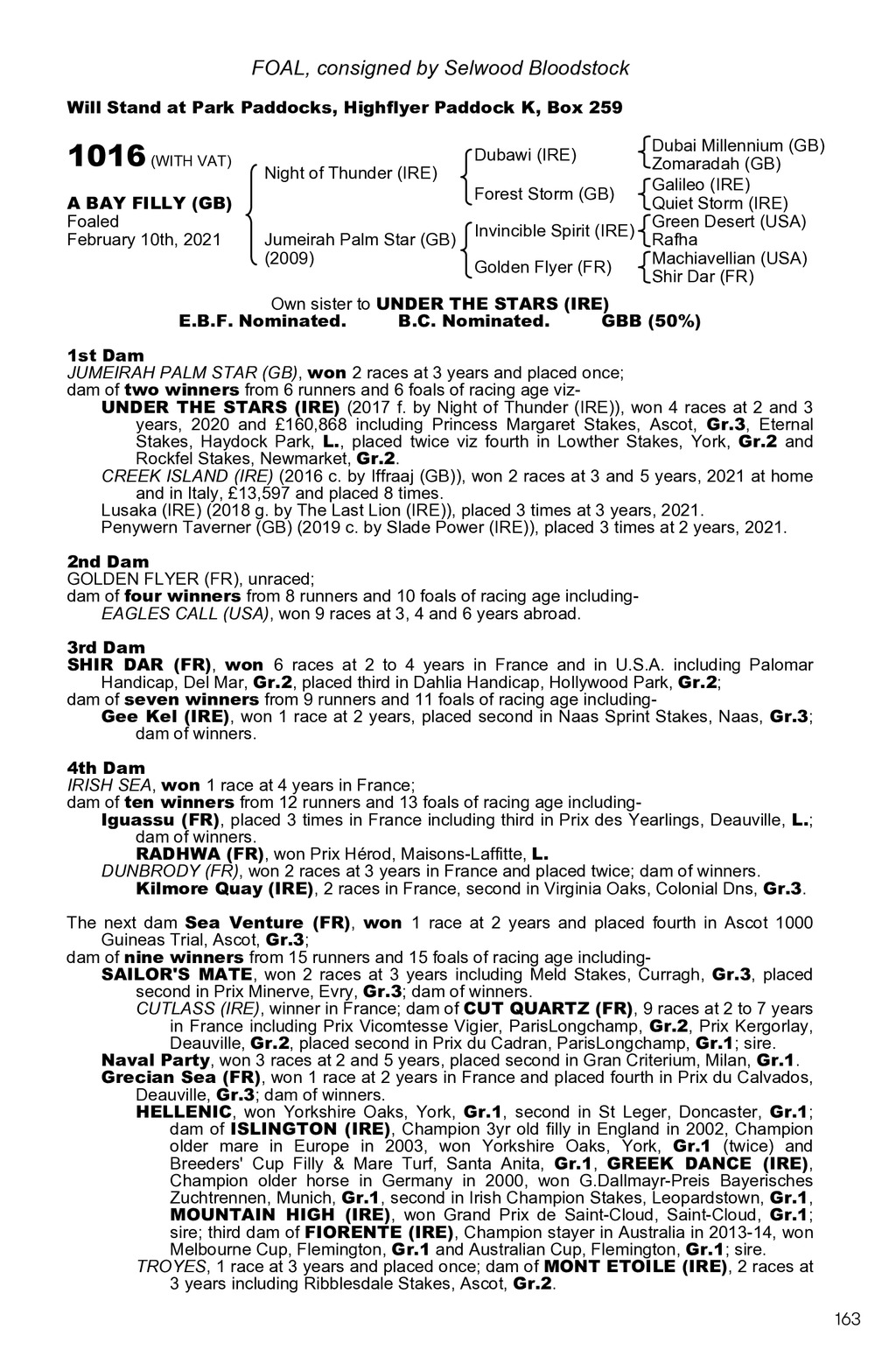 FOAL, consigned by Selwood Bloodstock Will Stand at Park Paddocks, Highflyer Paddock K, Box 259 1016 (WITH VAT) A BAY FILLY (GB) Foaled February 10th, 2021 Night of Thunder (IRE) Jumeirah Palm Star (GB) (2009) Dubawi (IRE) Forest Storm (GB) Invincible Spirit (IRE) Golden Flyer (FR) Dubai Millennium (GB) Zomaradah (GB) Galileo (IRE) Quiet Storm (IRE) Green Desert (USA) Rafha Machiavellian (USA) Shir Dar (FR) Own sister to UNDER THE STARS (IRE) E.B.F. Nominated. B.C. Nominated. GBB (50%) 1st Dam JUMEIRAH PALM STAR (GB), won 2 races at 3 years and placed once; dam of two winners from 6 runners and 6 foals of racing age vizUNDER THE STARS (IRE) (2017 f. by Night of Thunder (IRE)), won 4 races at 2 and 3 years, 2020 and 160,868 including Princess Margaret Stakes, Ascot, Gr.3, Eternal Stakes, Haydock Park, L., placed twice viz fourth in Lowther Stakes, York, Gr.2 and Rockfel Stakes, Newmarket, Gr.2. CREEK ISLAND (IRE) (2016 c. by Iffraaj (GB)), won 2 races at 3 and 5 years, 2021 at home and in Italy, 13,597 and placed 8 times. Lusaka (IRE) (2018 g. by The Last Lion (IRE)), placed 3 times at 3 years, 2021. Penywern Taverner (GB) (2019 c. by Slade Power (IRE)), placed 3 times at 2 years, 2021. 2nd Dam GOLDEN FLYER (FR), unraced; dam of four winners from 8 runners and 10 foals of racing age includingEAGLES CALL (USA), won 9 races at 3, 4 and 6 years abroad. 3rd Dam SHIR DAR (FR), won 6 races at 2 to 4 years in France and in U.S.A. including Palomar Handicap, Del Mar, Gr.2, placed third in Dahlia Handicap, Hollywood Park, Gr.2; dam of seven winners from 9 runners and 11 foals of racing age includingGee Kel (IRE), won 1 race at 2 years, placed second in Naas Sprint Stakes, Naas, Gr.3; dam of winners. 4th Dam IRISH SEA, won 1 race at 4 years in France; dam of ten winners from 12 runners and 13 foals of racing age includingIguassu (FR), placed 3 times in France including third in Prix des Yearlings, Deauville, L.; dam of winners. RADHWA (FR), won Prix Hrod, Maisons-Laffitte, L. DUNBRODY (FR), won 2 races at 3 years in France and placed twice; dam of winners. Kilmore Quay (IRE), 2 races in France, second in Virginia Oaks, Colonial Dns, Gr.3. The next dam Sea Venture (FR), won 1 race at 2 years and placed fourth in Ascot 1000 Guineas Trial, Ascot, Gr.3; dam of nine winners from 15 runners and 15 foals of racing age includingSAILOR S MATE, won 2 races at 3 years including Meld Stakes, Curragh, Gr.3, placed second in Prix Minerve, Evry, Gr.3; dam of winners. CUTLASS (IRE), winner in France; dam of CUT QUARTZ (FR), 9 races at 2 to 7 years in France including Prix Vicomtesse Vigier, ParisLongchamp, Gr.2, Prix Kergorlay, Deauville, Gr.2, placed second in Prix du Cadran, ParisLongchamp, Gr.1; sire. Naval Party, won 3 races at 2 and 5 years, placed second in Gran Criterium, Milan, Gr.1. Grecian Sea (FR), won 1 race at 2 years in France and placed fourth in Prix du Calvados, Deauville, Gr.3; dam of winners. HELLENIC, won Yorkshire Oaks, York, Gr.1, second in St Leger, Doncaster, Gr.1; dam of ISLINGTON (IRE), Champion 3yr old filly in England in 2002, Champion older mare in Europe in 2003, won Yorkshire Oaks, York, Gr.1 (twice) and Breeders Cup Filly & Mare Turf, Santa Anita, Gr.1, GREEK DANCE (IRE), Champion older horse in Germany in 2000, won G.Dallmayr-Preis Bayerisches Zuchtrennen, Munich, Gr.1, second in Irish Champion Stakes, Leopardstown, Gr.1, MOUNTAIN HIGH (IRE), won Grand Prix de Saint-Cloud, Saint-Cloud, Gr.1; sire; third dam of FIORENTE (IRE), Champion stayer in Australia in 2013-14, won Melbourne Cup, Flemington, Gr.1 and Australian Cup, Flemington, Gr.1; sire. TROYES, 1 race at 3 years and placed once; dam of MONT ETOILE (IRE), 2 races at 3 years including Ribblesdale Stakes, Ascot, Gr.2. 163