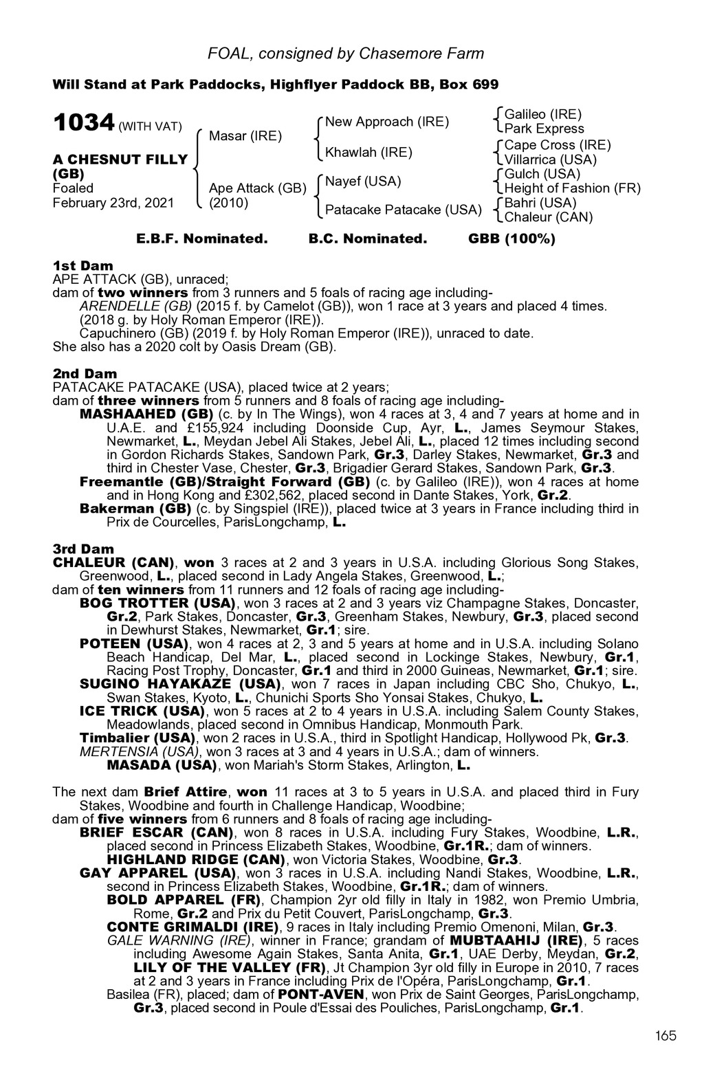 FOAL, consigned by Chasemore Farm Will Stand at Park Paddocks, Highflyer Paddock BB, Box 699 1034 (WITH VAT) A CHESNUT FILLY (GB) Foaled February 23rd, 2021 Masar (IRE) Ape Attack (GB) (2010) E.B.F. Nominated. New Approach (IRE) Khawlah (IRE) Nayef (USA) Patacake Patacake (USA) B.C. Nominated. Galileo (IRE) Park Express Cape Cross (IRE) Villarrica (USA) Gulch (USA) Height of Fashion (FR) Bahri (USA) Chaleur (CAN) GBB (100%) 1st Dam APE ATTACK (GB), unraced; dam of two winners from 3 runners and 5 foals of racing age includingARENDELLE (GB) (2015 f. by Camelot (GB)), won 1 race at 3 years and placed 4 times. (2018 g. by Holy Roman Emperor (IRE)). Capuchinero (GB) (2019 f. by Holy Roman Emperor (IRE)), unraced to date. She also has a 2020 colt by Oasis Dream (GB). 2nd Dam PATACAKE PATACAKE (USA), placed twice at 2 years; dam of three winners from 5 runners and 8 foals of racing age includingMASHAAHED (GB) (c. by In The Wings), won 4 races at 3, 4 and 7 years at home and in U.A.E. and 155,924 including Doonside Cup, Ayr, L., James Seymour Stakes, Newmarket, L., Meydan Jebel Ali Stakes, Jebel Ali, L., placed 12 times including second in Gordon Richards Stakes, Sandown Park, Gr.3, Darley Stakes, Newmarket, Gr.3 and third in Chester Vase, Chester, Gr.3, Brigadier Gerard Stakes, Sandown Park, Gr.3. Freemantle (GB)/Straight Forward (GB) (c. by Galileo (IRE)), won 4 races at home and in Hong Kong and 302,562, placed second in Dante Stakes, York, Gr.2. Bakerman (GB) (c. by Singspiel (IRE)), placed twice at 3 years in France including third in Prix de Courcelles, ParisLongchamp, L. 3rd Dam CHALEUR (CAN), won 3 races at 2 and 3 years in U.S.A. including Glorious Song Stakes, Greenwood, L., placed second in Lady Angela Stakes, Greenwood, L.; dam of ten winners from 11 runners and 12 foals of racing age includingBOG TROTTER (USA), won 3 races at 2 and 3 years viz Champagne Stakes, Doncaster, Gr.2, Park Stakes, Doncaster, Gr.3, Greenham Stakes, Newbury, Gr.3, placed second in Dewhurst Stakes, Newmarket, Gr.1; sire. POTEEN (USA), won 4 races at 2, 3 and 5 years at home and in U.S.A. including Solano Beach Handicap, Del Mar, L., placed second in Lockinge Stakes, Newbury, Gr.1, Racing Post Trophy, Doncaster, Gr.1 and third in 2000 Guineas, Newmarket, Gr.1; sire. SUGINO HAYAKAZE (USA), won 7 races in Japan including CBC Sho, Chukyo, L., Swan Stakes, Kyoto, L., Chunichi Sports Sho Yonsai Stakes, Chukyo, L. ICE TRICK (USA), won 5 races at 2 to 4 years in U.S.A. including Salem County Stakes, Meadowlands, placed second in Omnibus Handicap, Monmouth Park. Timbalier (USA), won 2 races in U.S.A., third in Spotlight Handicap, Hollywood Pk, Gr.3. MERTENSIA (USA), won 3 races at 3 and 4 years in U.S.A.; dam of winners. MASADA (USA), won Mariah s Storm Stakes, Arlington, L. The next dam Brief Attire, won 11 races at 3 to 5 years in U.S.A. and placed third in Fury Stakes, Woodbine and fourth in Challenge Handicap, Woodbine; dam of five winners from 6 runners and 8 foals of racing age includingBRIEF ESCAR (CAN), won 8 races in U.S.A. including Fury Stakes, Woodbine, L.R., placed second in Princess Elizabeth Stakes, Woodbine, Gr.1R.; dam of winners. HIGHLAND RIDGE (CAN), won Victoria Stakes, Woodbine, Gr.3. GAY APPAREL (USA), won 3 races in U.S.A. including Nandi Stakes, Woodbine, L.R., second in Princess Elizabeth Stakes, Woodbine, Gr.1R.; dam of winners. BOLD APPAREL (FR), Champion 2yr old filly in Italy in 1982, won Premio Umbria, Rome, Gr.2 and Prix du Petit Couvert, ParisLongchamp, Gr.3. CONTE GRIMALDI (IRE), 9 races in Italy including Premio Omenoni, Milan, Gr.3. GALE WARNING (IRE), winner in France; grandam of MUBTAAHIJ (IRE), 5 races including Awesome Again Stakes, Santa Anita, Gr.1, UAE Derby, Meydan, Gr.2, LILY OF THE VALLEY (FR), Jt Champion 3yr old filly in Europe in 2010, 7 races at 2 and 3 years in France including Prix de l Opra, ParisLongchamp, Gr.1. Basilea (FR), placed; dam of PONT-AVEN, won Prix de Saint Georges, ParisLongchamp, Gr.3, placed second in Poule d Essai des Pouliches, ParisLongchamp, Gr.1. 165
