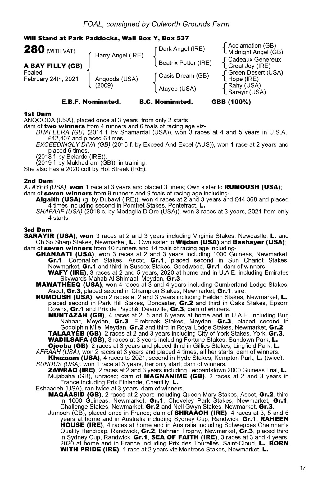 FOAL, consigned by Culworth Grounds Farm Will Stand at Park Paddocks, Wall Box Y, Box 537 280 (WITH VAT) A BAY FILLY (GB) Foaled February 24th, 2021 Harry Angel (IRE) Anqooda (USA) (2009) E.B.F. Nominated. Dark Angel (IRE) Beatrix Potter (IRE) Oasis Dream (GB) Atayeb (USA) B.C. Nominated. Acclamation (GB) Midnight Angel (GB) Cadeaux Genereux Great Joy (IRE) Green Desert (USA) Hope (IRE) Rahy (USA) Sarayir (USA) GBB (100%) 1st Dam ANQOODA (USA), placed once at 3 years, from only 2 starts; dam of two winners from 4 runners and 6 foals of racing age vizDHAFEERA (GB) (2014 f. by Shamardal (USA)), won 3 races at 4 and 5 years in U.S.A., 42,407 and placed 6 times. EXCEEDINGLY DIVA (GB) (2015 f. by Exceed And Excel (AUS)), won 1 race at 2 years and placed 6 times. (2018 f. by Belardo (IRE)). (2019 f. by Mukhadram (GB)), in training. She also has a 2020 colt by Hot Streak (IRE). 2nd Dam ATAYEB (USA), won 1 race at 3 years and placed 3 times; Own sister to RUMOUSH (USA); dam of seven winners from 9 runners and 9 foals of racing age includingAlgaith (USA) (g. by Dubawi (IRE)), won 4 races at 2 and 3 years and 44,368 and placed 4 times including second in Pomfret Stakes, Pontefract, L. SHAFAAF (USA) (2018 c. by Medaglia DOro (USA)), won 3 races at 3 years, 2021 from only 4 starts. 3rd Dam SARAYIR (USA), won 3 races at 2 and 3 years including Virginia Stakes, Newcastle, L. and Oh So Sharp Stakes, Newmarket, L.; Own sister to Wijdan (USA) and Bashayer (USA); dam of seven winners from 10 runners and 14 foals of racing age includingGHANAATI (USA), won 3 races at 2 and 3 years including 1000 Guineas, Newmarket, Gr.1, Coronation Stakes, Ascot, Gr.1, placed second in Sun Chariot Stakes, Newmarket, Gr.1 and third in Sussex Stakes, Goodwood, Gr.1; dam of winners. WAFY (IRE), 3 races at 2 and 5 years, 2020 at home and in U.A.E. including Emirates Skywards Mahab Al Shimaal, Meydan, Gr.3. MAWATHEEQ (USA), won 4 races at 3 and 4 years including Cumberland Lodge Stakes, Ascot, Gr.3, placed second in Champion Stakes, Newmarket, Gr.1; sire. RUMOUSH (USA), won 2 races at 2 and 3 years including Feilden Stakes, Newmarket, L., placed second in Park Hill Stakes, Doncaster, Gr.2 and third in Oaks Stakes, Epsom Downs, Gr.1 and Prix de Psych, Deauville, Gr.3; dam of winners. MUNTAZAH (GB), 4 races at 2, 5 and 6 years at home and in U.A.E. including Burj Nahaar, Meydan, Gr.3, Firebreak Stakes, Meydan, Gr.3, placed second in Godolphin Mile, Meydan, Gr.2 and third in Royal Lodge Stakes, Newmarket, Gr.2. TALAAYEB (GB), 2 races at 2 and 3 years including City of York Stakes, York, Gr.3. WADILSAFA (GB), 3 races at 3 years including Fortune Stakes, Sandown Park, L. Ojooba (GB), 2 races at 3 years and placed third in Gillies Stakes, Lingfield Park, L. AFRAAH (USA), won 2 races at 3 years and placed 4 times, all her starts; dam of winners. Khuzaam (USA), 4 races to 2021, second in Hyde Stakes, Kempton Park, L. (twice). SUNDUS (USA), won 1 race at 3 years, her only start; dam of winners. ZAWRAQ (IRE), 2 races at 2 and 3 years including Leopardstown 2000 Guineas Trial, L. Mujabaha (GB), unraced; dam of MAGNANIME (GB), 2 races at 2 and 3 years in France including Prix Finlande, Chantilly, L. Eshaadeh (USA), ran twice at 3 years; dam of winners. MAQAASID (GB), 2 races at 2 years including Queen Mary Stakes, Ascot, Gr.2, third in 1000 Guineas, Newmarket, Gr.1, Cheveley Park Stakes, Newmarket, Gr.1, Challenge Stakes, Newmarket, Gr.2 and Nell Gwyn Stakes, Newmarket, Gr.3. Jumooh (GB), placed once in France; dam of SHRAAOH (IRE), 4 races at 3, 5 and 6 years at home and in Australia including Sydney Cup, Randwick, Gr.1, RAHEEN HOUSE (IRE), 4 races at home and in Australia including Schweppes Chairman s Quality Handicap, Randwick, Gr.2, Bahrain Trophy, Newmarket, Gr.3, placed third in Sydney Cup, Randwick, Gr.1, SEA OF FAITH (IRE), 3 races at 3 and 4 years, 2020 at home and in France including Prix des Tourelles, Saint-Cloud, L., BORN WITH PRIDE (IRE), 1 race at 2 years viz Montrose Stakes, Newmarket, L. 17