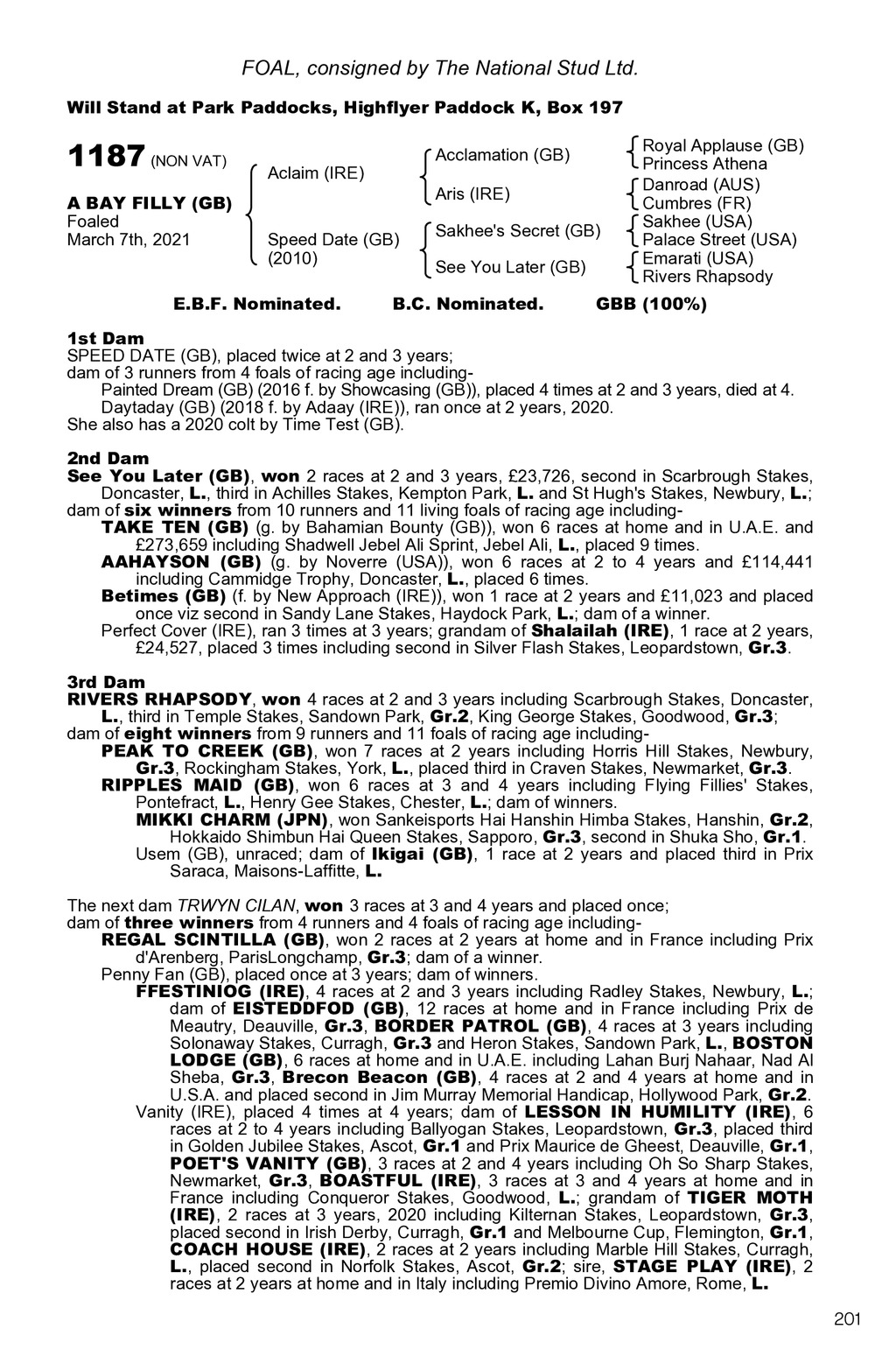 FOAL, consigned by The National Stud Ltd. Will Stand at Park Paddocks, Highflyer Paddock K, Box 197 1187 (NON VAT) A BAY FILLY (GB) Foaled March 7th, 2021 Acclamation (GB) Aclaim (IRE) Aris (IRE) Speed Date (GB) (2010) E.B.F. Nominated. Sakhee s Secret (GB) See You Later (GB) B.C. Nominated. Royal Applause (GB) Princess Athena Danroad (AUS) Cumbres (FR) Sakhee (USA) Palace Street (USA) Emarati (USA) Rivers Rhapsody GBB (100%) 1st Dam SPEED DATE (GB), placed twice at 2 and 3 years; dam of 3 runners from 4 foals of racing age includingPainted Dream (GB) (2016 f. by Showcasing (GB)), placed 4 times at 2 and 3 years, died at 4. Daytaday (GB) (2018 f. by Adaay (IRE)), ran once at 2 years, 2020. She also has a 2020 colt by Time Test (GB). 2nd Dam See You Later (GB), won 2 races at 2 and 3 years, 23,726, second in Scarbrough Stakes, Doncaster, L., third in Achilles Stakes, Kempton Park, L. and St Hugh s Stakes, Newbury, L.; dam of six winners from 10 runners and 11 living foals of racing age includingTAKE TEN (GB) (g. by Bahamian Bounty (GB)), won 6 races at home and in U.A.E. and 273,659 including Shadwell Jebel Ali Sprint, Jebel Ali, L., placed 9 times. AAHAYSON (GB) (g. by Noverre (USA)), won 6 races at 2 to 4 years and 114,441 including Cammidge Trophy, Doncaster, L., placed 6 times. Betimes (GB) (f. by New Approach (IRE)), won 1 race at 2 years and 11,023 and placed once viz second in Sandy Lane Stakes, Haydock Park, L.; dam of a winner. Perfect Cover (IRE), ran 3 times at 3 years; grandam of Shalailah (IRE), 1 race at 2 years, 24,527, placed 3 times including second in Silver Flash Stakes, Leopardstown, Gr.3. 3rd Dam RIVERS RHAPSODY, won 4 races at 2 and 3 years including Scarbrough Stakes, Doncaster, L., third in Temple Stakes, Sandown Park, Gr.2, King George Stakes, Goodwood, Gr.3; dam of eight winners from 9 runners and 11 foals of racing age includingPEAK TO CREEK (GB), won 7 races at 2 years including Horris Hill Stakes, Newbury, Gr.3, Rockingham Stakes, York, L., placed third in Craven Stakes, Newmarket, Gr.3. RIPPLES MAID (GB), won 6 races at 3 and 4 years including Flying Fillies Stakes, Pontefract, L., Henry Gee Stakes, Chester, L.; dam of winners. MIKKI CHARM (JPN), won Sankeisports Hai Hanshin Himba Stakes, Hanshin, Gr.2, Hokkaido Shimbun Hai Queen Stakes, Sapporo, Gr.3, second in Shuka Sho, Gr.1. Usem (GB), unraced; dam of Ikigai (GB), 1 race at 2 years and placed third in Prix Saraca, Maisons-Laffitte, L. The next dam TRWYN CILAN, won 3 races at 3 and 4 years and placed once; dam of three winners from 4 runners and 4 foals of racing age includingREGAL SCINTILLA (GB), won 2 races at 2 years at home and in France including Prix d Arenberg, ParisLongchamp, Gr.3; dam of a winner. Penny Fan (GB), placed once at 3 years; dam of winners. FFESTINIOG (IRE), 4 races at 2 and 3 years including Radley Stakes, Newbury, L.; dam of EISTEDDFOD (GB), 12 races at home and in France including Prix de Meautry, Deauville, Gr.3, BORDER PATROL (GB), 4 races at 3 years including Solonaway Stakes, Curragh, Gr.3 and Heron Stakes, Sandown Park, L., BOSTON LODGE (GB), 6 races at home and in U.A.E. including Lahan Burj Nahaar, Nad Al Sheba, Gr.3, Brecon Beacon (GB), 4 races at 2 and 4 years at home and in U.S.A. and placed second in Jim Murray Memorial Handicap, Hollywood Park, Gr.2. Vanity (IRE), placed 4 times at 4 years; dam of LESSON IN HUMILITY (IRE), 6 races at 2 to 4 years including Ballyogan Stakes, Leopardstown, Gr.3, placed third in Golden Jubilee Stakes, Ascot, Gr.1 and Prix Maurice de Gheest, Deauville, Gr.1, POET S VANITY (GB), 3 races at 2 and 4 years including Oh So Sharp Stakes, Newmarket, Gr.3, BOASTFUL (IRE), 3 races at 3 and 4 years at home and in France including Conqueror Stakes, Goodwood, L.; grandam of TIGER MOTH (IRE), 2 races at 3 years, 2020 including Kilternan Stakes, Leopardstown, Gr.3, placed second in Irish Derby, Curragh, Gr.1 and Melbourne Cup, Flemington, Gr.1, COACH HOUSE (IRE), 2 races at 2 years including Marble Hill Stakes, Curragh, L., placed second in Norfolk Stakes, Ascot, Gr.2; sire, STAGE PLAY (IRE), 2 races at 2 years at home and in Italy including Premio Divino Amore, Rome, L. 201
