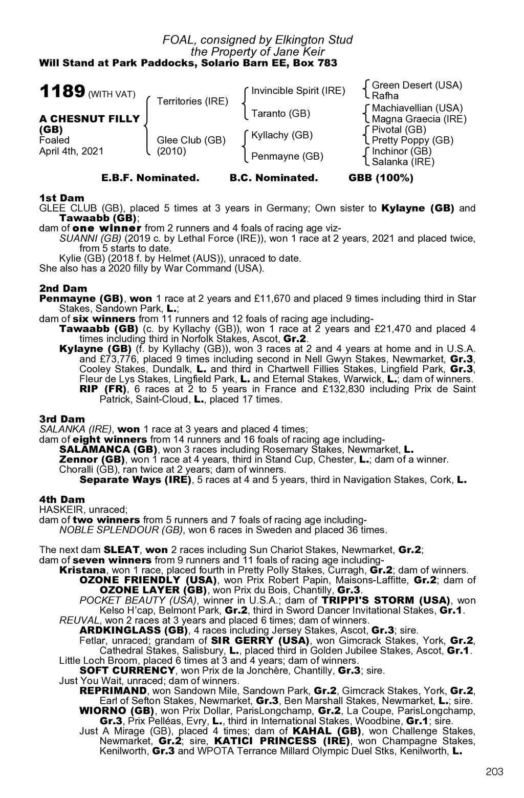 FOAL, consigned by Elkington Stud the Property of Jane Keir Will Stand at Park Paddocks, Solario Barn EE, Box 783 1189 (WITH VAT) A CHESNUT FILLY (GB) Foaled April 4th, 2021 Territories (IRE) Glee Club (GB) (2010) E.B.F. Nominated. Invincible Spirit (IRE) Taranto (GB) Kyllachy (GB) Penmayne (GB) B.C. Nominated. Green Desert (USA) Rafha Machiavellian (USA) Magna Graecia (IRE) Pivotal (GB) Pretty Poppy (GB) Inchinor (GB) Salanka (IRE) GBB (100%) 1st Dam GLEE CLUB (GB), placed 5 times at 3 years in Germany; Own sister to Kylayne (GB) and Tawaabb (GB); dam of o n e w i n n e r from 2 runners and 4 foals of racing age vizSUANNI (GB) (2019 c. by Lethal Force (IRE)), won 1 race at 2 years, 2021 and placed twice, from 5 starts to date. Kylie (GB) (2018 f. by Helmet (AUS)), unraced to date. She also has a 2020 filly by War Command (USA). 2nd Dam Penmayne (GB), won 1 race at 2 years and 11,670 and placed 9 times including third in Star Stakes, Sandown Park, L.; dam of six winners from 11 runners and 12 foals of racing age includingTawaabb (GB) (c. by Kyllachy (GB)), won 1 race at 2 years and 21,470 and placed 4 times including third in Norfolk Stakes, Ascot, Gr.2. Kylayne (GB) (f. by Kyllachy (GB)), won 3 races at 2 and 4 years at home and in U.S.A. and 73,776, placed 9 times including second in Nell Gwyn Stakes, Newmarket, Gr.3, Cooley Stakes, Dundalk, L. and third in Chartwell Fillies Stakes, Lingfield Park, Gr.3, Fleur de Lys Stakes, Lingfield Park, L. and Eternal Stakes, Warwick, L.; dam of winners. RIP (FR), 6 races at 2 to 5 years in France and 132,830 including Prix de Saint Patrick, Saint-Cloud, L., placed 17 times. 3rd Dam SALANKA (IRE), won 1 race at 3 years and placed 4 times; dam of eight winners from 14 runners and 16 foals of racing age includingSALAMANCA (GB), won 3 races including Rosemary Stakes, Newmarket, L. Zennor (GB), won 1 race at 4 years, third in Stand Cup, Chester, L.; dam of a winner. Choralli (GB), ran twice at 2 years; dam of winners. Separate Ways (IRE), 5 races at 4 and 5 years, third in Navigation Stakes, Cork, L. 4th Dam HASKEIR, unraced; dam of two winners from 5 runners and 7 foals of racing age includingNOBLE SPLENDOUR (GB), won 6 races in Sweden and placed 36 times. The next dam SLEAT, won 2 races including Sun Chariot Stakes, Newmarket, Gr.2; dam of seven winners from 9 runners and 11 foals of racing age includingKristana, won 1 race, placed fourth in Pretty Polly Stakes, Curragh, Gr.2; dam of winners. OZONE FRIENDLY (USA), won Prix Robert Papin, Maisons-Laffitte, Gr.2; dam of OZONE LAYER (GB), won Prix du Bois, Chantilly, Gr.3. POCKET BEAUTY (USA), winner in U.S.A.; dam of TRIPPI S STORM (USA), won Kelso Hcap, Belmont Park, Gr.2, third in Sword Dancer Invitational Stakes, Gr.1. REUVAL, won 2 races at 3 years and placed 6 times; dam of winners. ARDKINGLASS (GB), 4 races including Jersey Stakes, Ascot, Gr.3; sire. Fetlar, unraced; grandam of SIR GERRY (USA), won Gimcrack Stakes, York, Gr.2, Cathedral Stakes, Salisbury, L., placed third in Golden Jubilee Stakes, Ascot, Gr.1. Little Loch Broom, placed 6 times at 3 and 4 years; dam of winners. SOFT CURRENCY, won Prix de la Jonchre, Chantilly, Gr.3; sire. Just You Wait, unraced; dam of winners. REPRIMAND, won Sandown Mile, Sandown Park, Gr.2, Gimcrack Stakes, York, Gr.2, Earl of Sefton Stakes, Newmarket, Gr.3, Ben Marshall Stakes, Newmarket, L.; sire. WIORNO (GB), won Prix Dollar, ParisLongchamp, Gr.2, La Coupe, ParisLongchamp, Gr.3, Prix Pellas, Evry, L., third in International Stakes, Woodbine, Gr.1; sire. Just A Mirage (GB), placed 4 times; dam of KAHAL (GB), won Challenge Stakes, Newmarket, Gr.2; sire, KATICI PRINCESS (IRE), won Champagne Stakes, Kenilworth, Gr.3 and WPOTA Terrance Millard Olympic Duel Stks, Kenilworth, L. 203